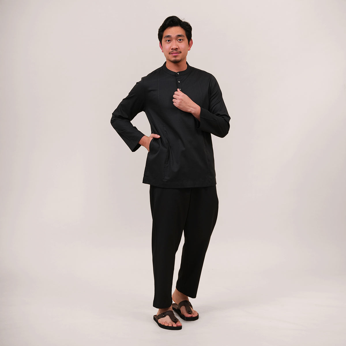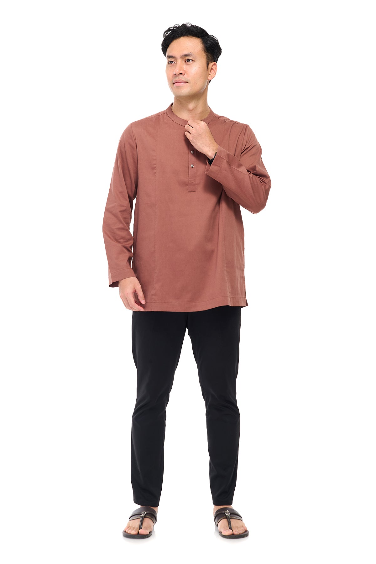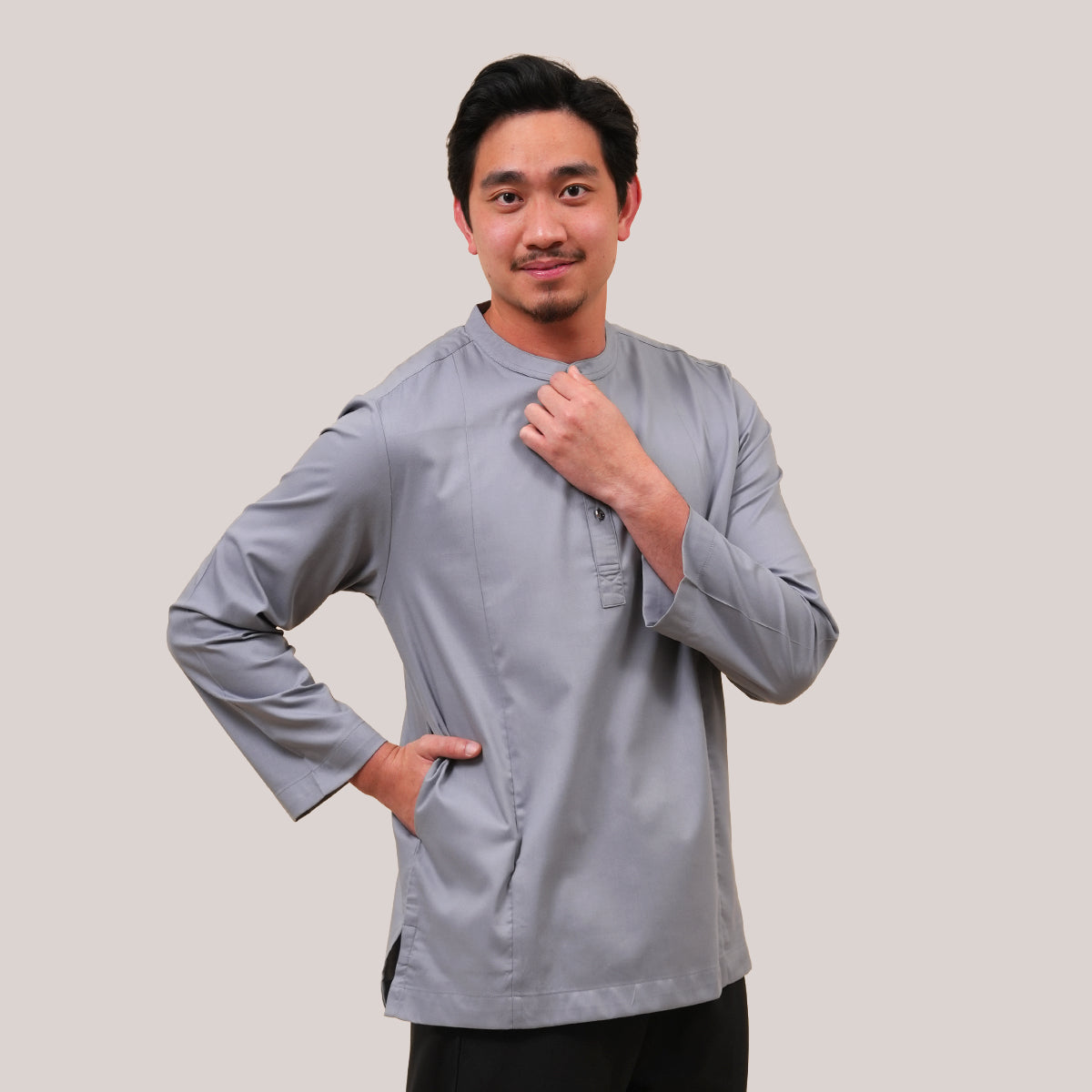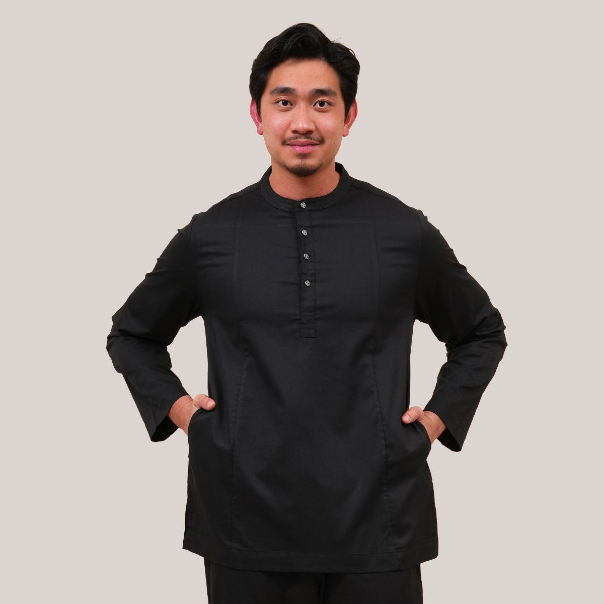 Combining traditional Malay heritage with a modern touch features a classic cekak musang collar and a button arrangement inspired by the baju Melayu. This long-sleeved top is designed for both religious worship and formal occasions, offering a modest silhouette that does not emphasize body shape while ensuring maximum comfort through its side pockets and side slits. The name "Anas," which means "friendliness" in Arabic, perfectly reflects the approachable and versatile nature of this design. Now available in a fresh range of new colors, it serves as a practical yet sophisticated staple for the contemporary man's wardrobe.