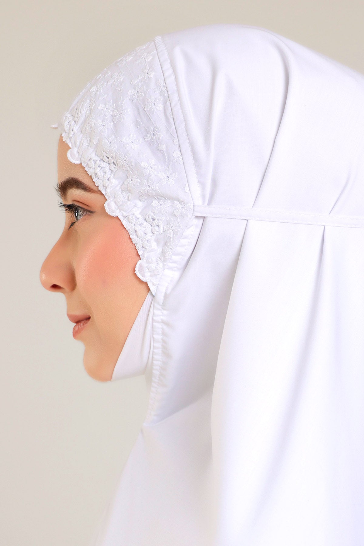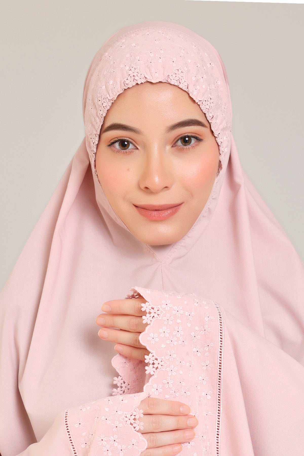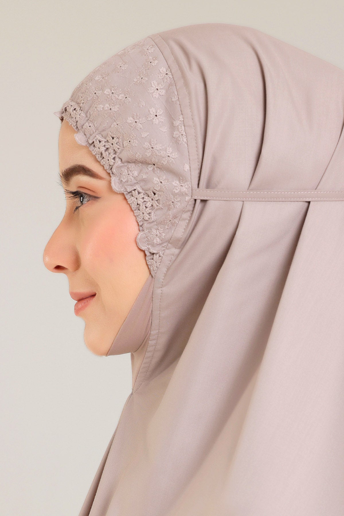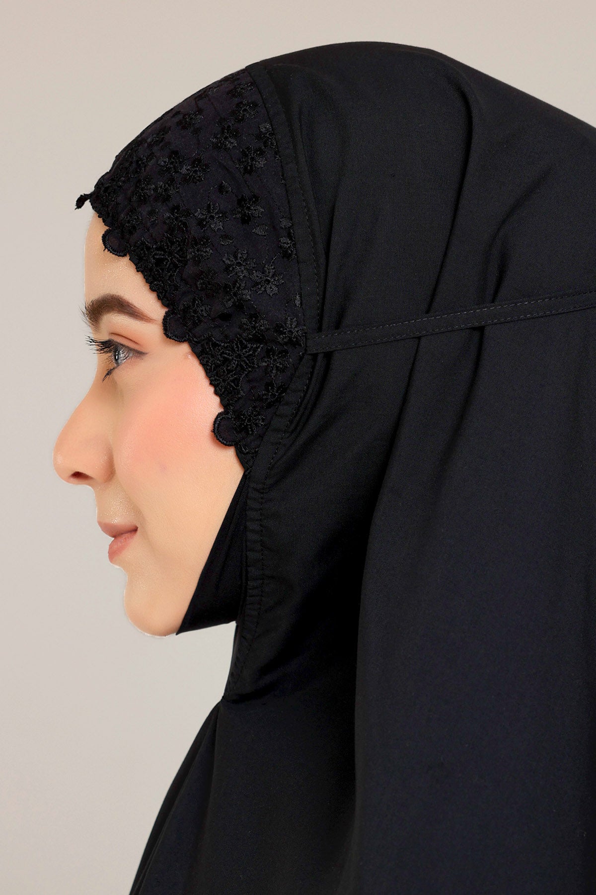 Crafted from the cool and breathable KUF fabric, this collection features intricate cherry blossom embroidery on a combination of cotton and guipure lace. The lace design mimics flowers blooming on a branch. Offering two face-look options, it is designed for durability, UV protection, and modesty, resisting wrinkles and fading while providing full aurat coverage with its non-see-through fabric.