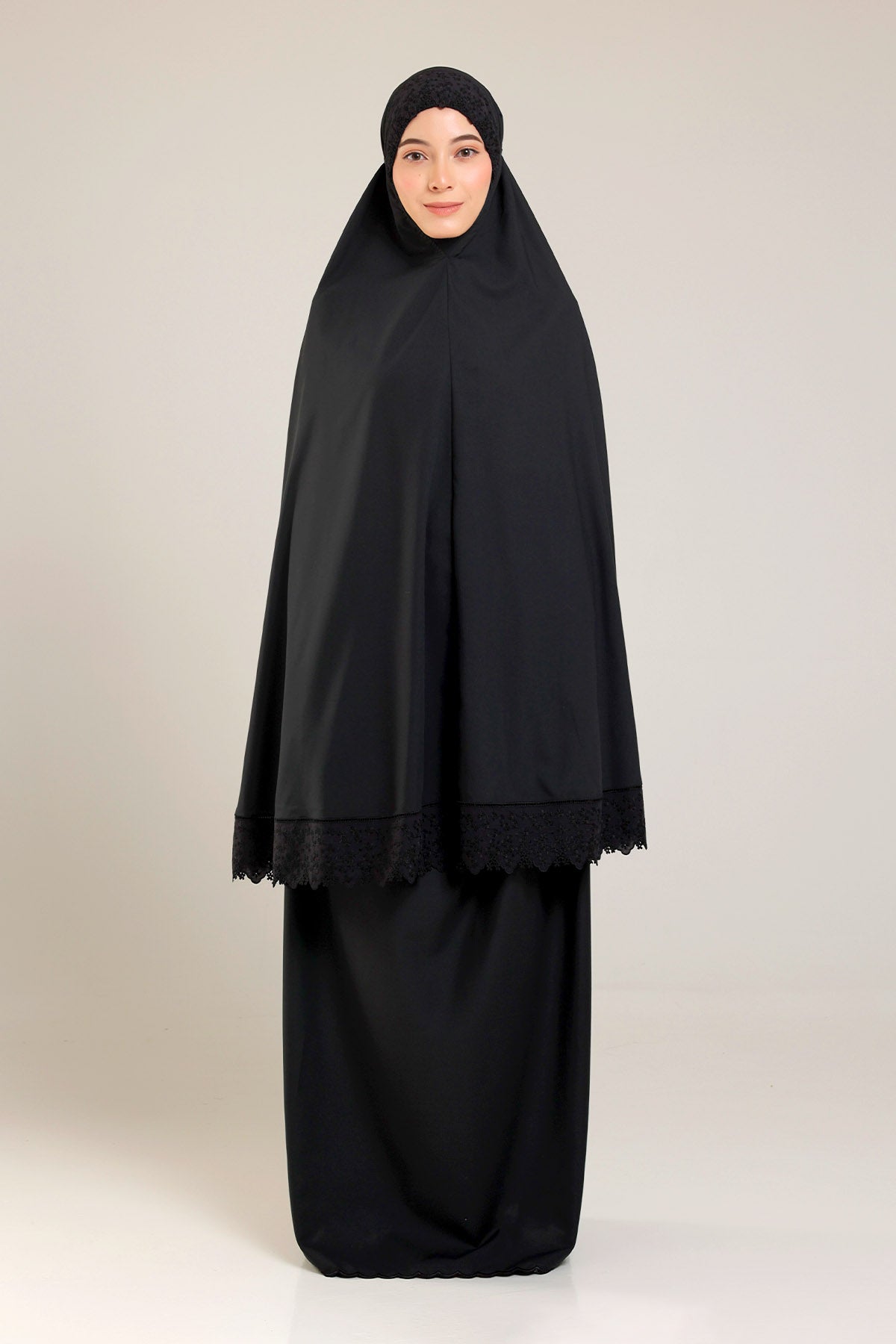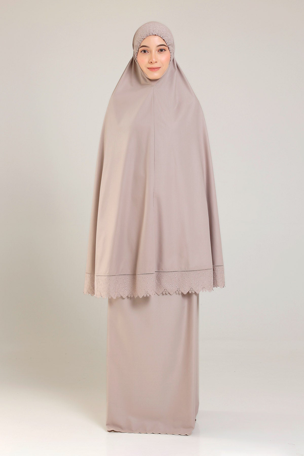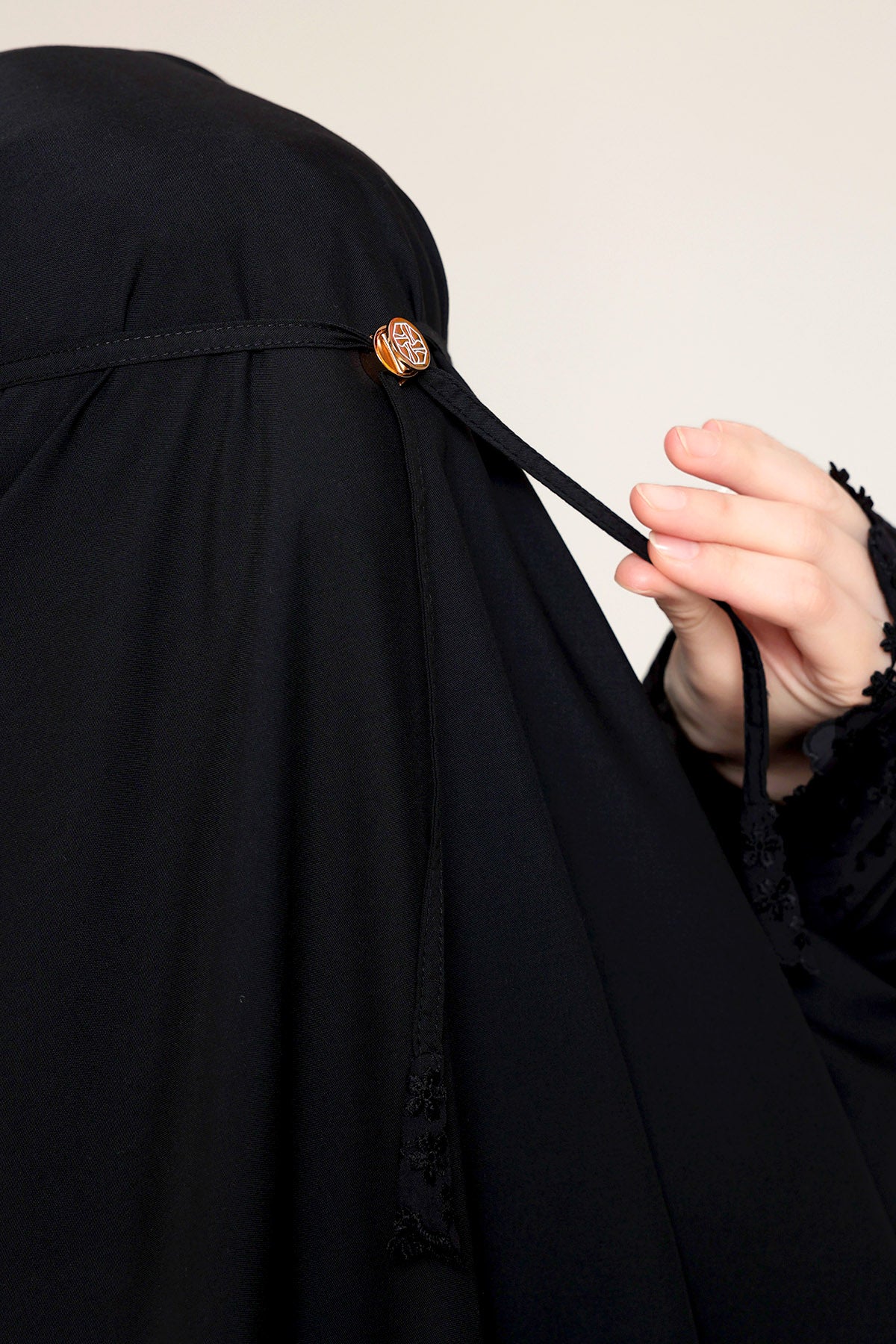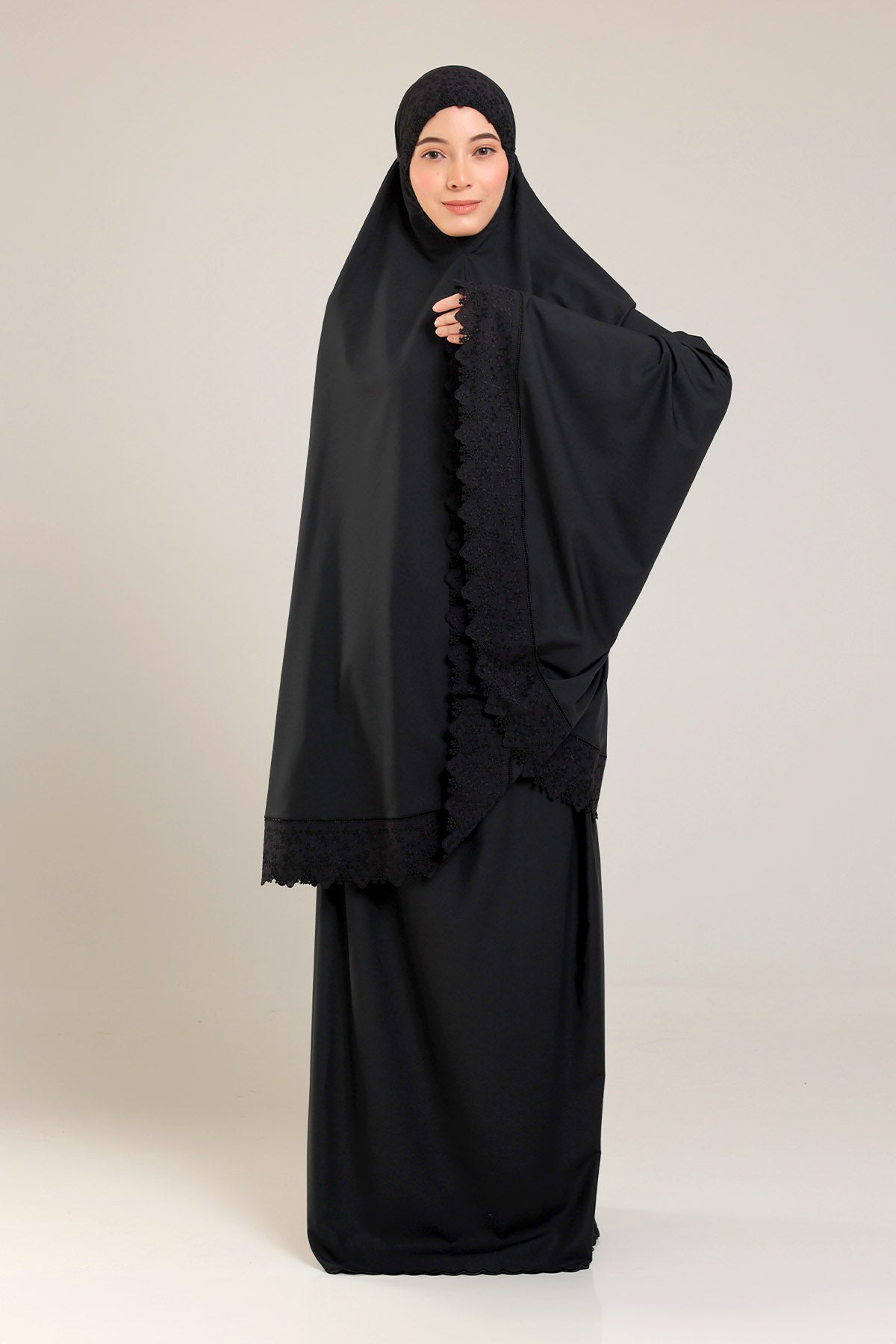 Crafted from the cool and breathable KUF fabric, this collection features intricate cherry blossom embroidery on a combination of cotton and guipure lace. The lace design mimics flowers blooming on a branch. Offering two face-look options, it is designed for durability, UV protection, and modesty, resisting wrinkles and fading while providing full aurat coverage with its non-see-through fabric.
