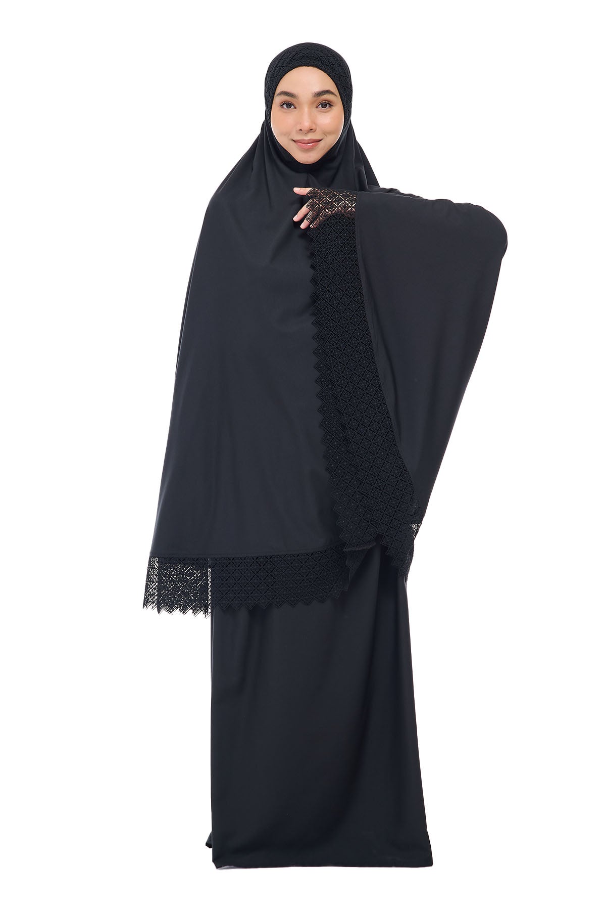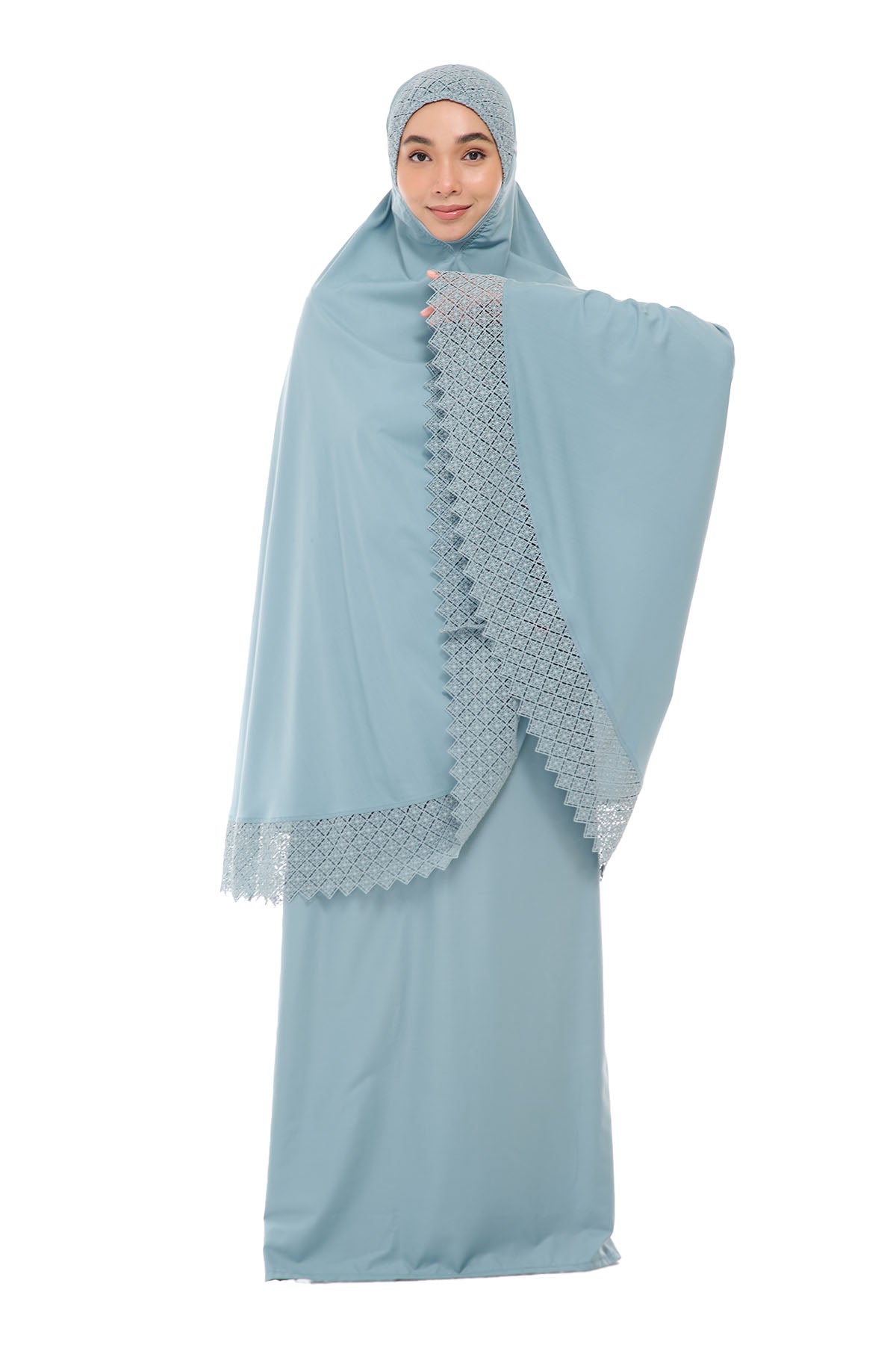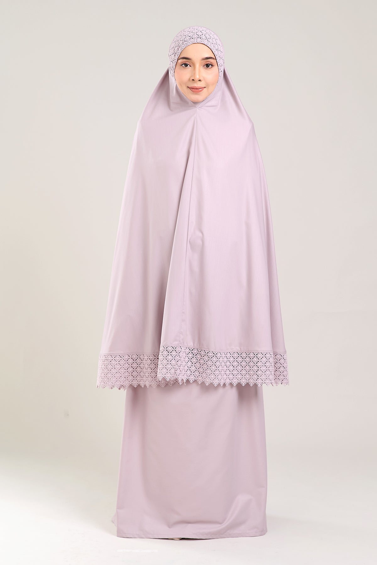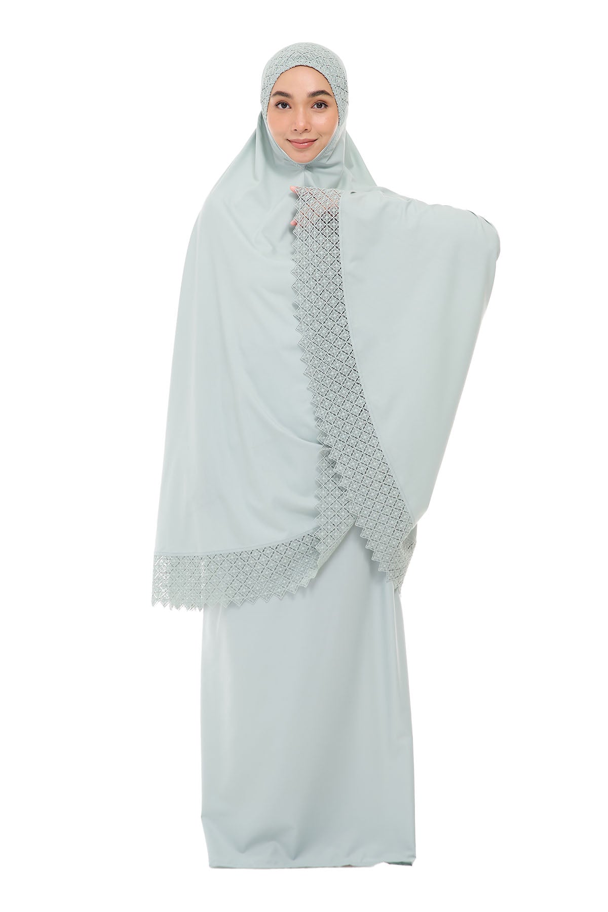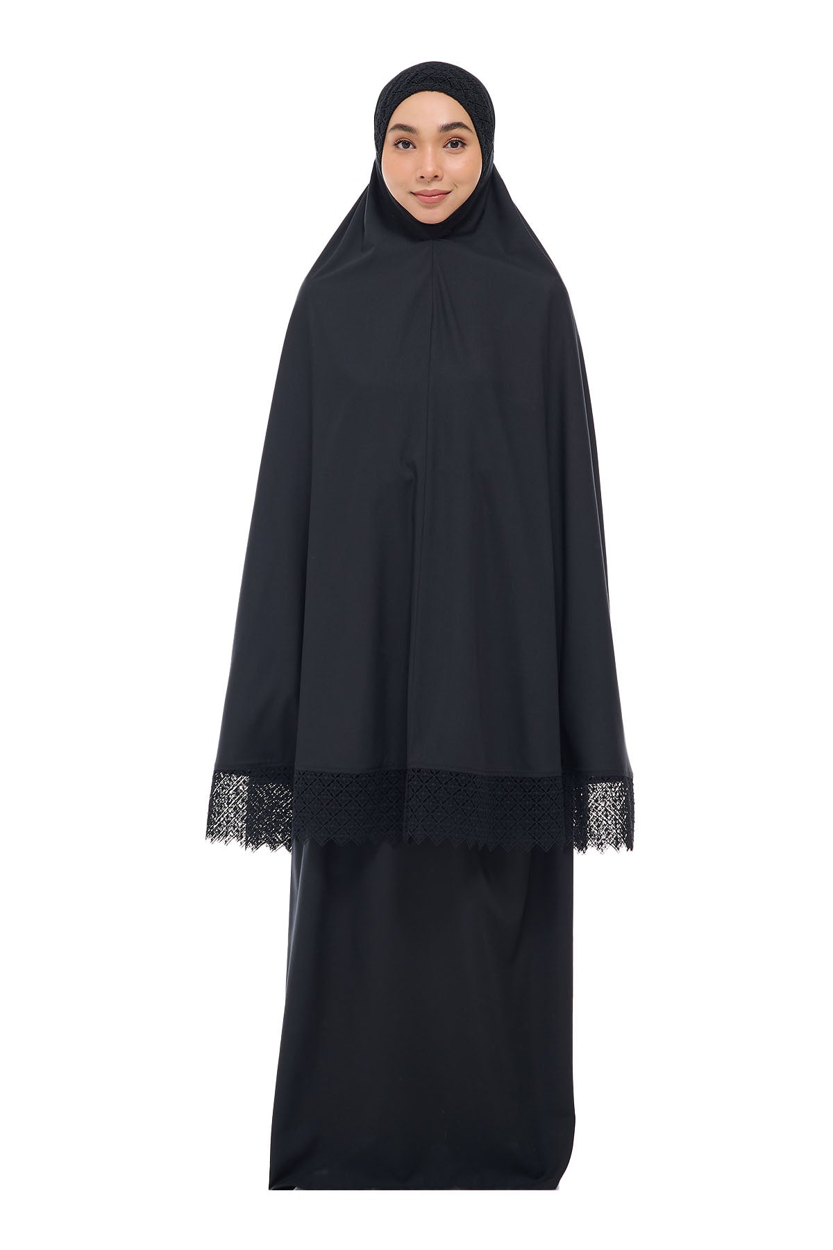 Crafted from the reputable KUF/KUF+ fabric, this telekung ensures ventilation, durability, quick drying, and a soft skin feel. The detailed and durable khadura lace, inspired by Asanoha's geometry sets it apart. Matching designs for adults and kids allow for coordination, and its UV protection makes it the ideal choice for protective prayer sessions. Available in Classic and Harmony facelook, it also comes in midi size, and a separate option includes an adjustable-length jupe skirt.