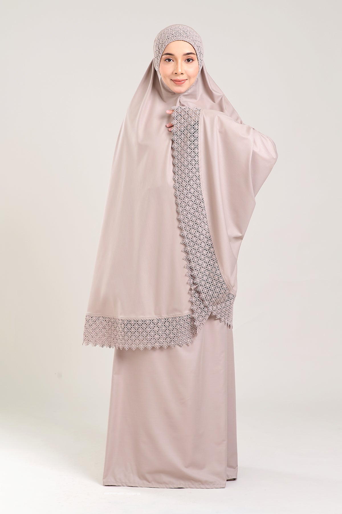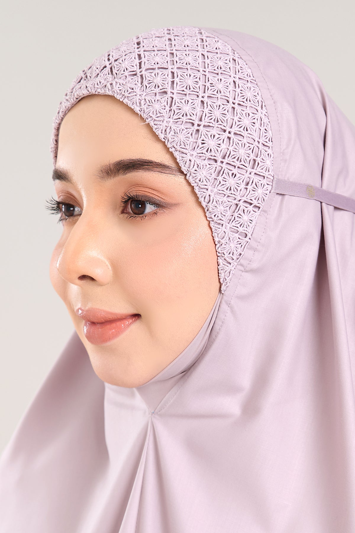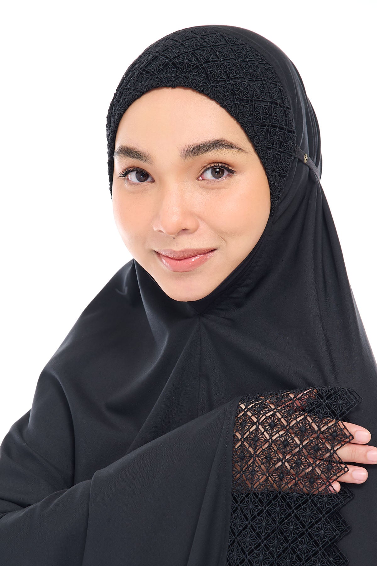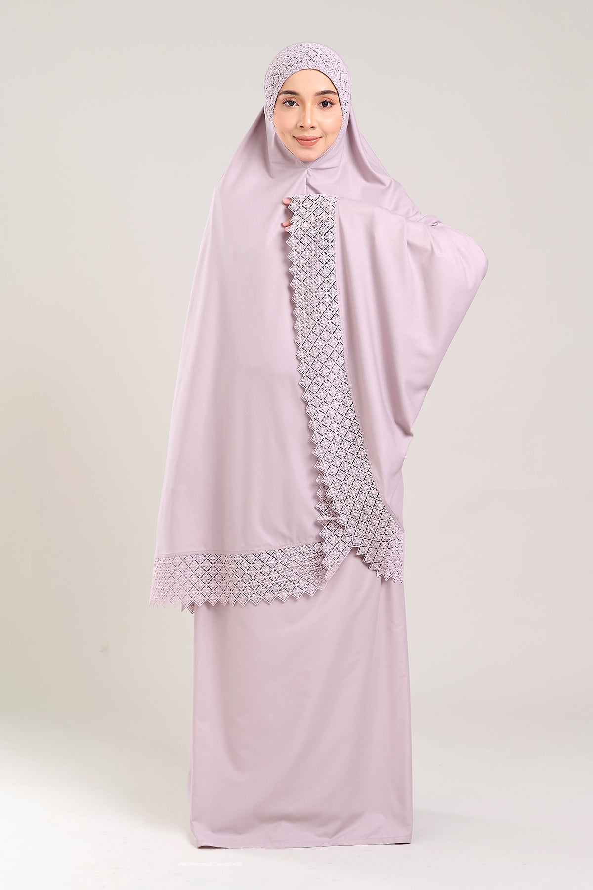 Crafted from the reputable KUF/KUF+ fabric, this telekung ensures ventilation, durability, quick drying, and a soft skin feel. The detailed and durable khadura lace, inspired by Asanoha's geometry sets it apart. Matching designs for adults and kids allow for coordination, and its UV protection makes it the ideal choice for protective prayer sessions. Available in Classic and Harmony facelook, it also comes in midi size, and a separate option includes an adjustable-length jupe skirt.