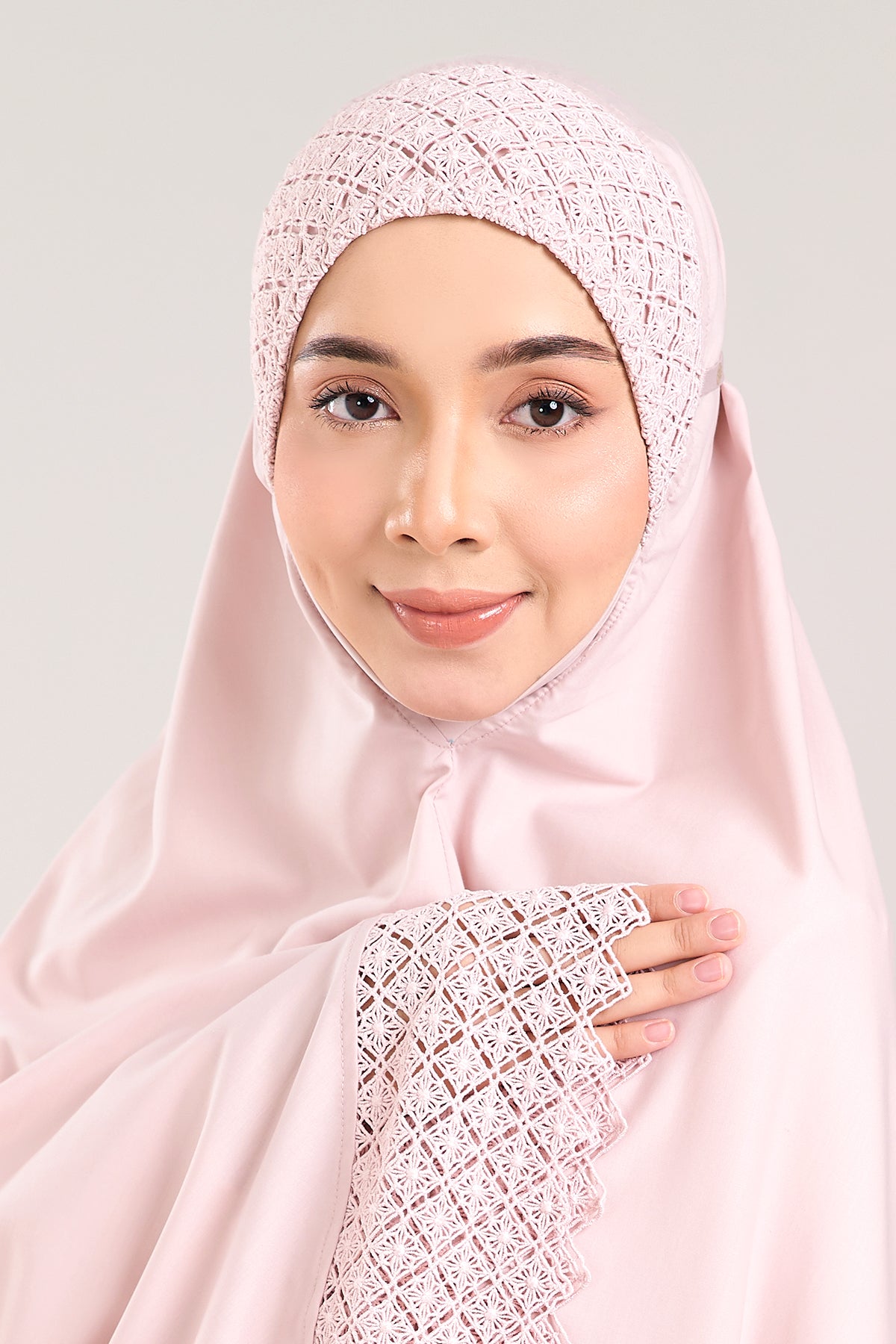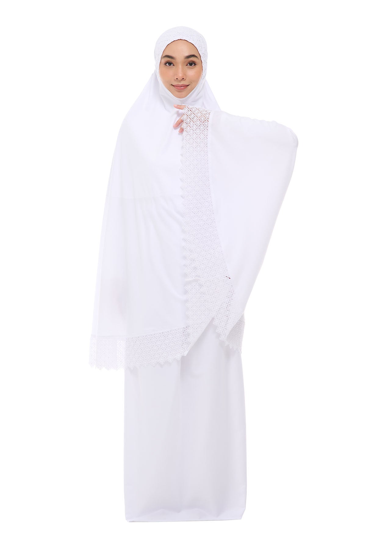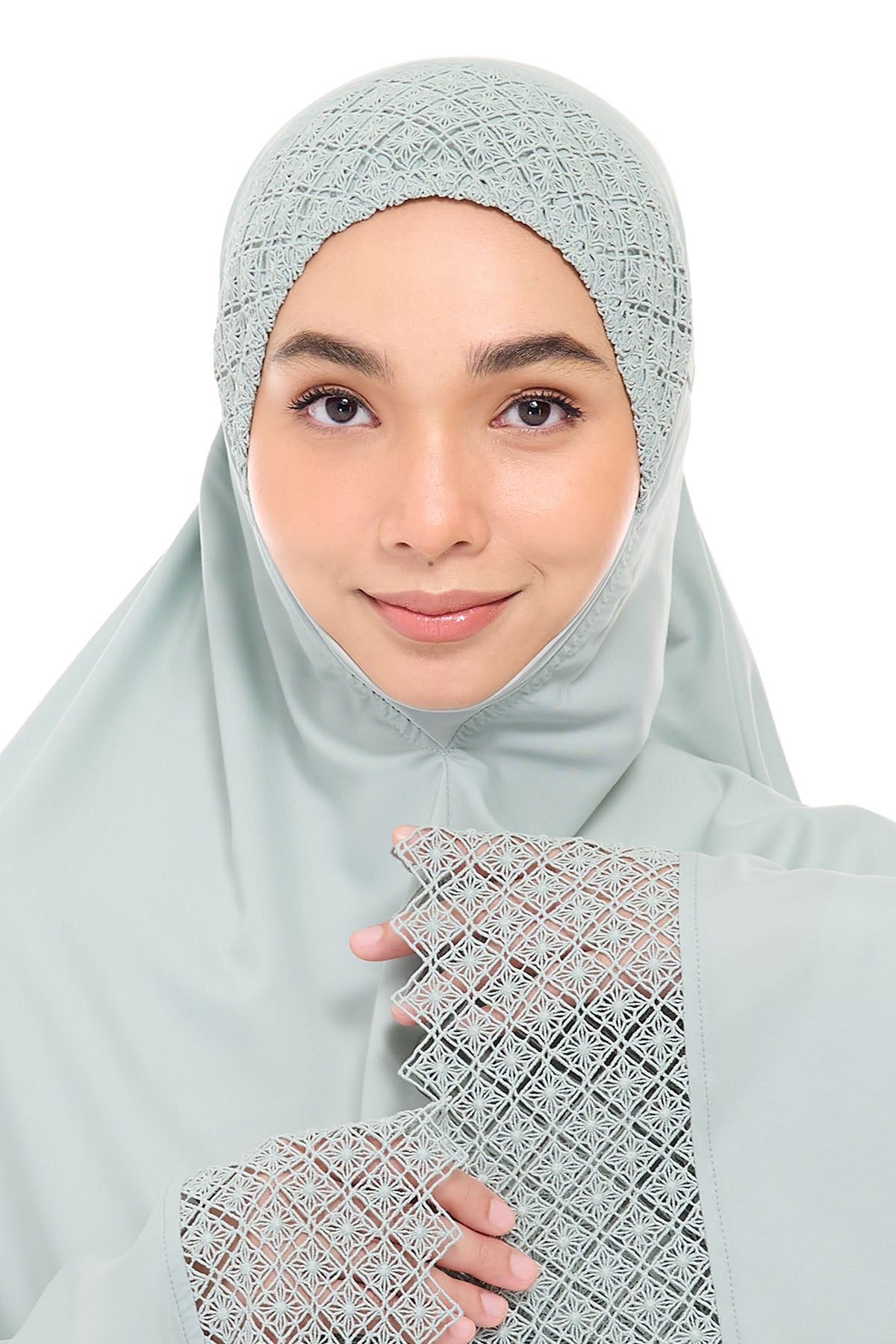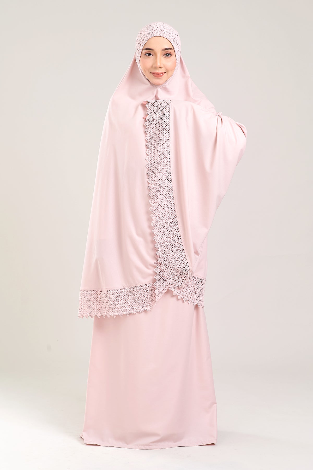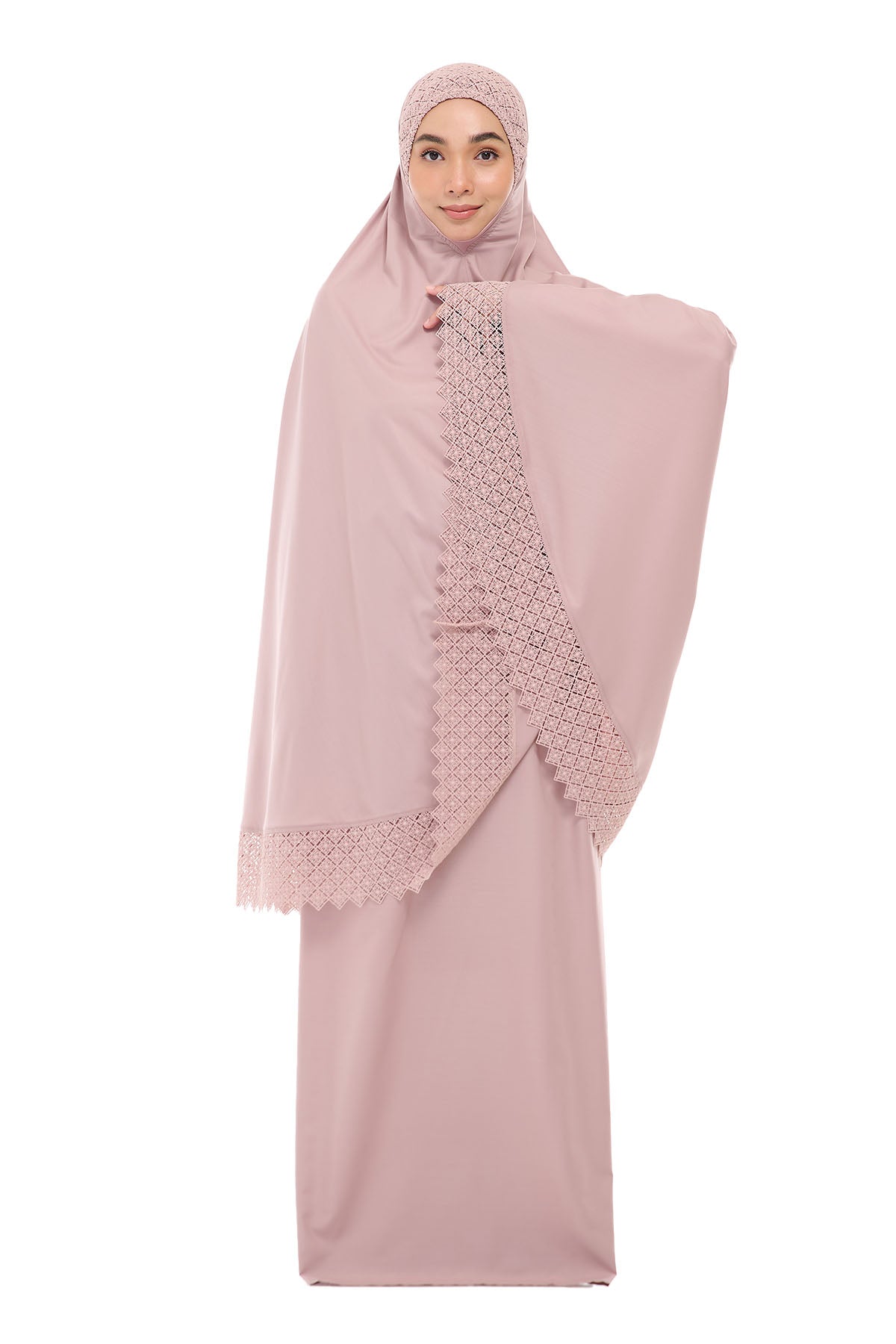 Crafted from the reputable KUF/KUF+ fabric, this telekung ensures ventilation, durability, quick drying, and a soft skin feel. The detailed and durable khadura lace, inspired by Asanoha's geometry sets it apart. Matching designs for adults and kids allow for coordination, and its UV protection makes it the ideal choice for protective prayer sessions. Available in Classic and Harmony facelook, it also comes in midi size, and a separate option includes an adjustable-length jupe skirt.