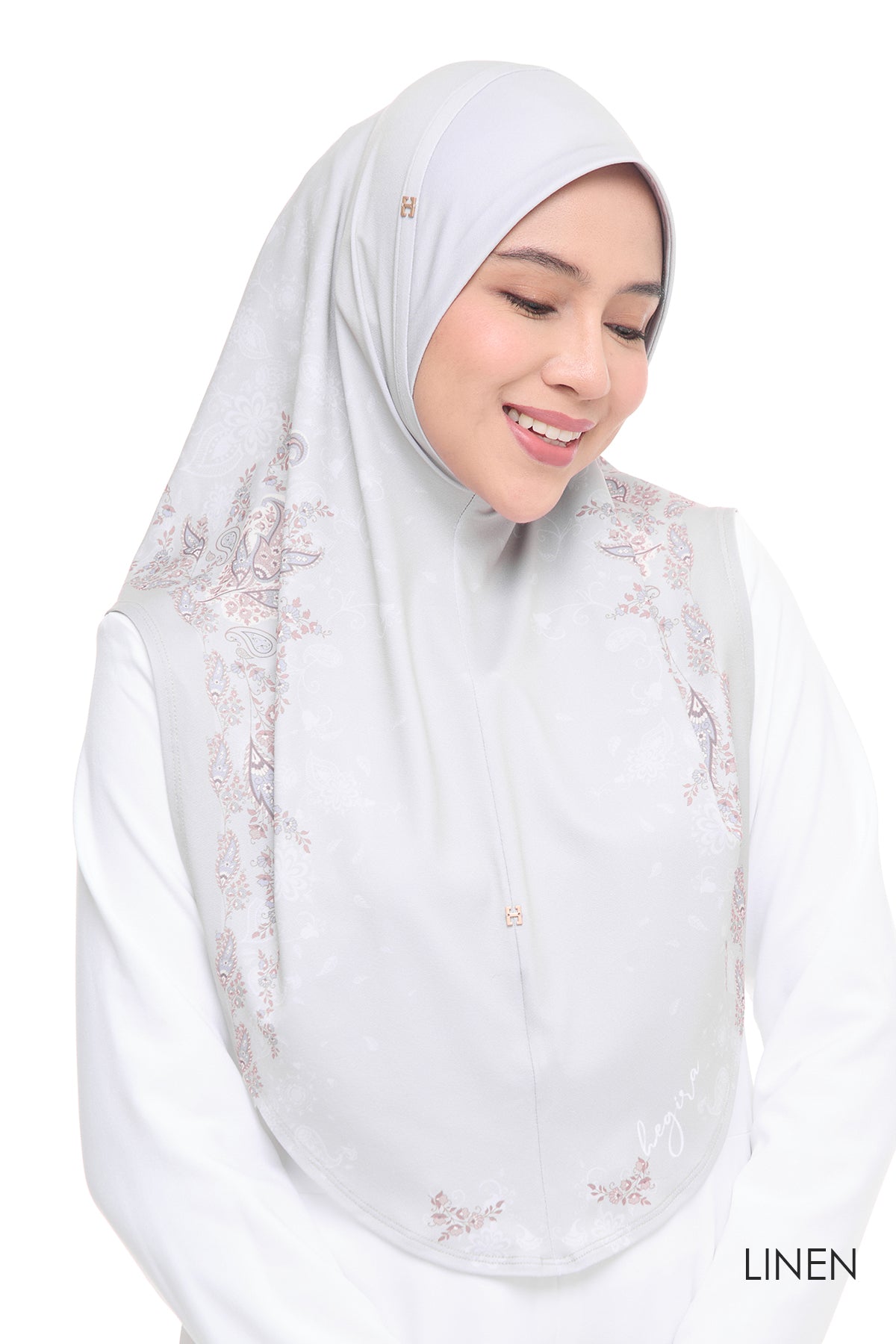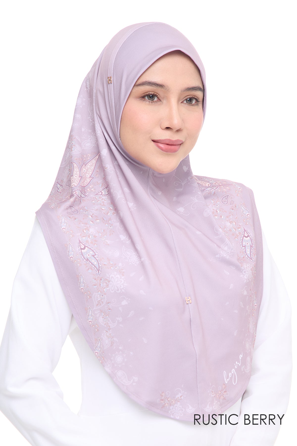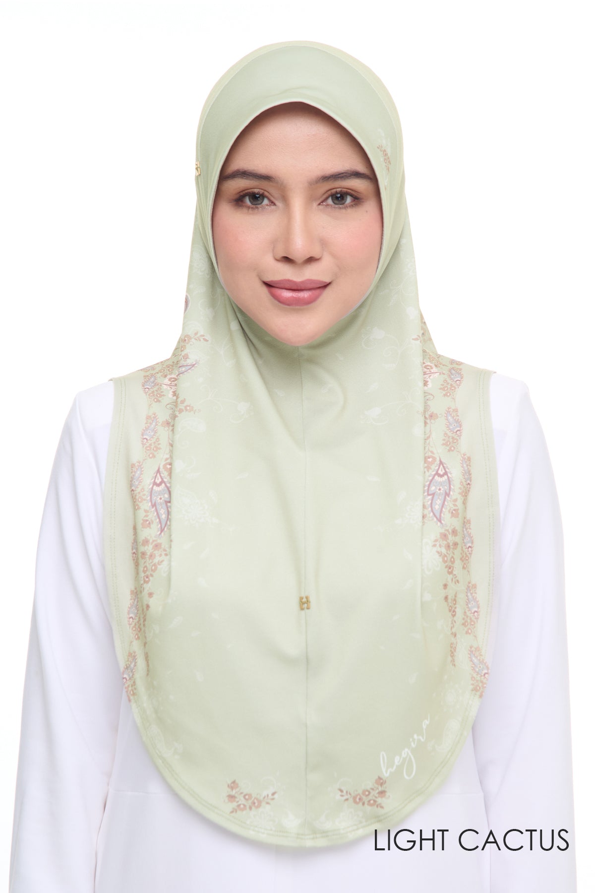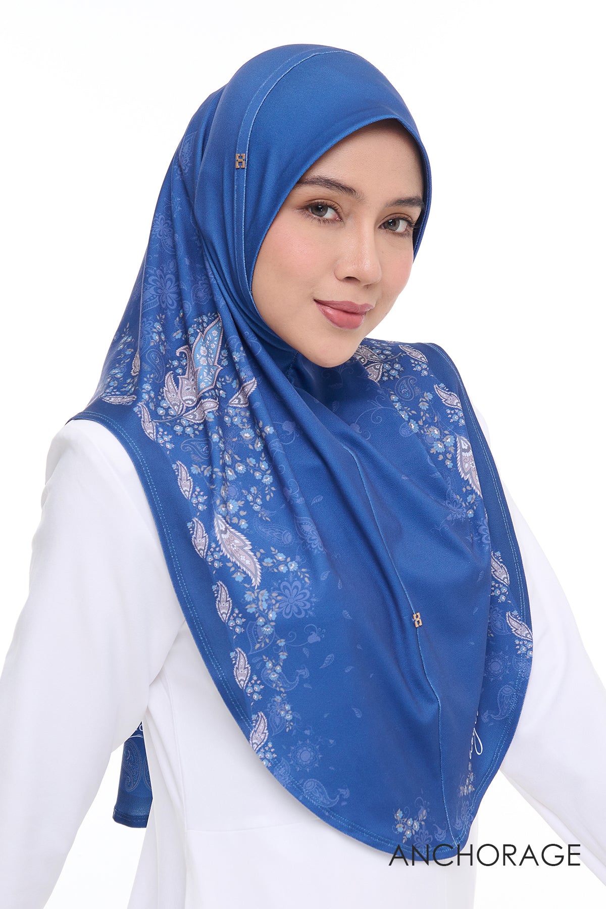 Made from moss crepe to ensure no-ironing needed and comes in a unique awning cutting for a slimmer face illusion. It adopts a seamless print pattern inspired teardrop-shaped motif, making it a timeless aesthetics.