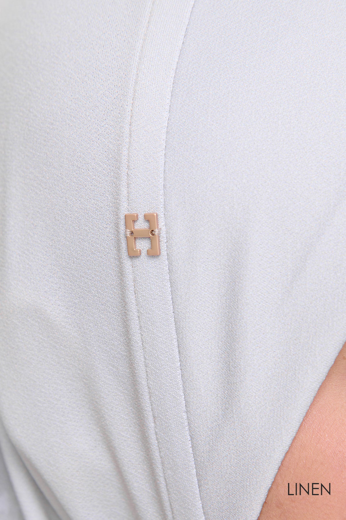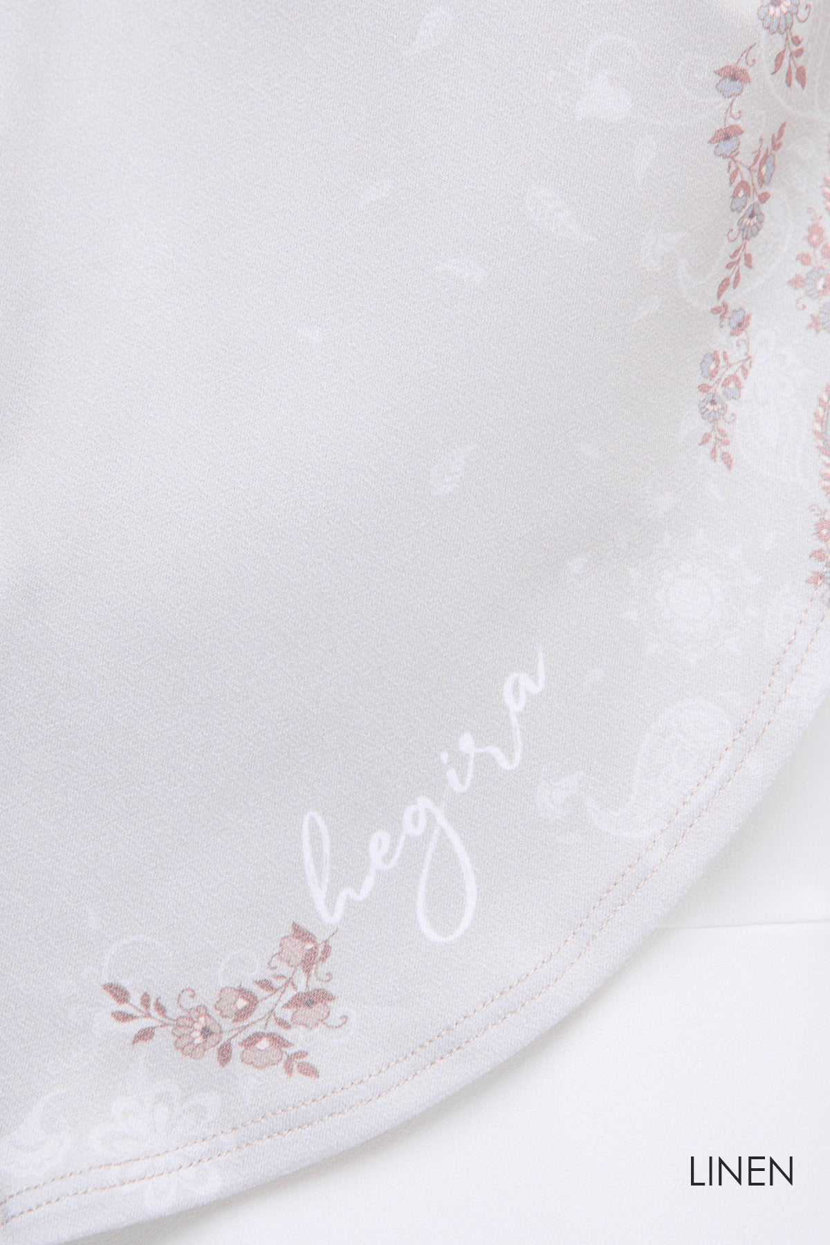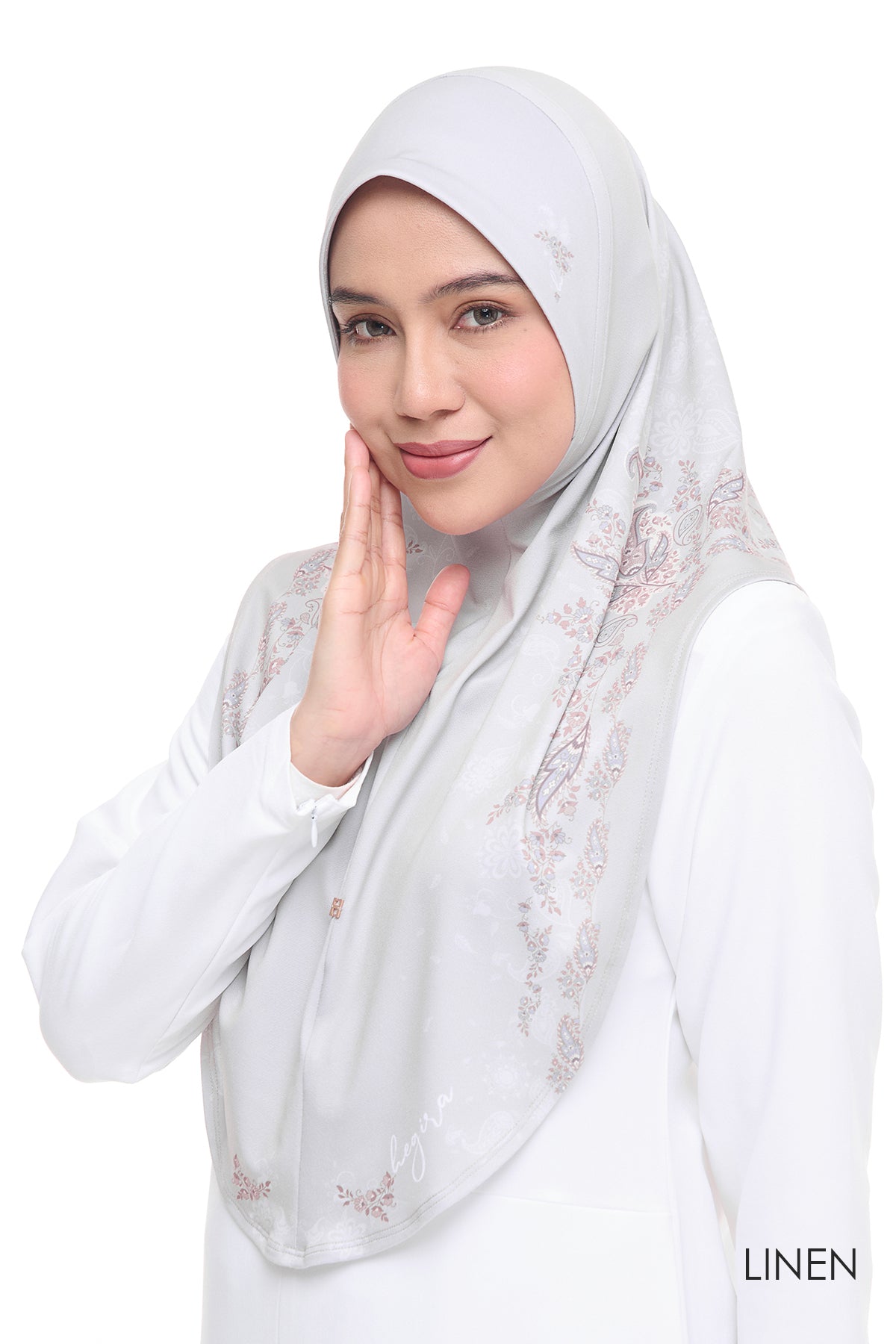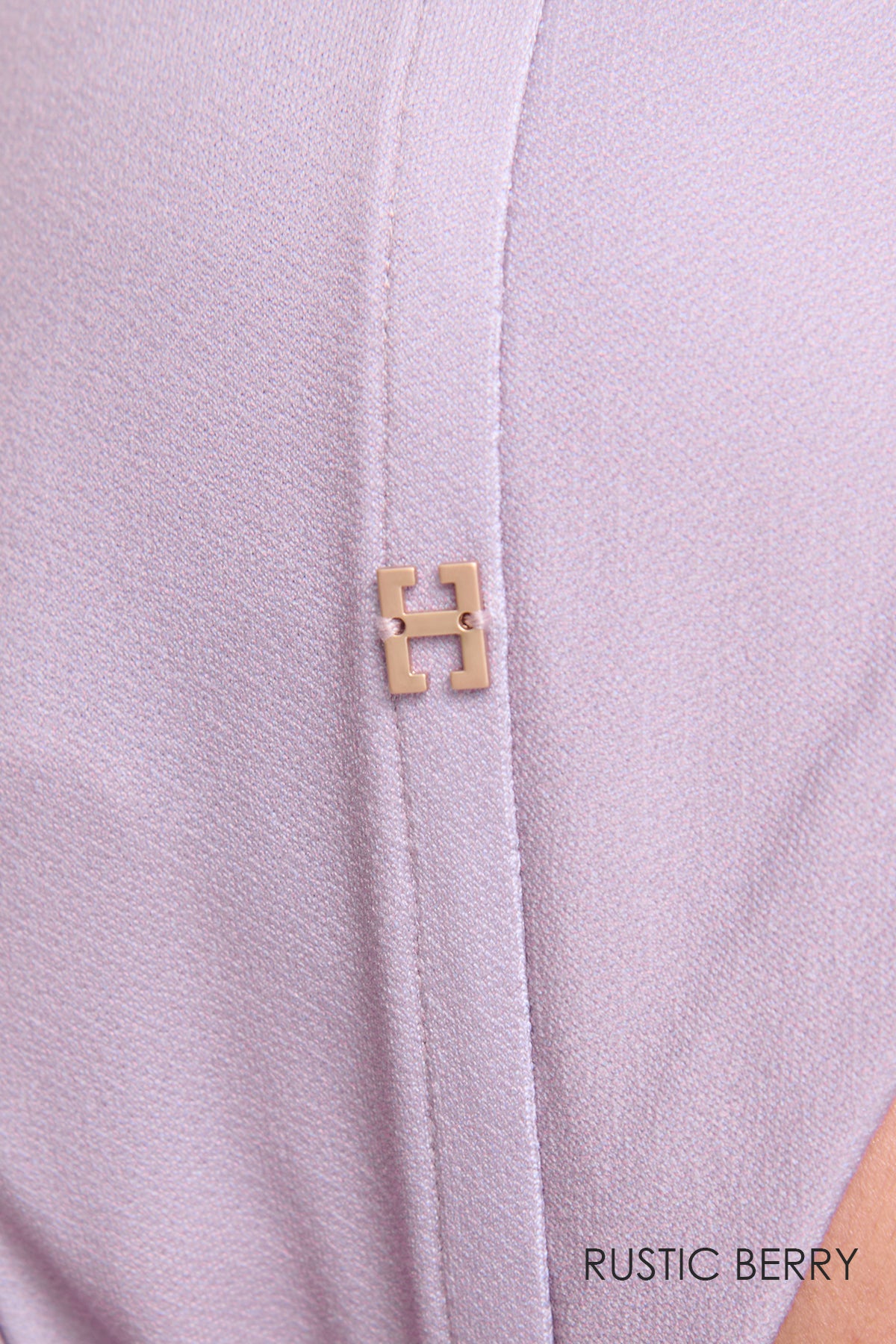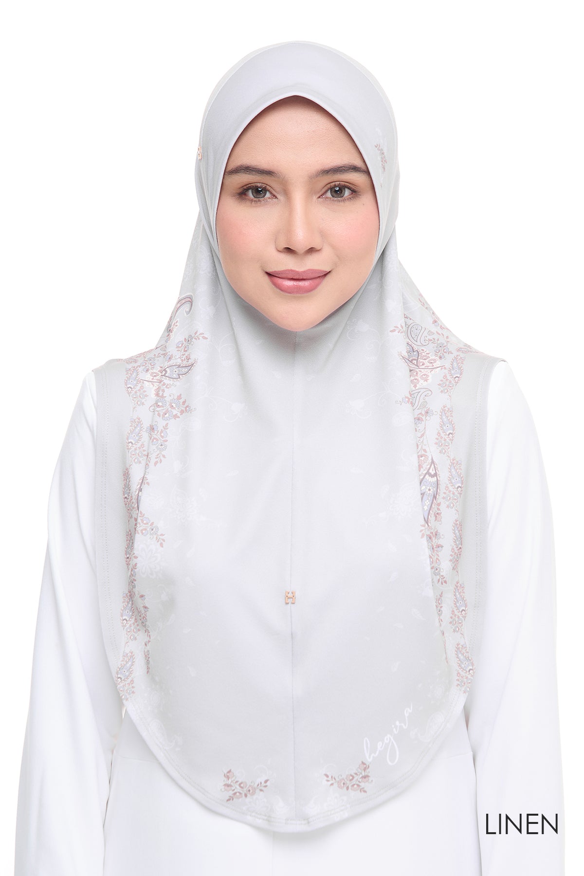 Made from moss crepe to ensure no-ironing needed and comes in a unique awning cutting for a slimmer face illusion. It adopts a seamless print pattern inspired teardrop-shaped motif, making it a timeless aesthetics.