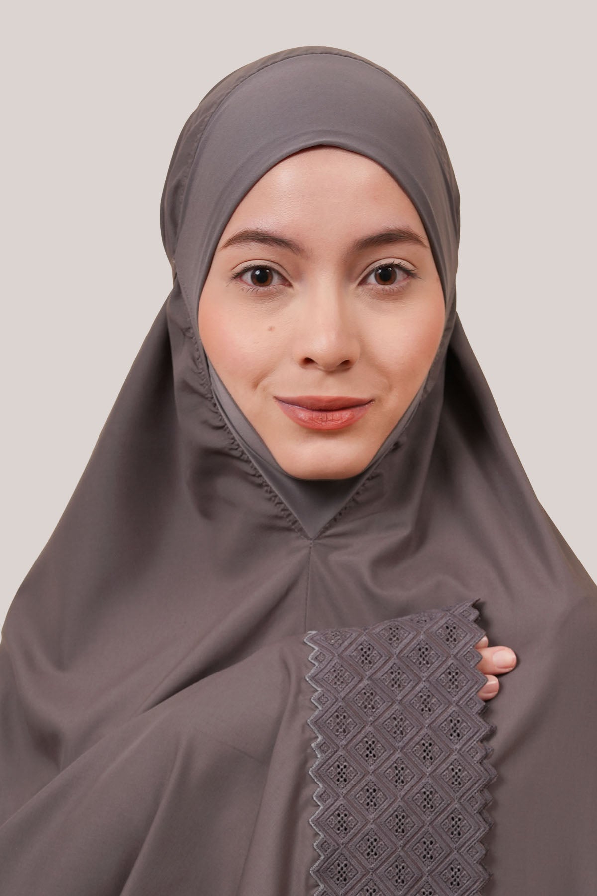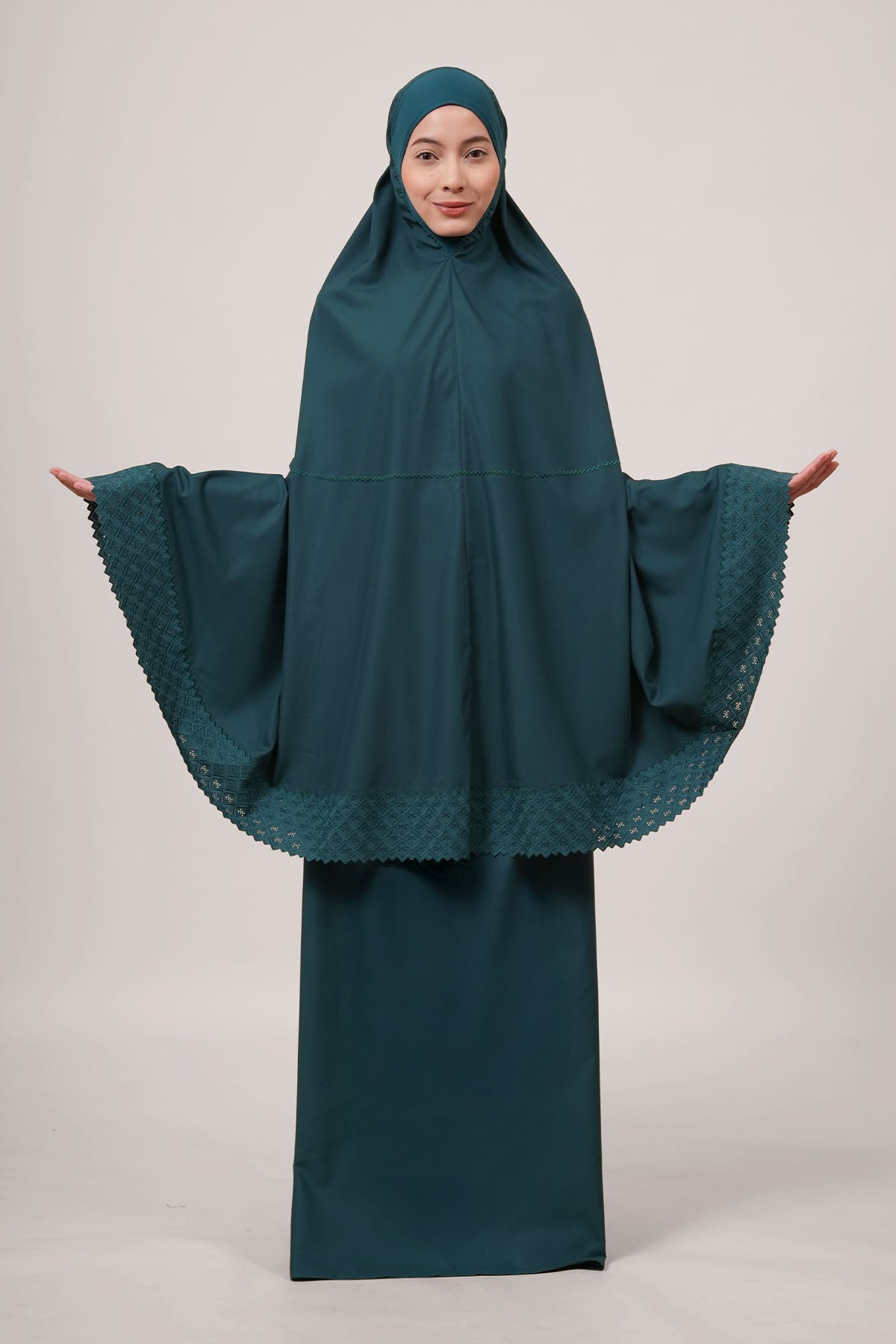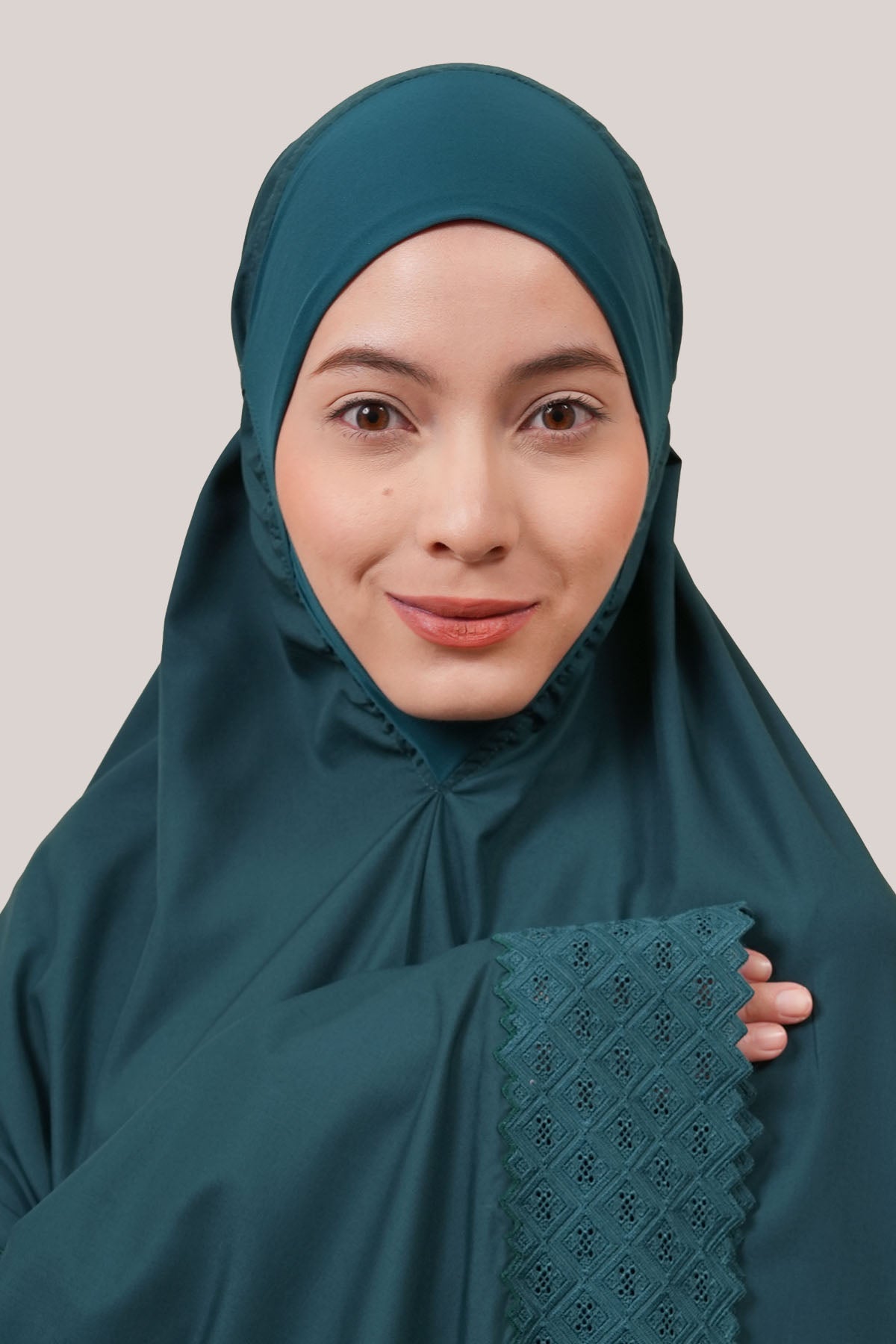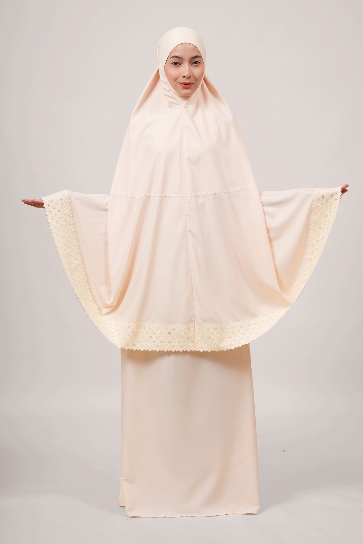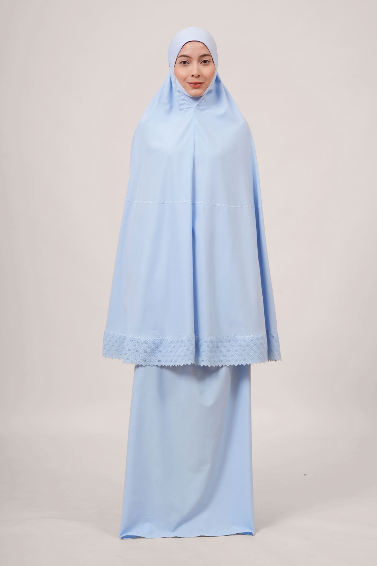 Introducing the Telekung Harmony Signature Elara, inspired by the classic and minimalist Lines of Elegance lace pattern that beautifully reflects the grace and strength of women. Crafted from durable Signature Poplin fabric that stretches without tearing and retains its colour even after multiple washes, this telekung is designed for everyday devotion. The delicate embroidery technique used to join the cotton lace with the main fabric adds a touch of refined detail to its simple yet captivating design.