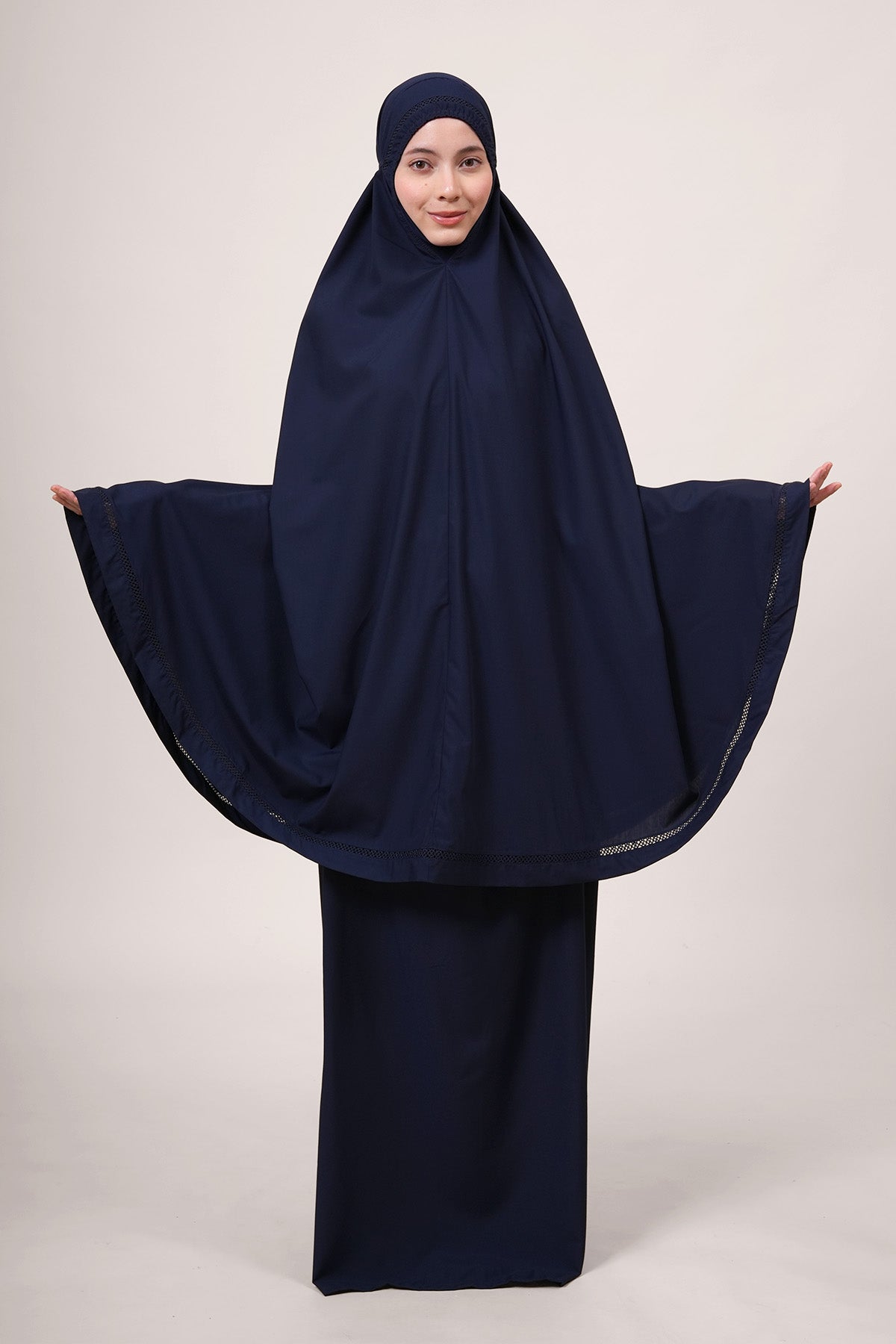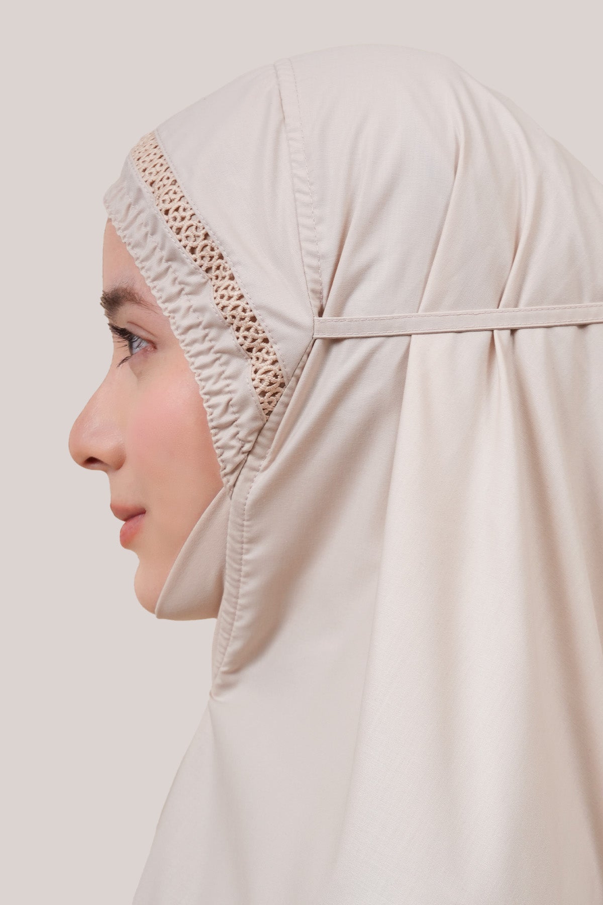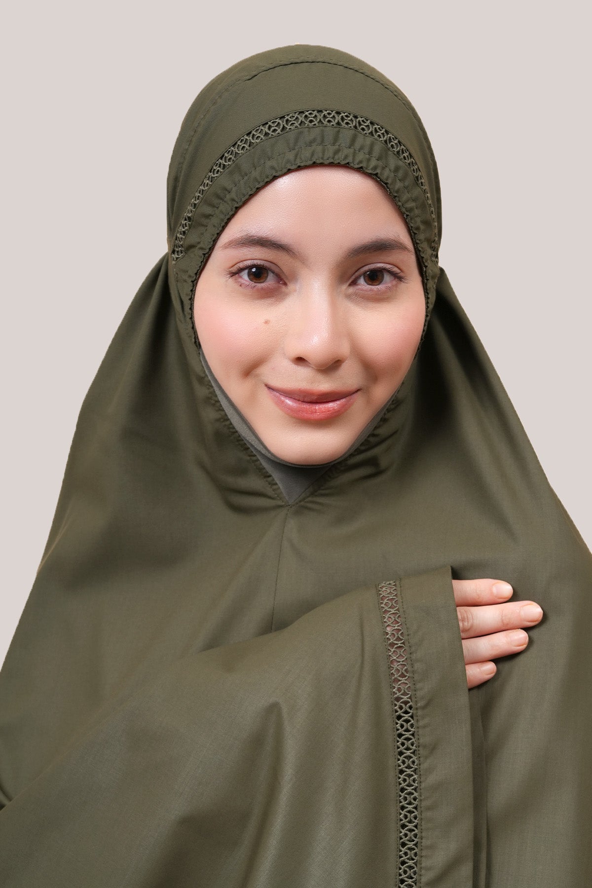 This telekung is made from Khadijah Basic Fine (KBF) fabric, which is cool, breathable, and twice as soft on the skin. It has a comfortable chin cover made from stretchable ITY material that stays in place and keeps its shape after washing. The Classic head design has padded elastic that won’t leave marks on the forehead. The fabric is 14% more tightly woven than Khadijah Basic Poplin, making it less see-through and more confident to wear. Finished with strong and detailed guipure lace, this telekung is both elegant and durable, with a simple and practical design.
