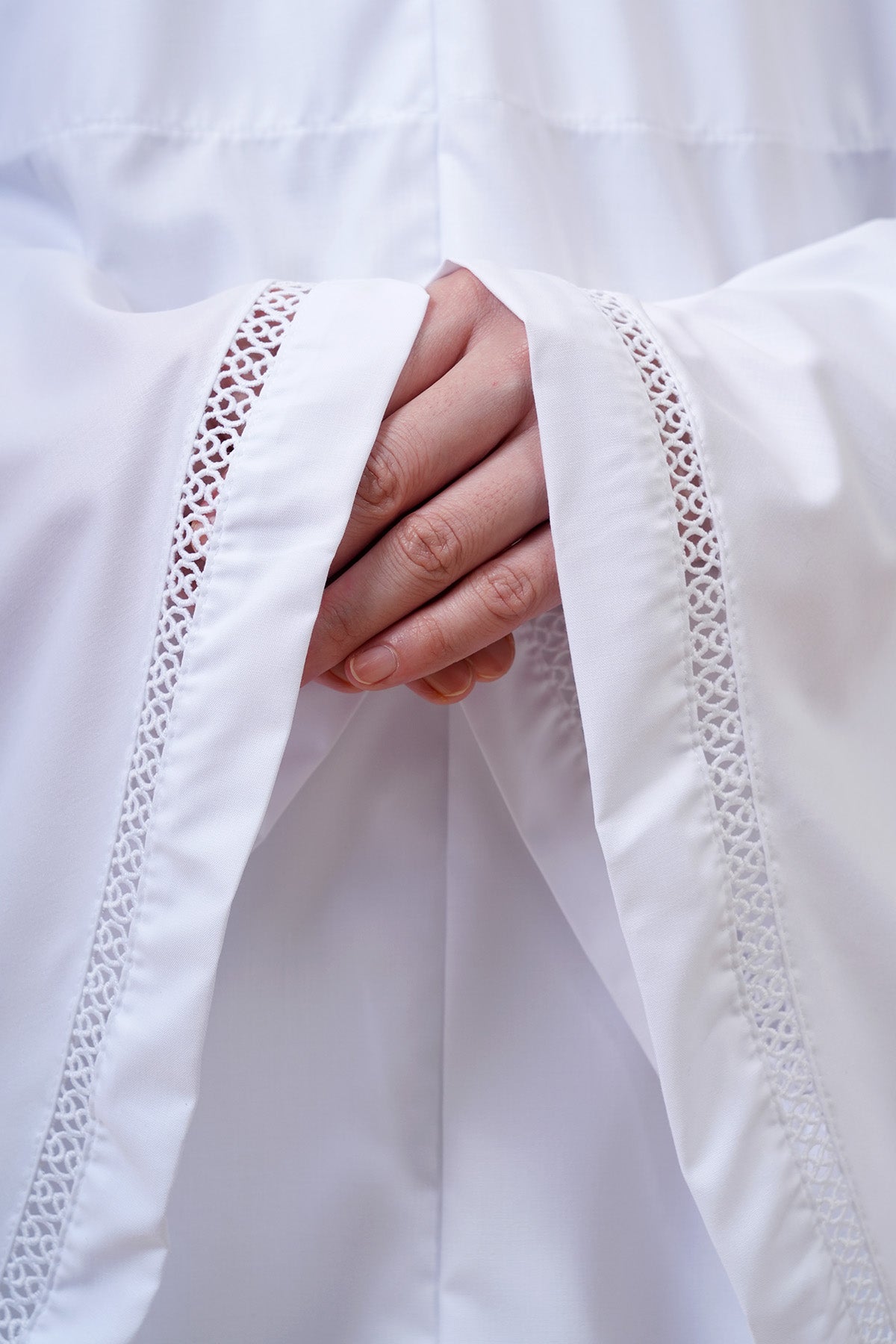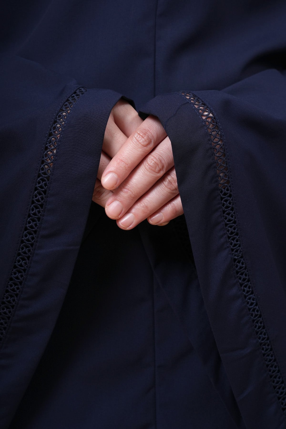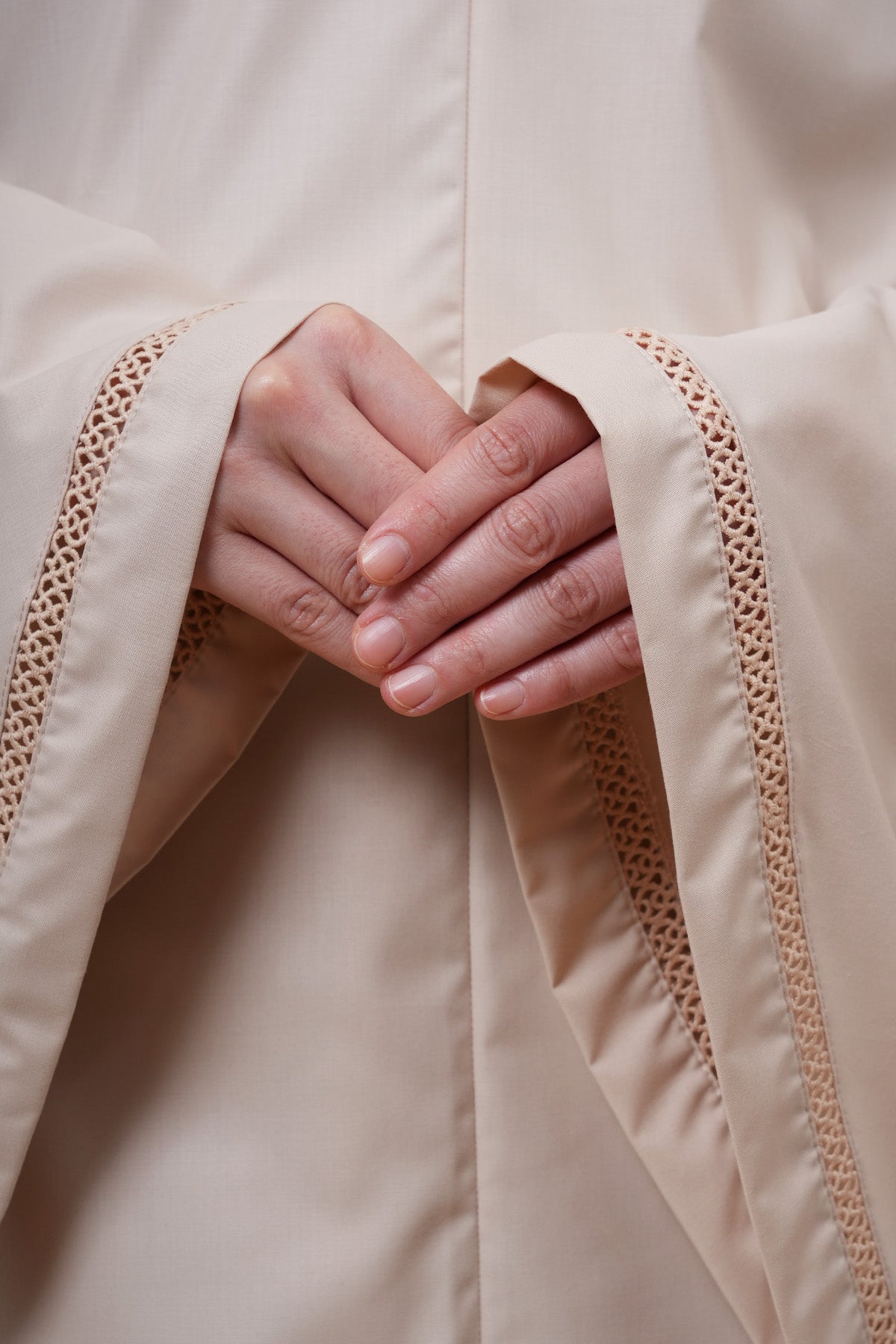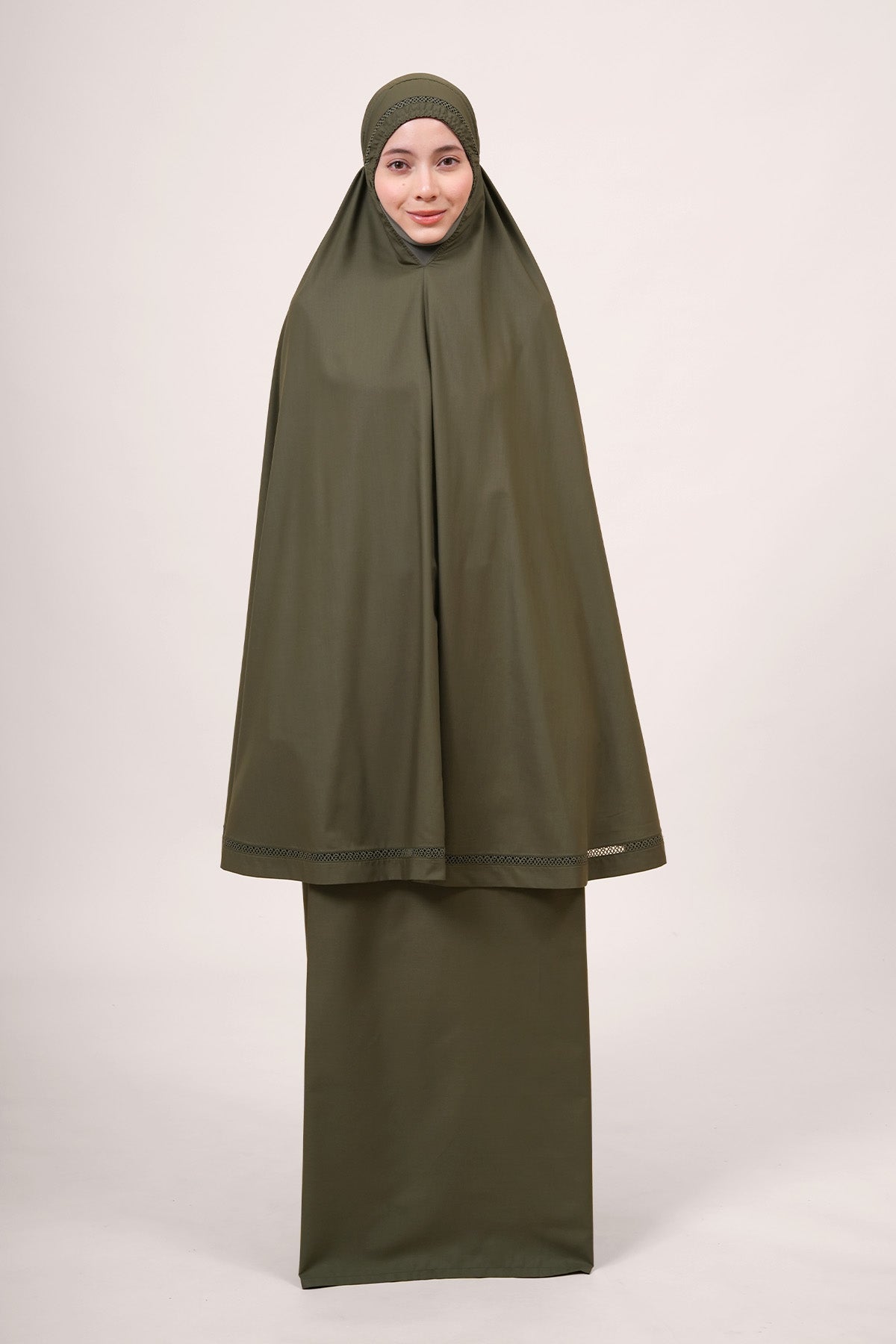 This telekung is made from Khadijah Basic Fine (KBF) fabric, which is cool, breathable, and twice as soft on the skin. It has a comfortable chin cover made from stretchable ITY material that stays in place and keeps its shape after washing. The Classic head design has padded elastic that won’t leave marks on the forehead. The fabric is 14% more tightly woven than Khadijah Basic Poplin, making it less see-through and more confident to wear. Finished with strong and detailed guipure lace, this telekung is both elegant and durable, with a simple and practical design.