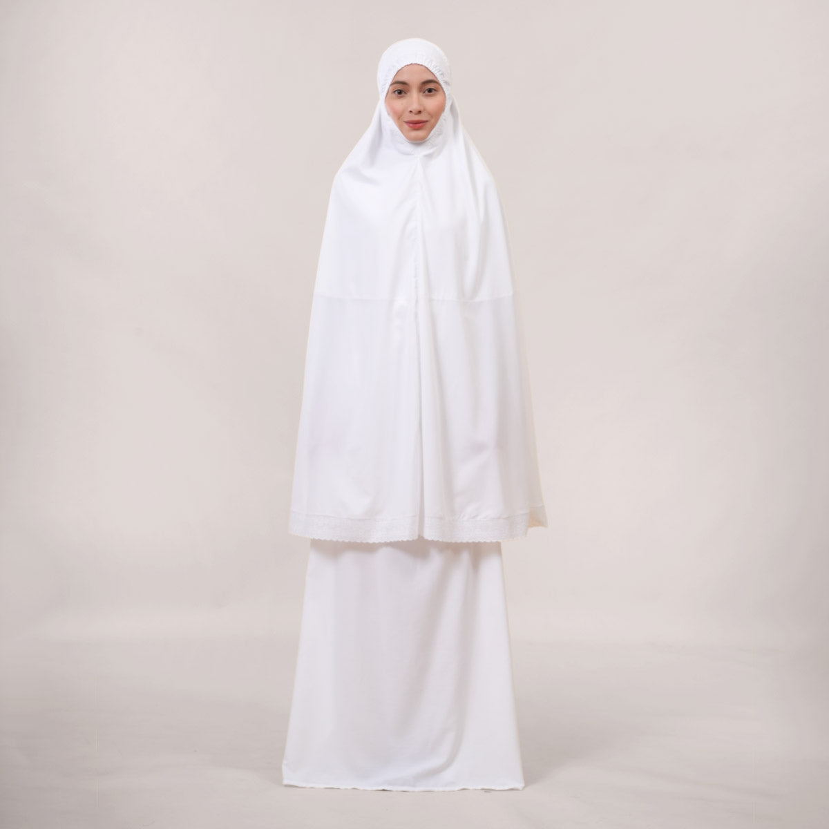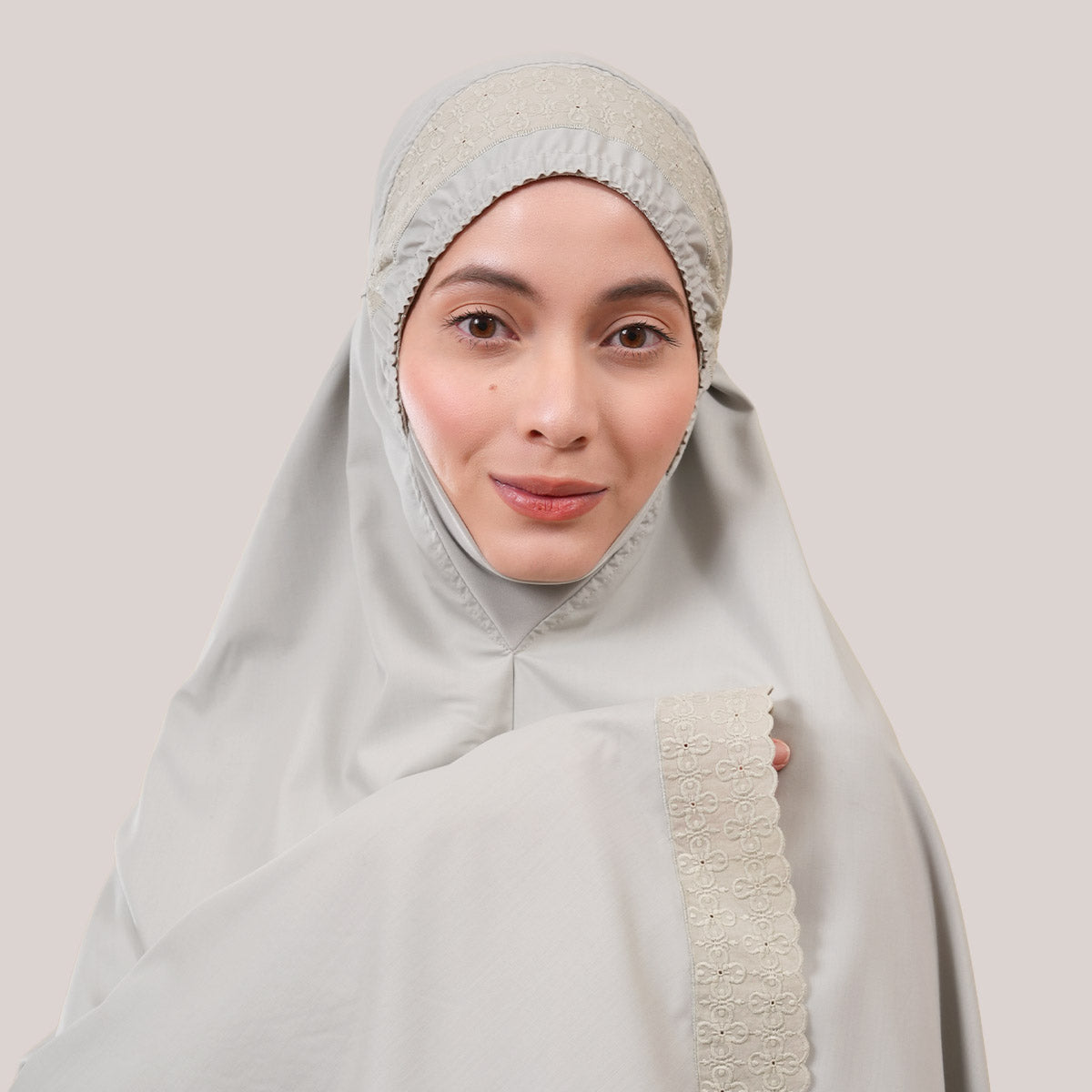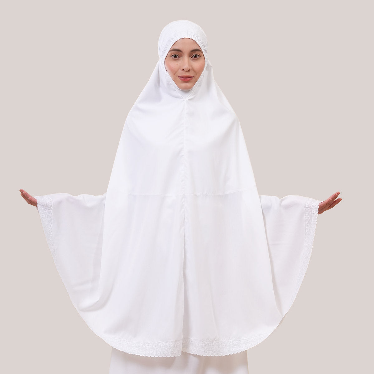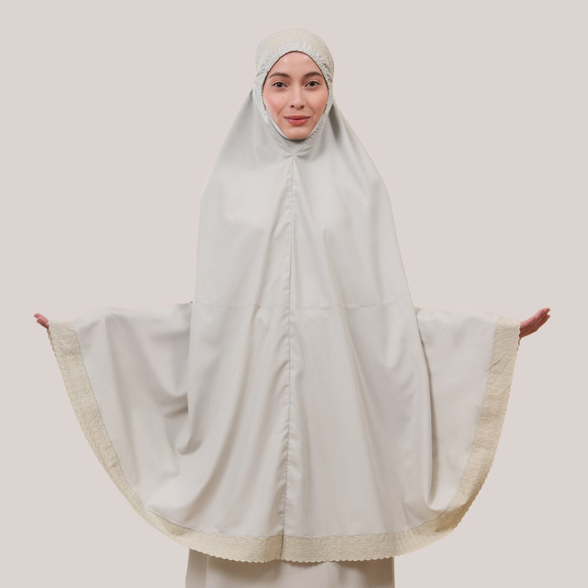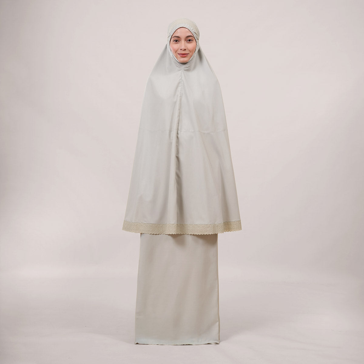 Inspired by Mushaf motifs, the Signature Khanisa prayerwear showcases a minimalist and elegant lace concept. The use of delicate cotton lace, subtle yet classically refined, creates a timeless design that is perfect for daily worship or as a thoughtful gift. The name “Khanisa,” meaning tranquility and gentleness, reflects a calming presence and symbolizes a wearer who brings peace and softness to those around her.