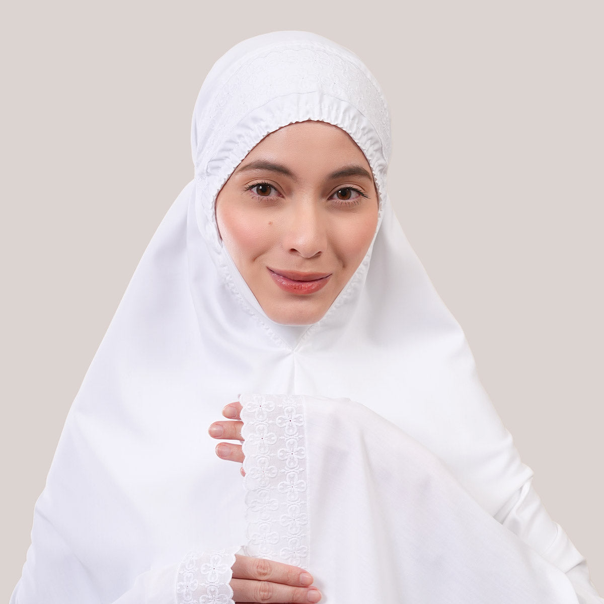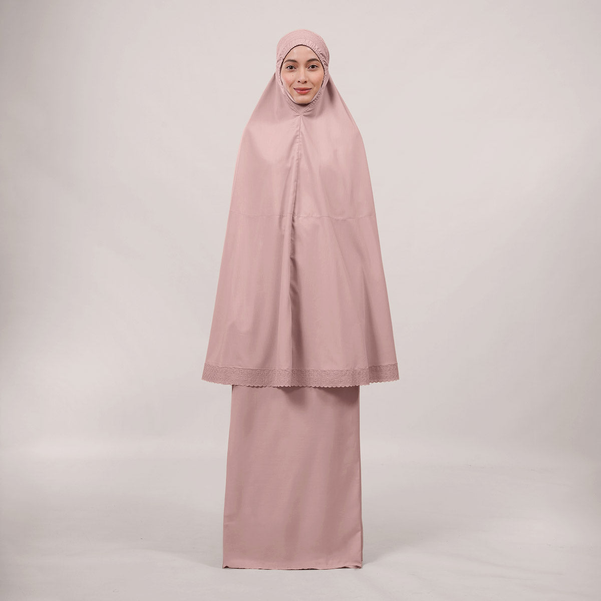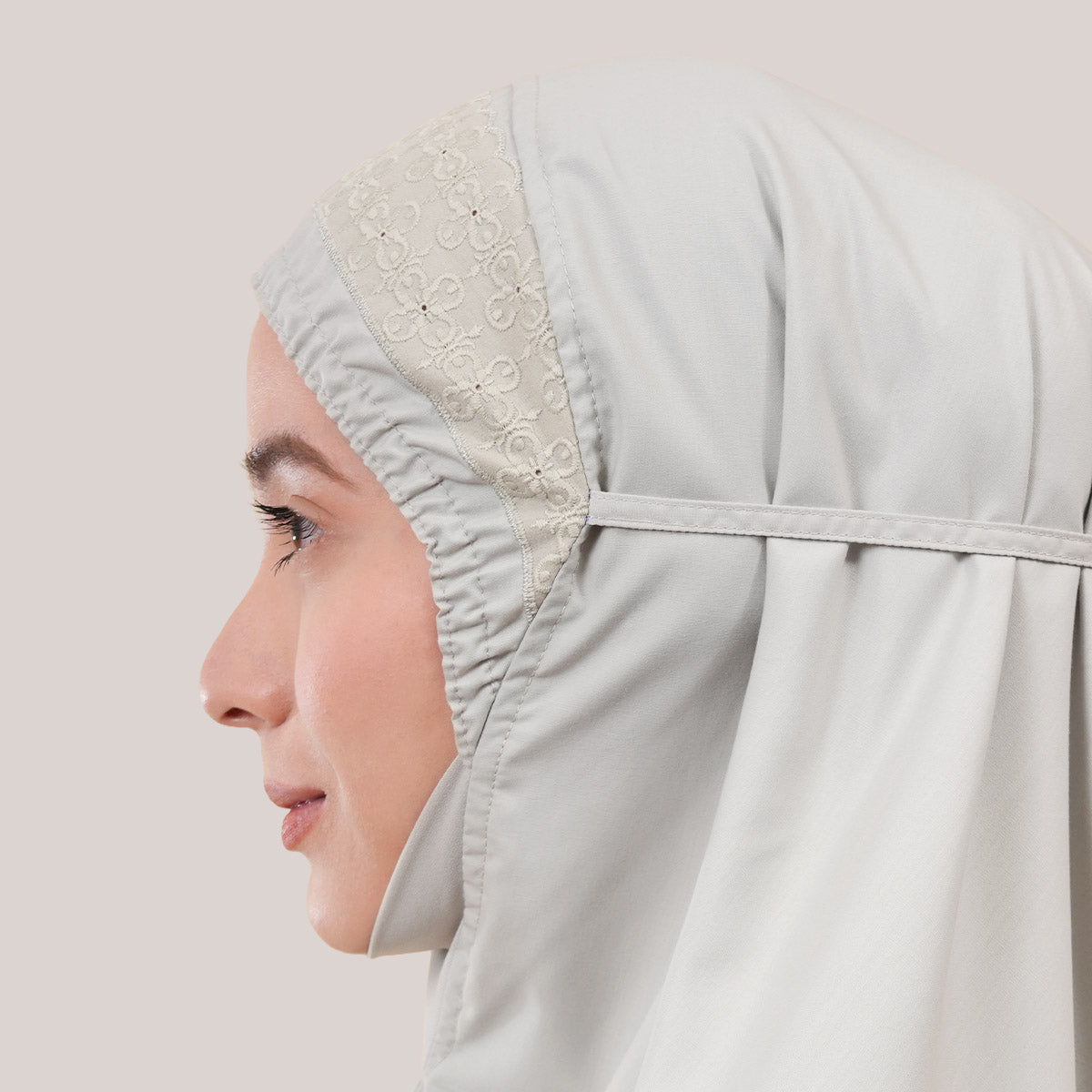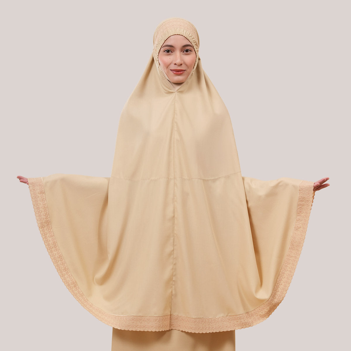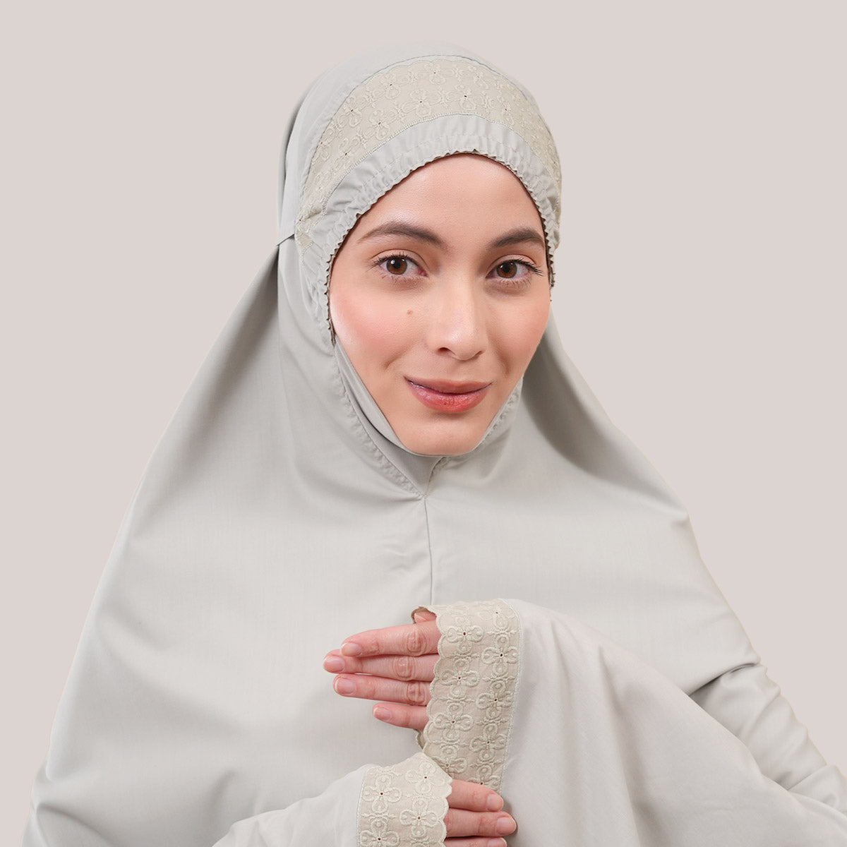 Inspired by Mushaf motifs, the Signature Khanisa prayerwear showcases a minimalist and elegant lace concept. The use of delicate cotton lace, subtle yet classically refined, creates a timeless design that is perfect for daily worship or as a thoughtful gift. The name “Khanisa,” meaning tranquility and gentleness, reflects a calming presence and symbolizes a wearer who brings peace and softness to those around her.