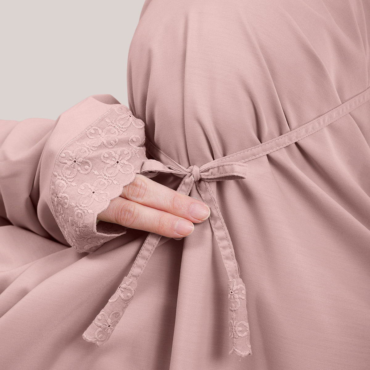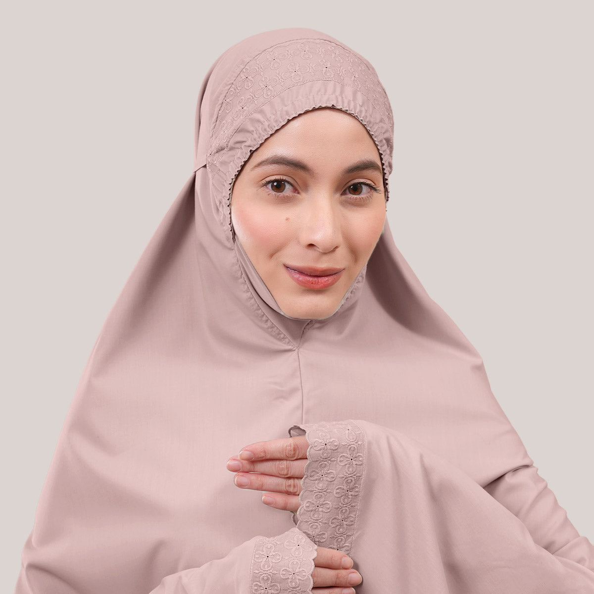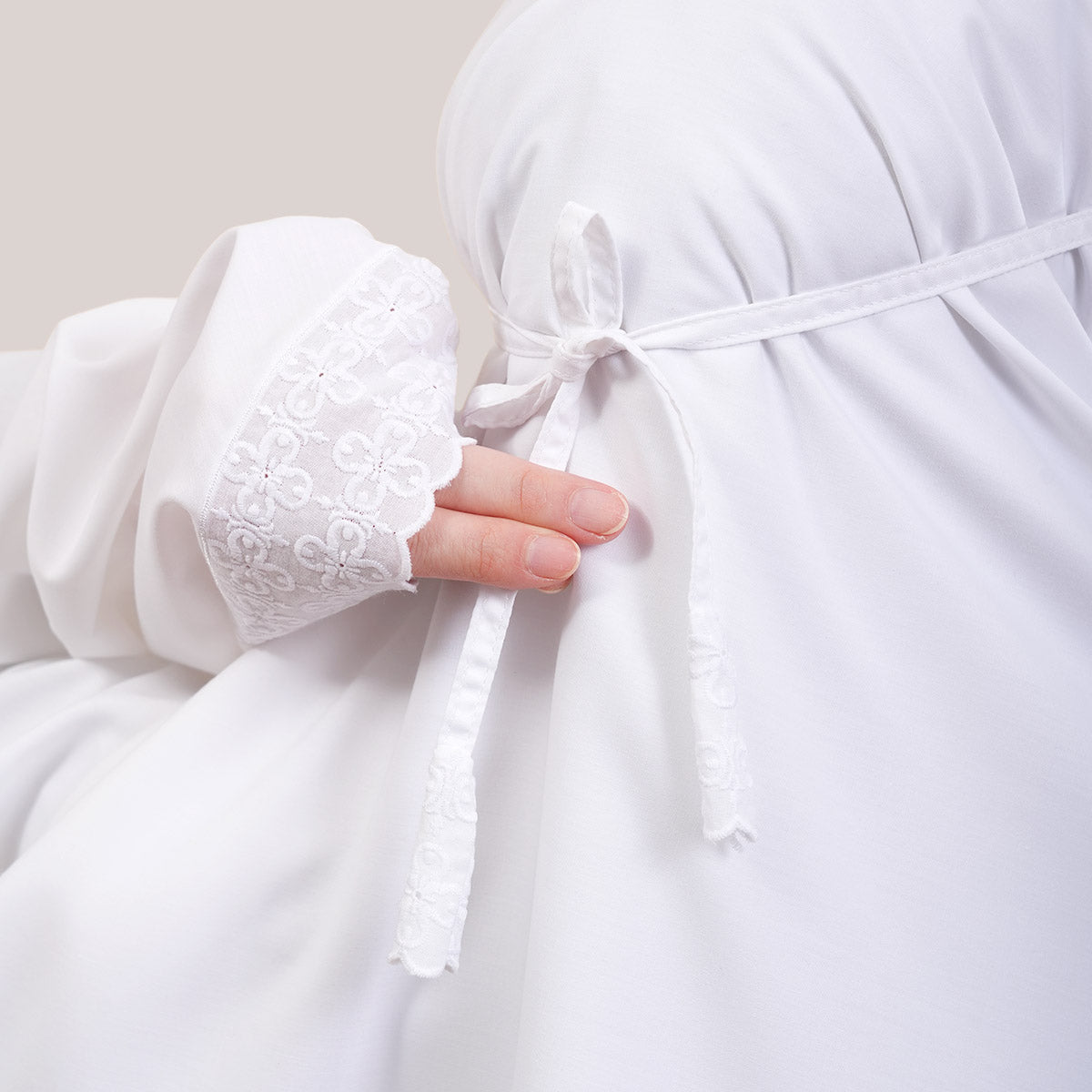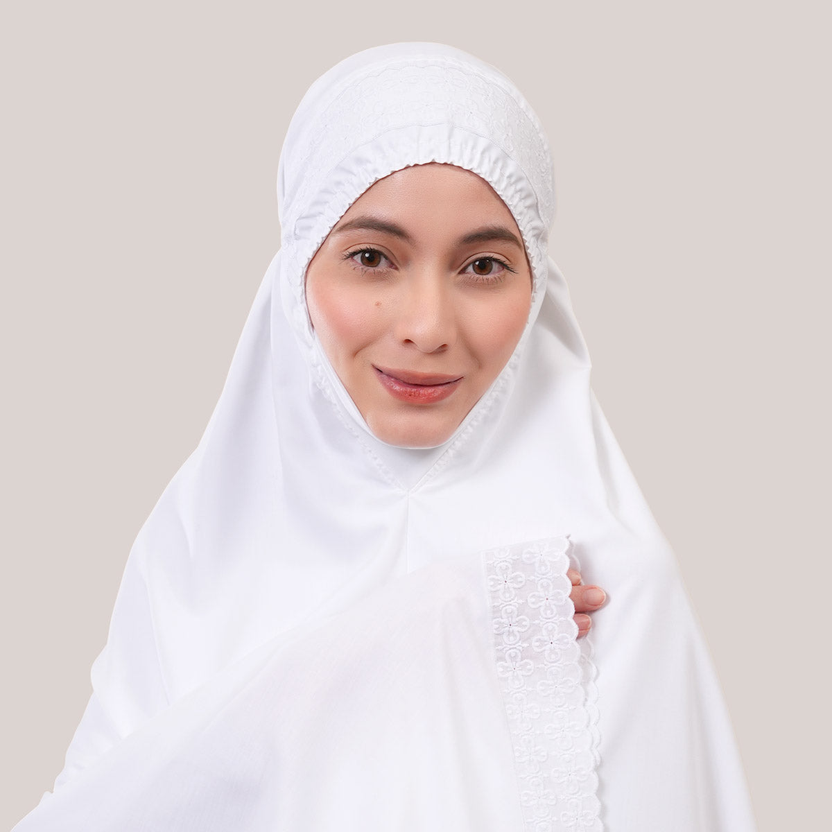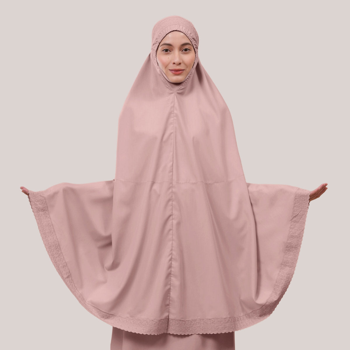 Inspired by Mushaf motifs, the Signature Khanisa prayerwear showcases a minimalist and elegant lace concept. The use of delicate cotton lace, subtle yet classically refined, creates a timeless design that is perfect for daily worship or as a thoughtful gift. The name “Khanisa,” meaning tranquility and gentleness, reflects a calming presence and symbolizes a wearer who brings peace and softness to those around her.
