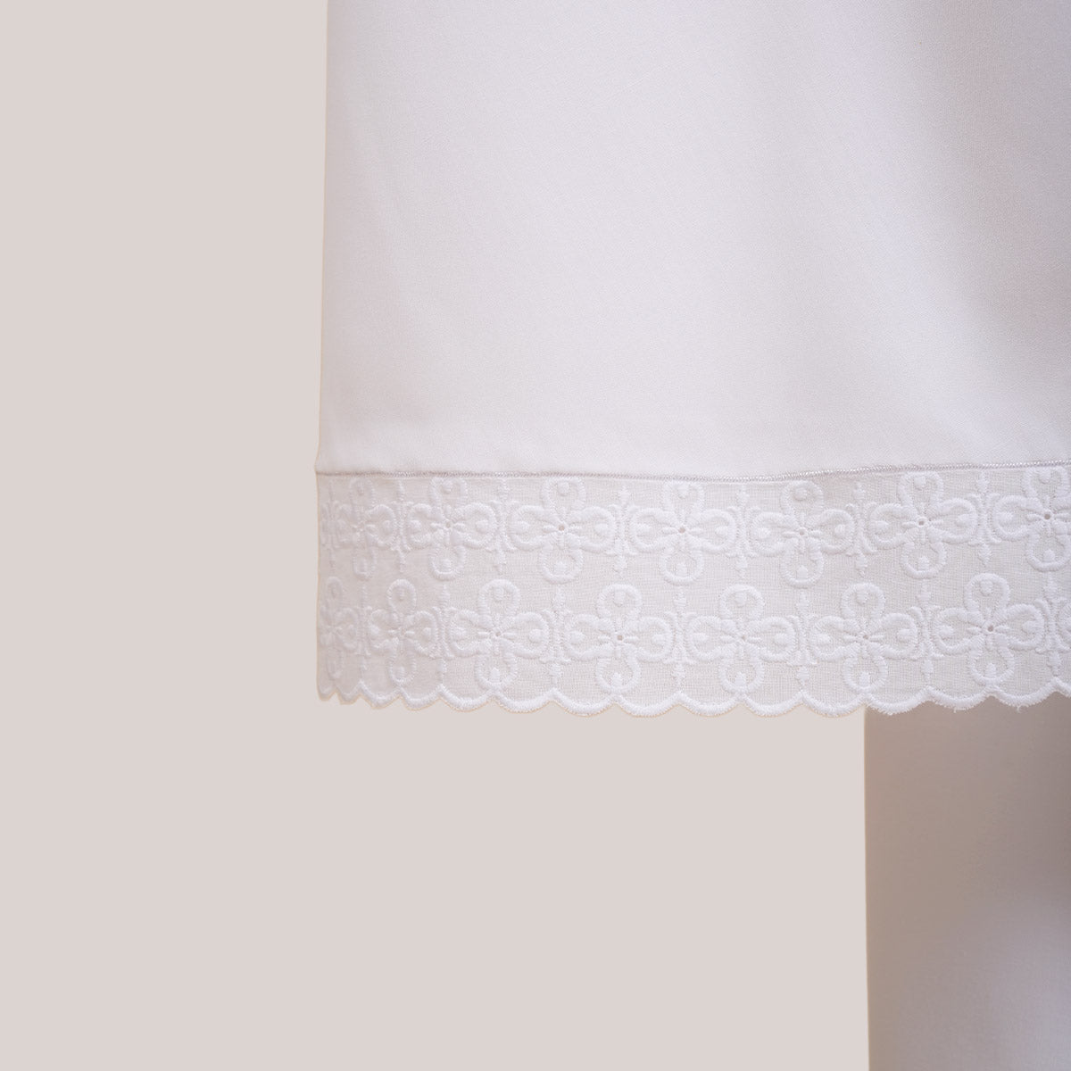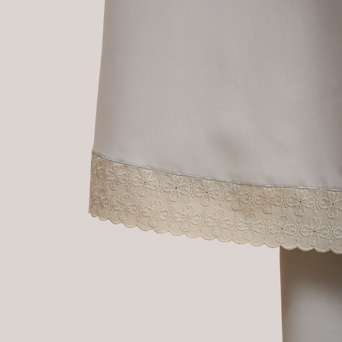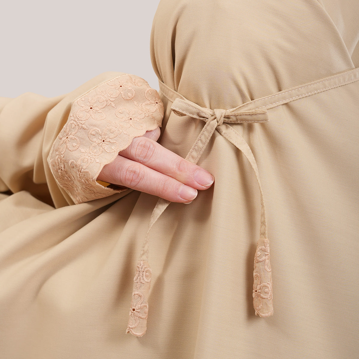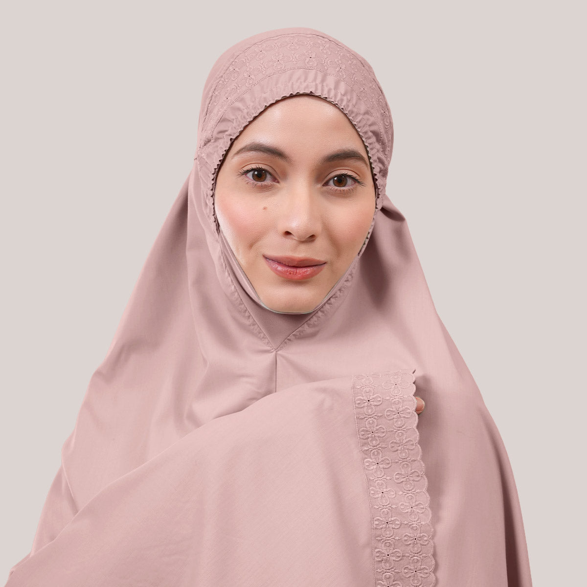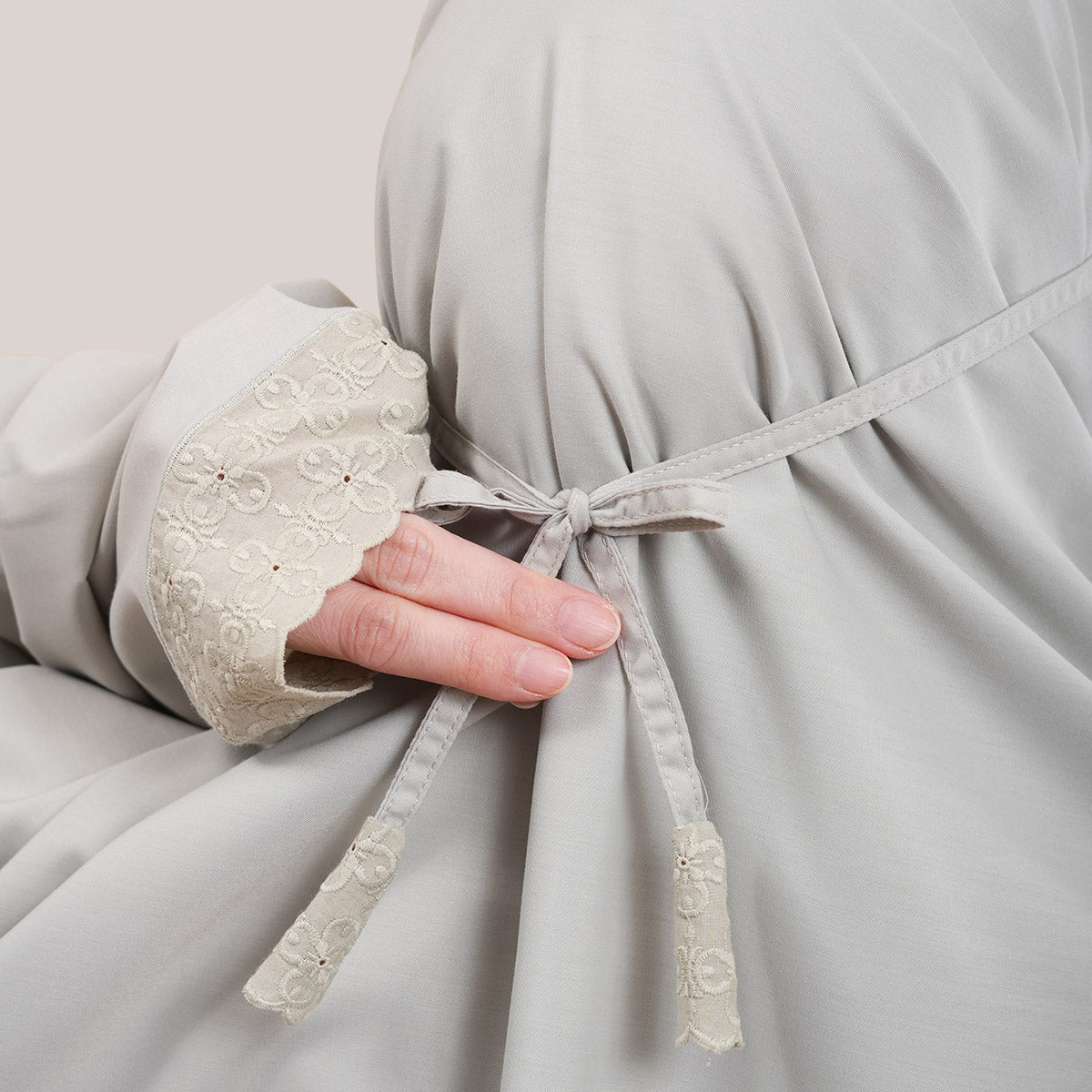 Inspired by Mushaf motifs, the Signature Khanisa prayerwear showcases a minimalist and elegant lace concept. The use of delicate cotton lace, subtle yet classically refined, creates a timeless design that is perfect for daily worship or as a thoughtful gift. The name “Khanisa,” meaning tranquility and gentleness, reflects a calming presence and symbolizes a wearer who brings peace and softness to those around her.