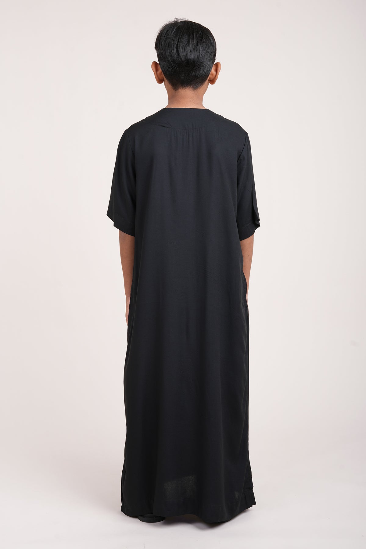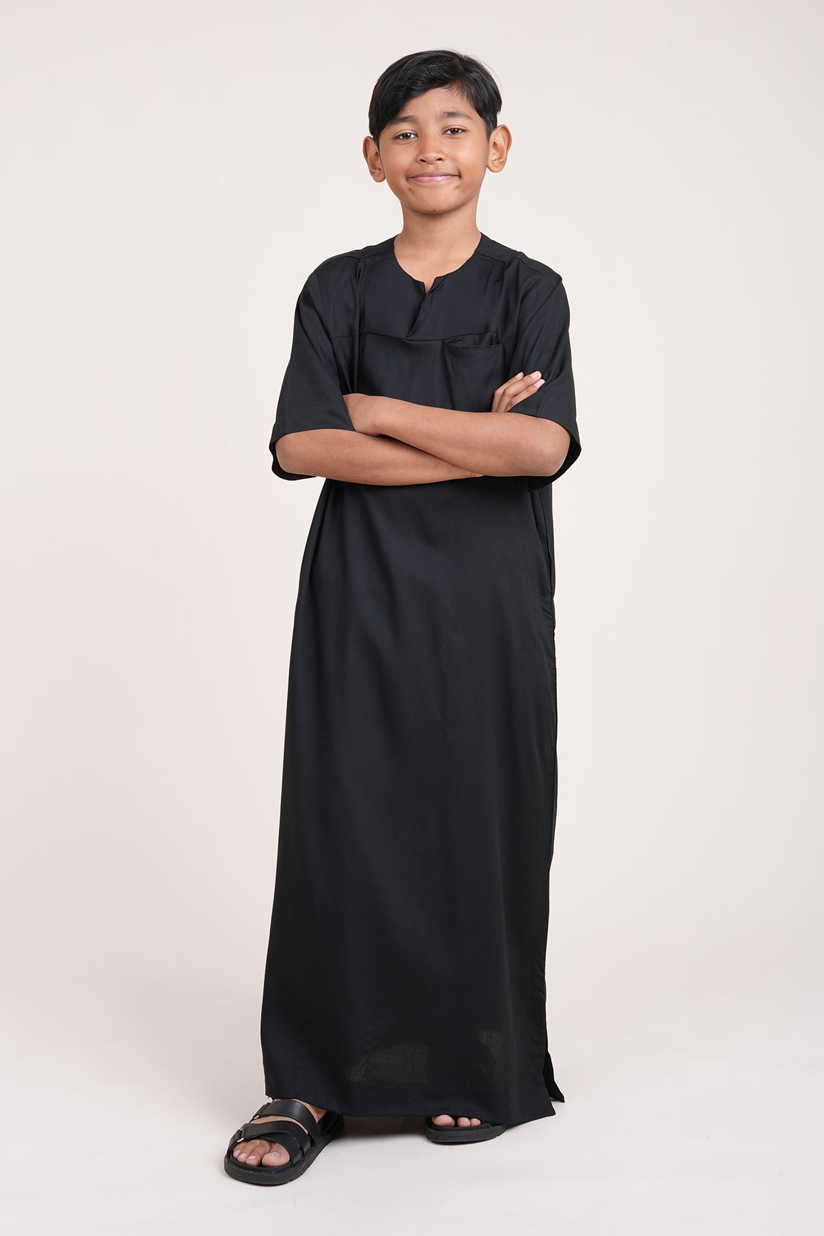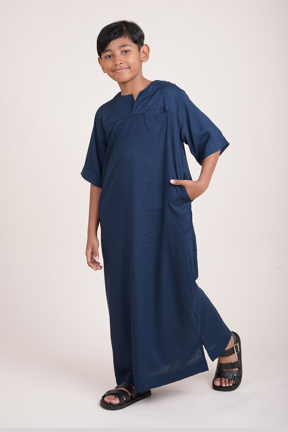 Made from lightweight and breathable fabric, it ensures a soft touch on the skin without causing irritation. The relaxed A-line silhouette allows freedom of movement, while the collarless neckline enhances all-day ease. Featuring side pockets for added convenience and a button-free design for quick dressing, this thobe is a perfect blend of tradition and functionality for young boys.