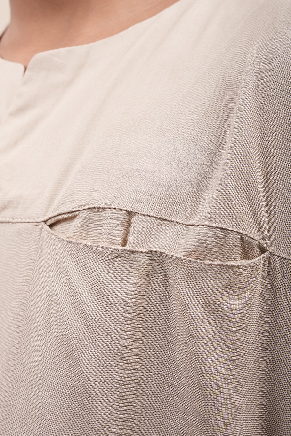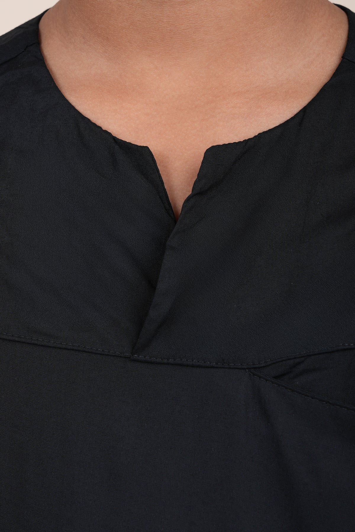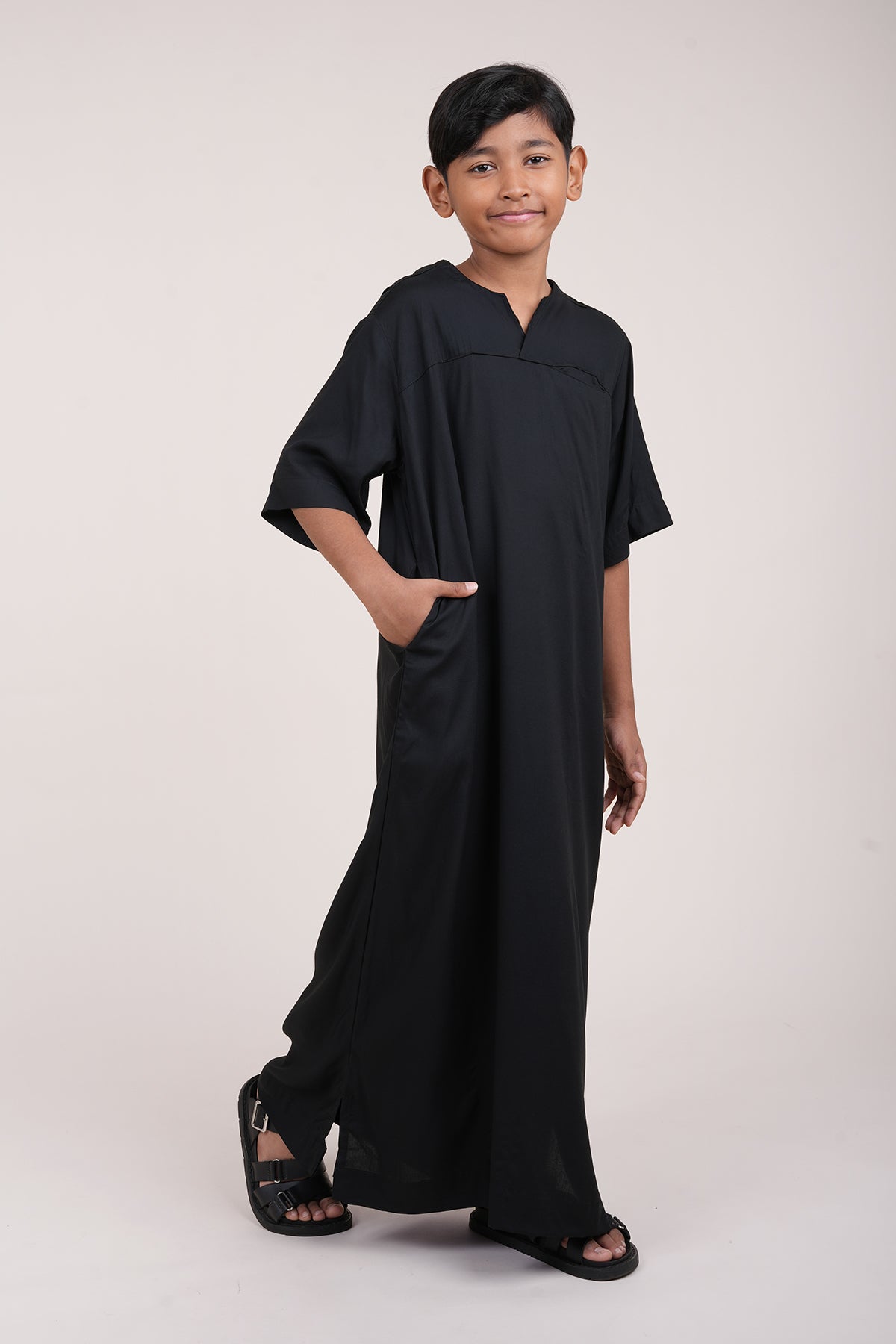 Made from lightweight and breathable fabric, it ensures a soft touch on the skin without causing irritation. The relaxed A-line silhouette allows freedom of movement, while the collarless neckline enhances all-day ease. Featuring side pockets for added convenience and a button-free design for quick dressing, this thobe is a perfect blend of tradition and functionality for young boys.