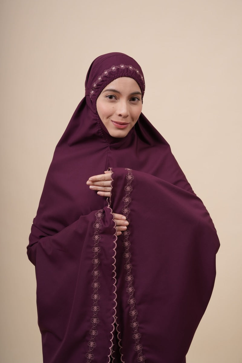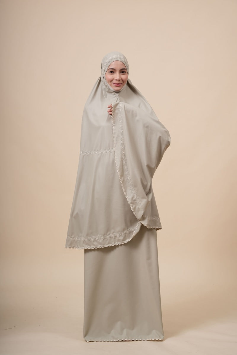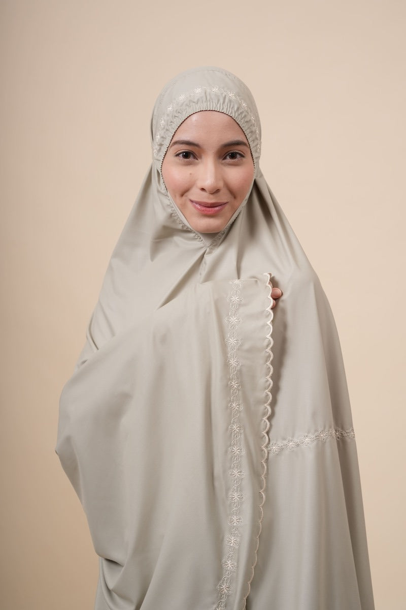 Broderie Naira is made from Khadijah Ultra Fine (KUF), a soft, breathable, durable, and quick-drying fabric that keeps you comfortable throughout your prayers. Inspired by the subtle beauty of Pearl Stone and delicate floral motifs, it features a clean and elegant design. The name “Naira,” derived from the Arabic word nūr meaning light, reflects its radiant and graceful look. Finished with fine floral embroidery along the headpiece, lining, and hem, and enhanced with subtle Pearl Stone details, Broderie Naira offers a simple yet refined touch for a comfortable and elegant prayer experience.