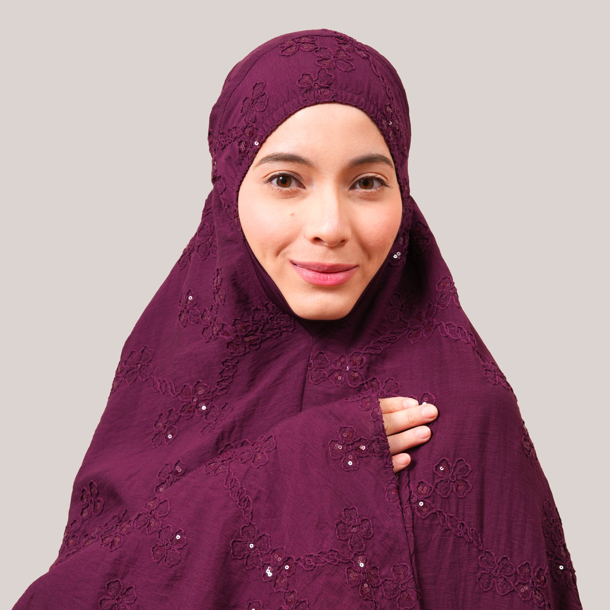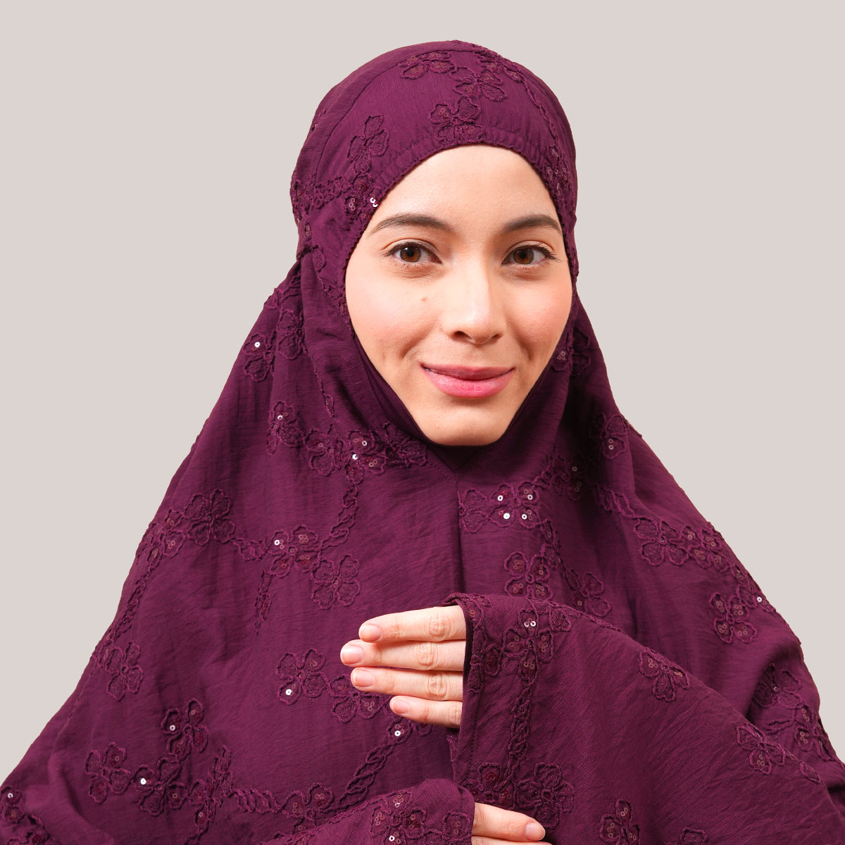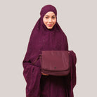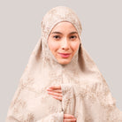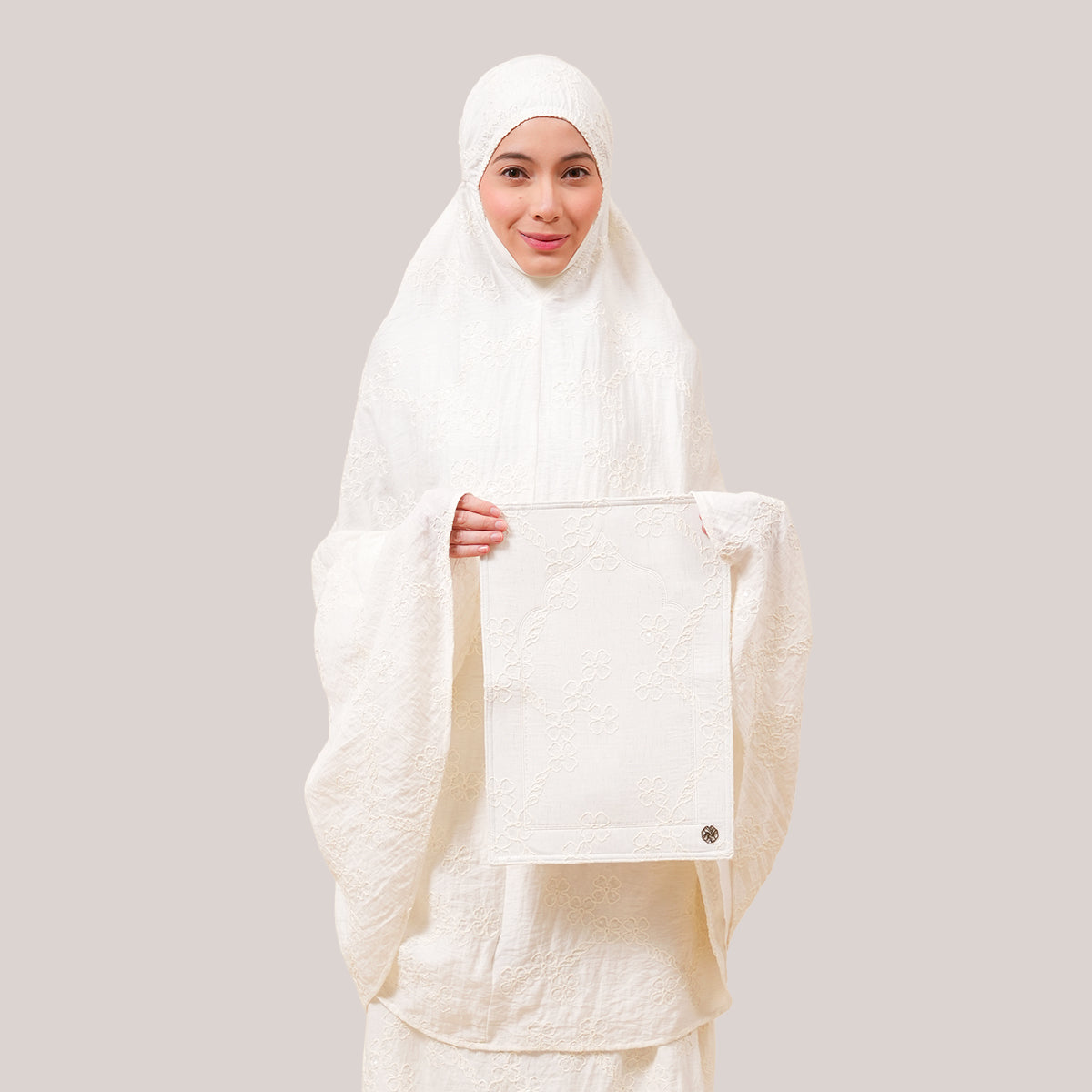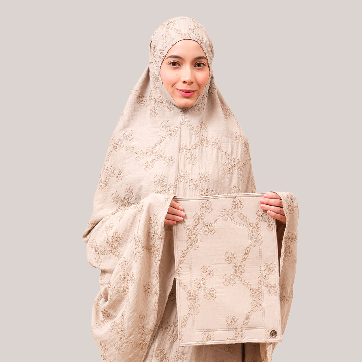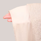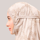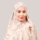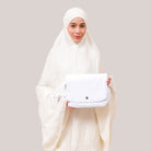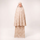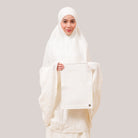 Broderie Sofeena features elegant all-over cord embroidery with subtle sequin details inspired by Mushaf motifs, creating a graceful and refined look. Lined with lightweight 50D four-way stretch fabric (95% polyester, 5% spandex), it offers gentle stretch and added comfort without feeling heavy. Complete with a matching minimalist pouch bag and sejadah in the same fabric, Sofeena is a practical and beautifully coordinated prayer set.