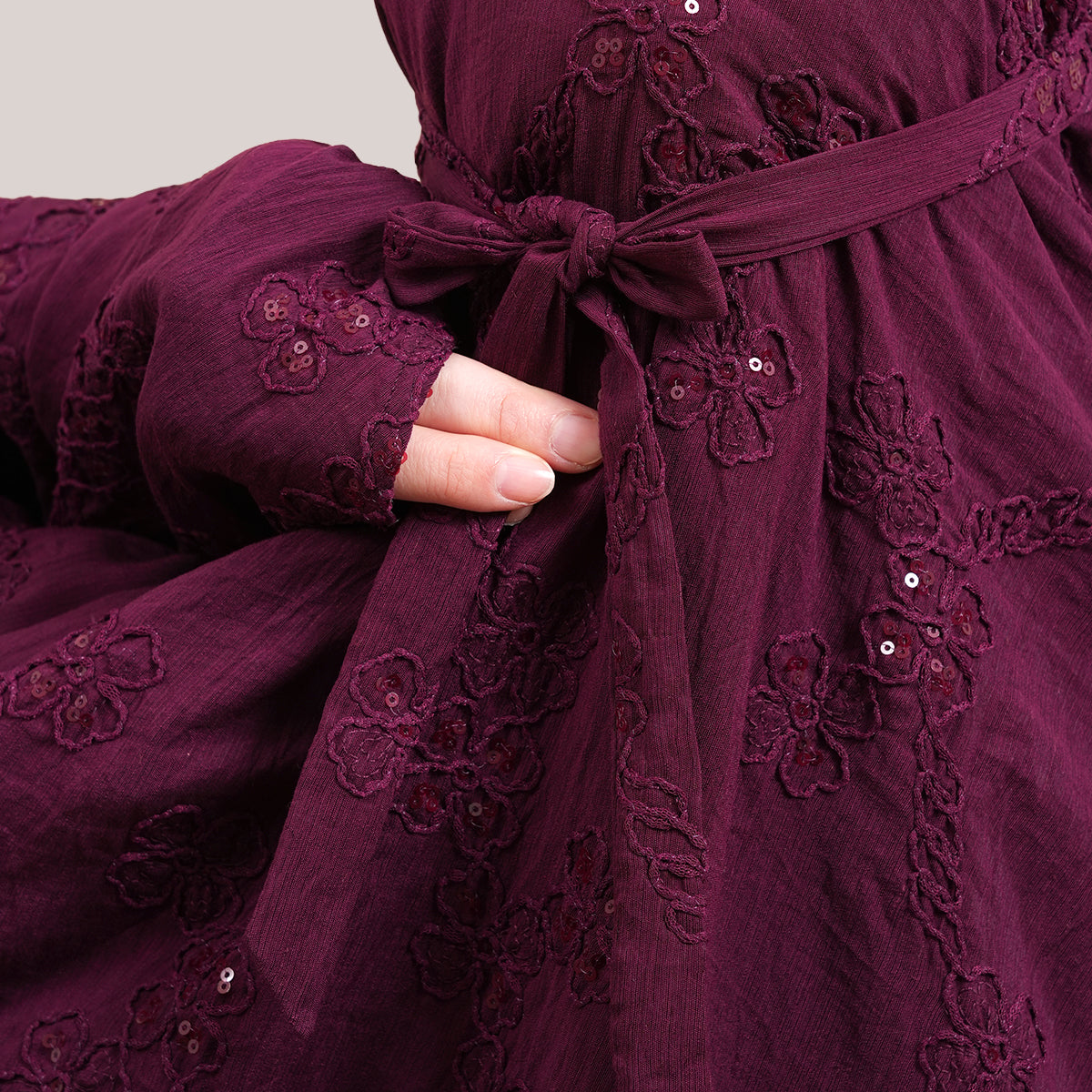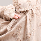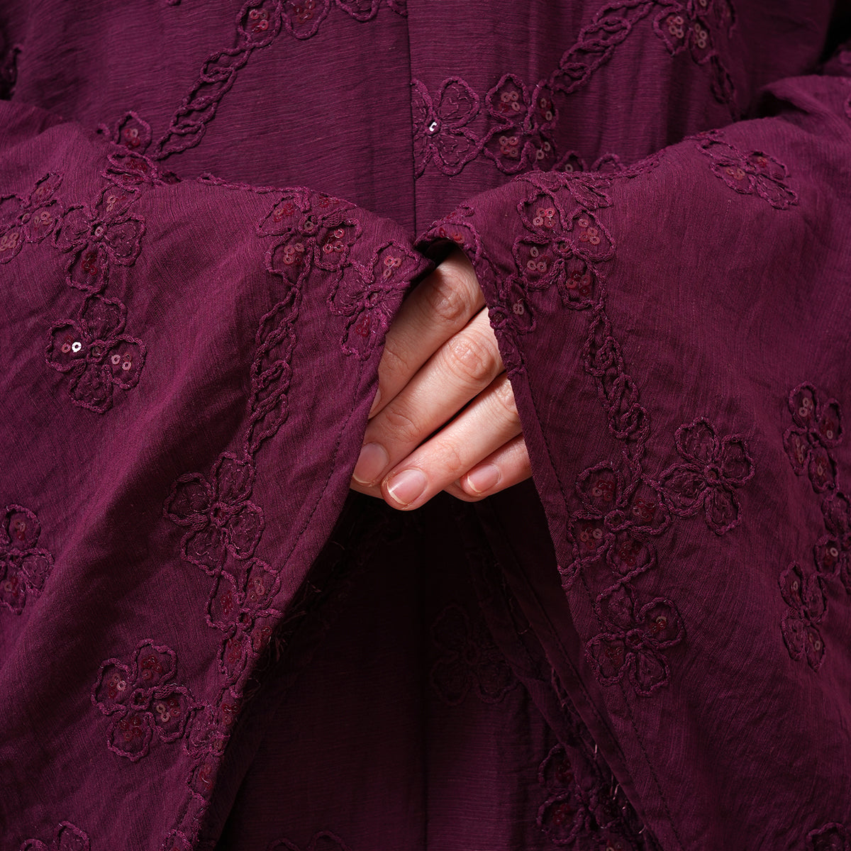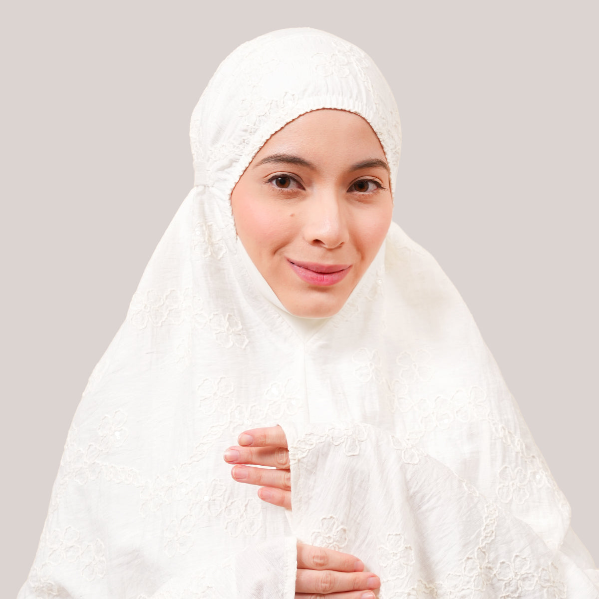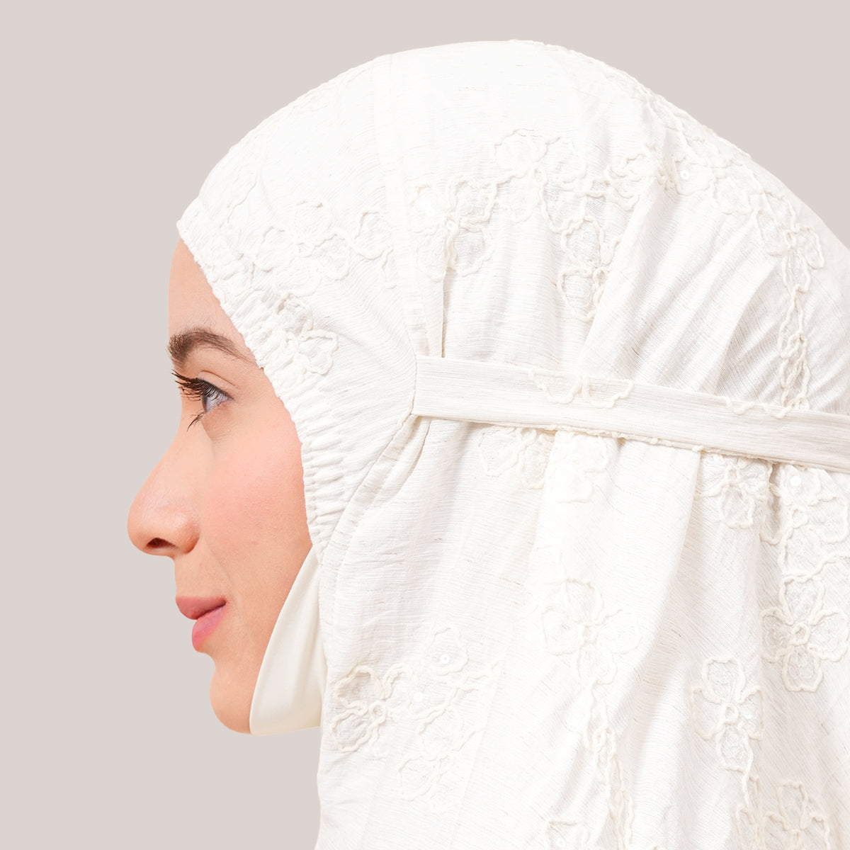Broderie Sofeena features elegant all-over cord embroidery with subtle sequin details inspired by Mushaf motifs, creating a graceful and refined look. Lined with lightweight 50D four-way stretch fabric (95% polyester, 5% spandex), it offers gentle stretch and added comfort without feeling heavy. Complete with a matching minimalist pouch bag and sejadah in the same fabric, Sofeena is a practical and beautifully coordinated prayer set.