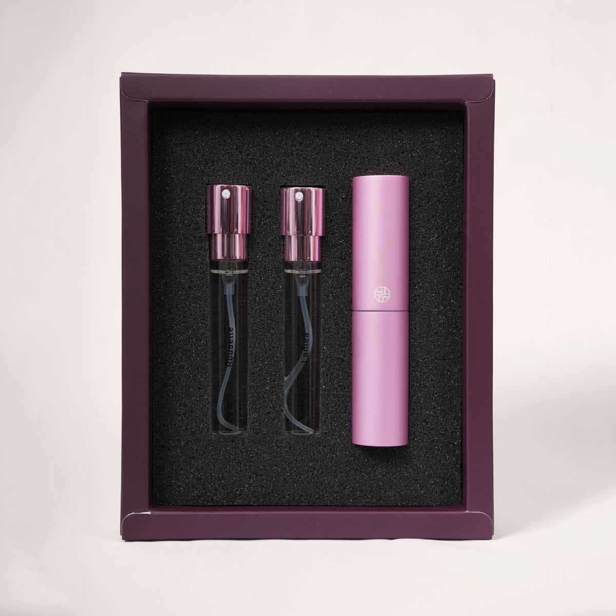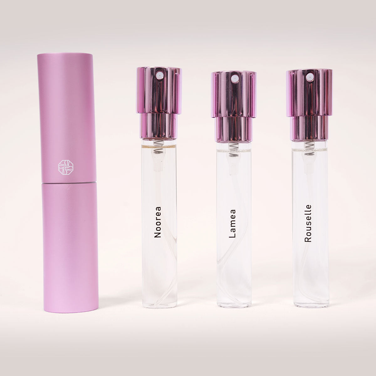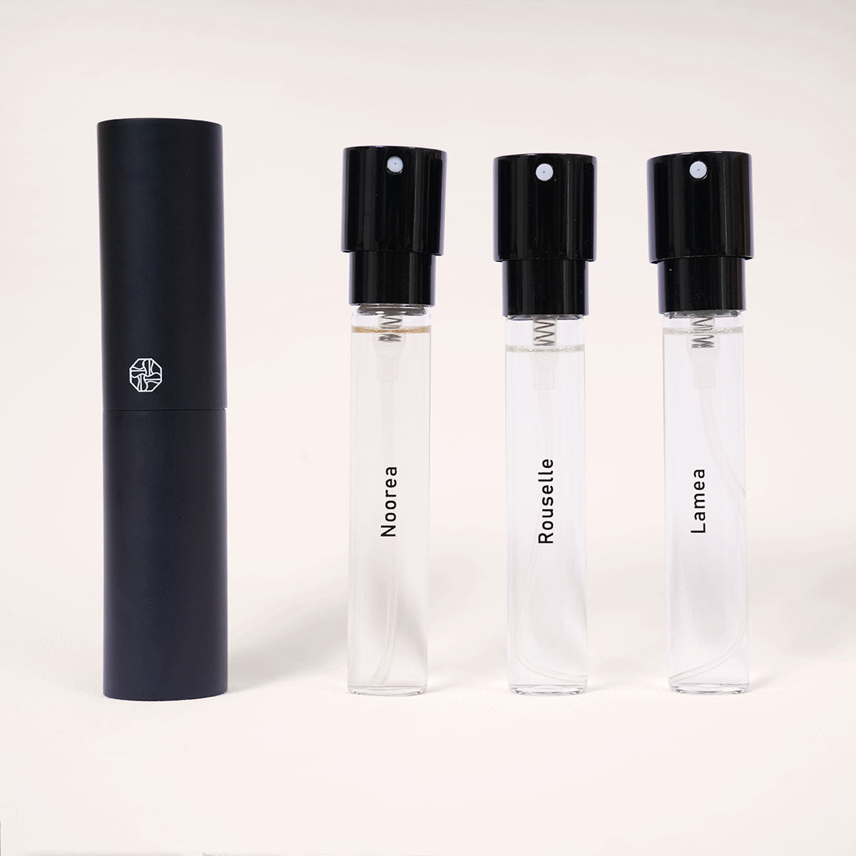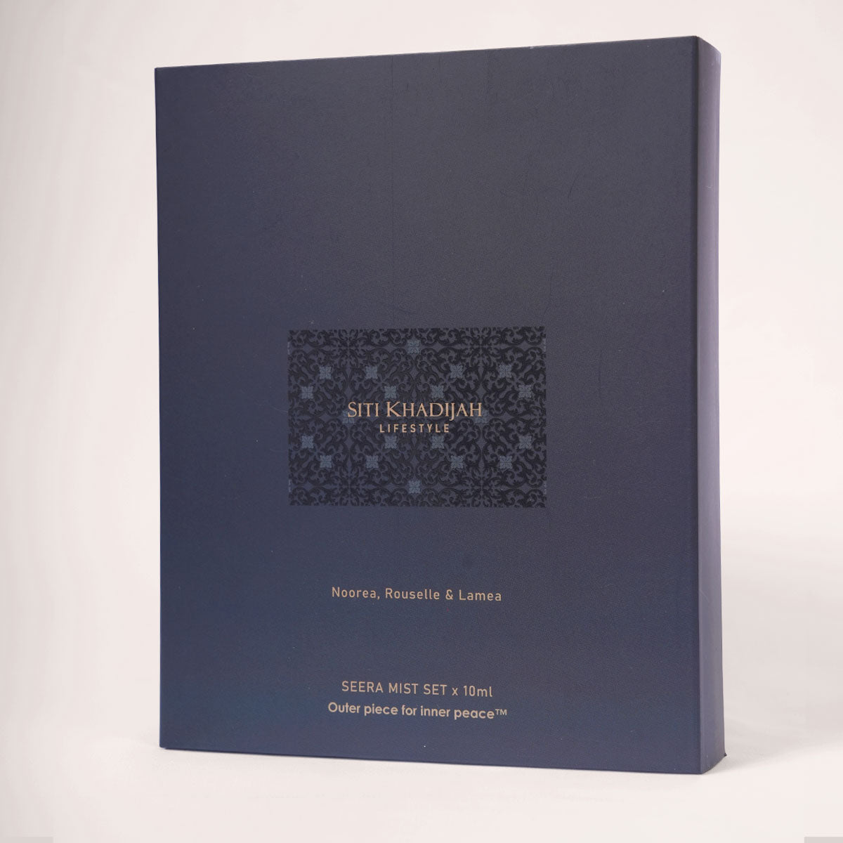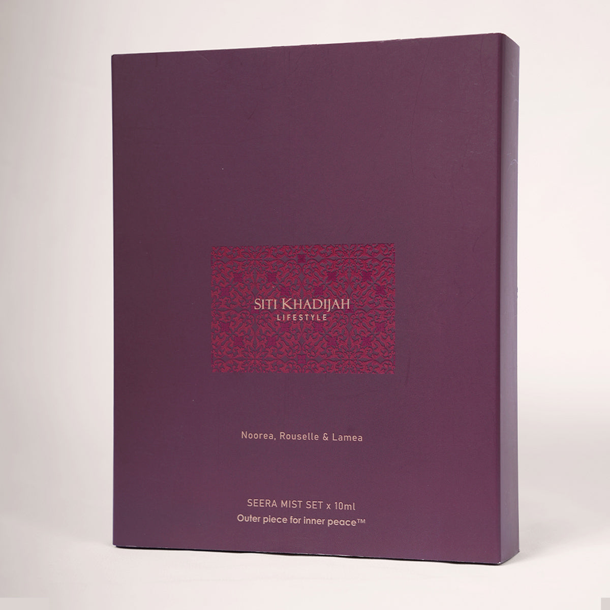 The Seera Mist Set is an exclusive collection of three prayer mists Noorea, Rouselle, and Lamea designed to provide peace and tranquility during every step of your spiritual journey. Inspired by the Mushaf Terengganu motif and named after the beautiful path of Sirah Nabawiyyah, this set symbolizes a good life and a straight path. Each 10ml bottle features a minimalist laser SK monogram and a refillable design, allowing you to easily switch between scents or carry them conveniently for travel. Available in sophisticated Black or Deep Maroon bottles to suit both feminine and classy tastes, these long-lasting mists are perfect for various settings, such as the home, workplace, or your prayer pouch, making them an ideal gift for loved ones.