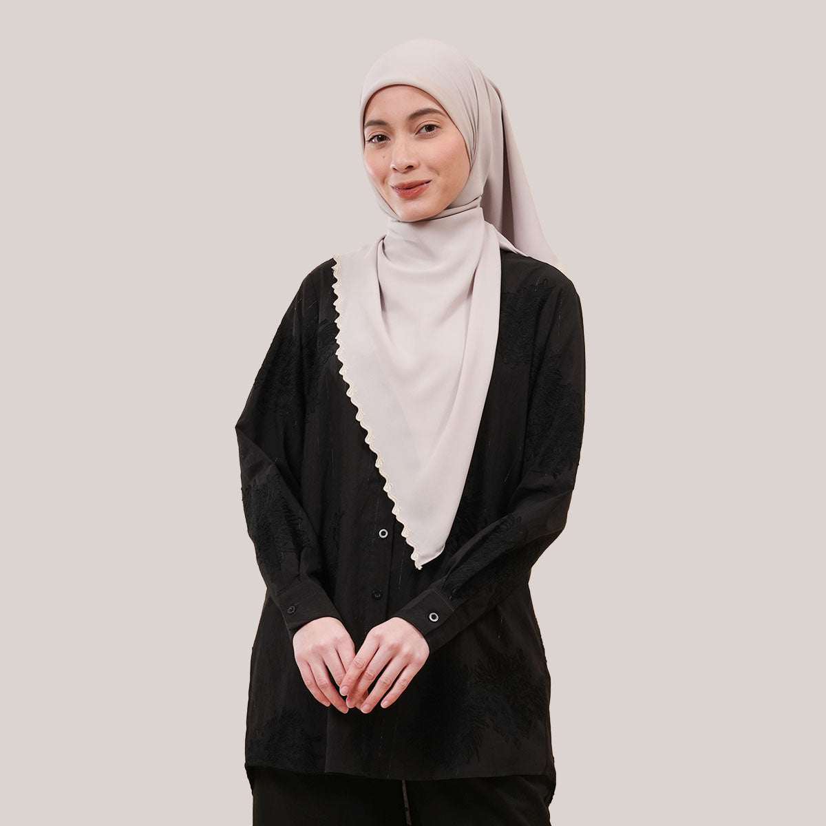 Inspired by a classic silhouette, this blouse features elegant, subtle embroidery that adds a feminine touch without being over the top. Designed with a loose, structured cut that does not cling to the body, it offers a modest and neat appearance suitable for both work and casual occasions. The blouse is lightweight and cooling for all-day comfort, finished with practical buttoned cuffs for ease of movement.