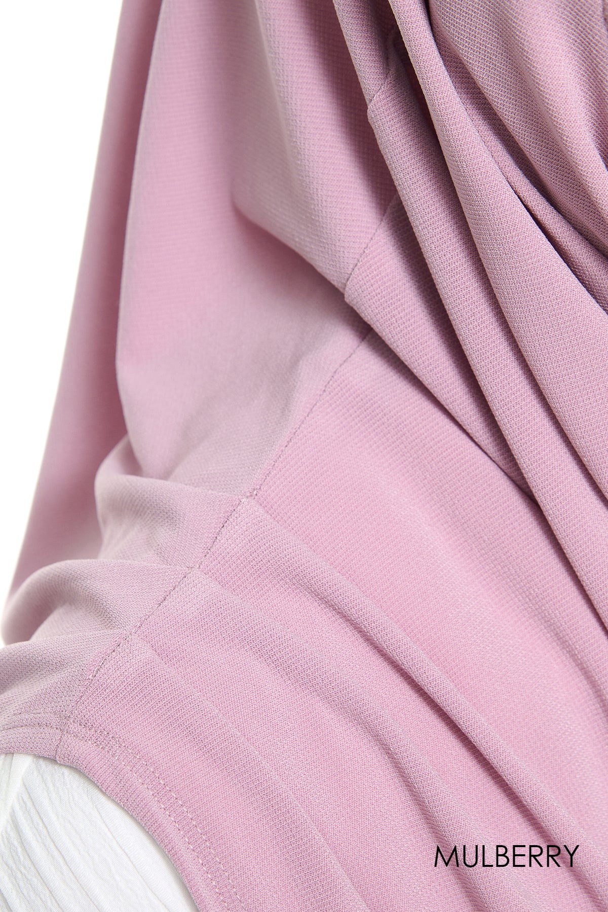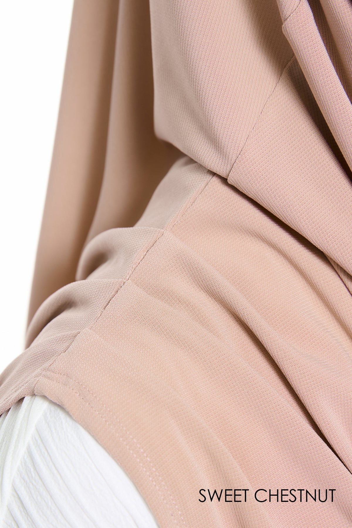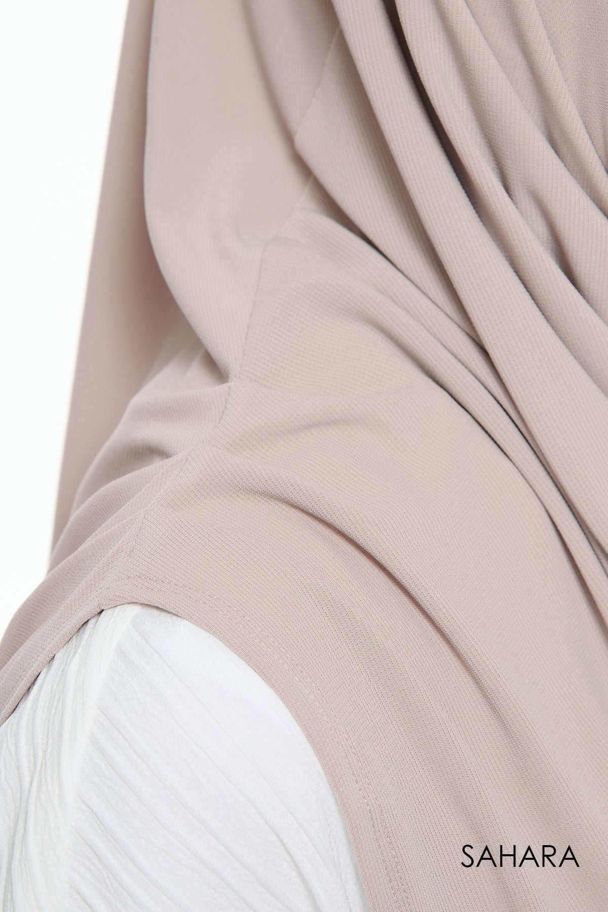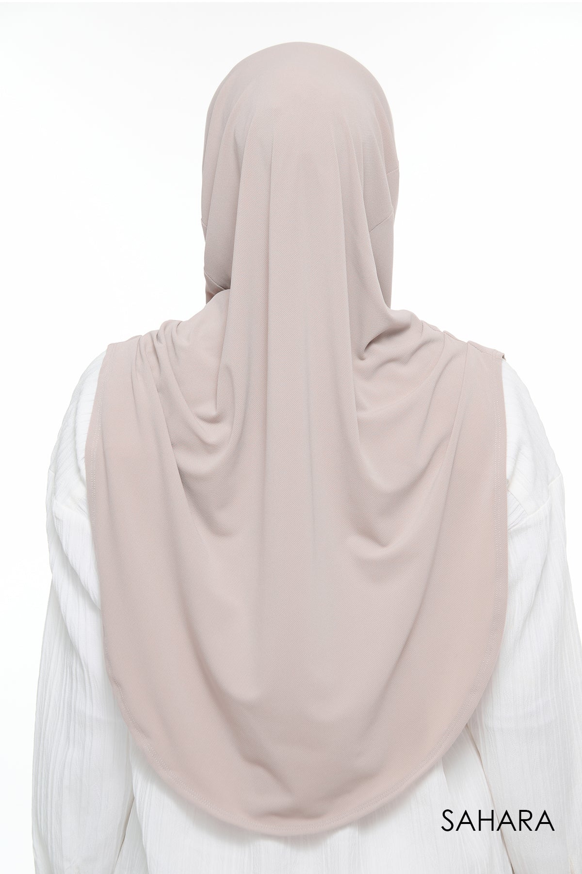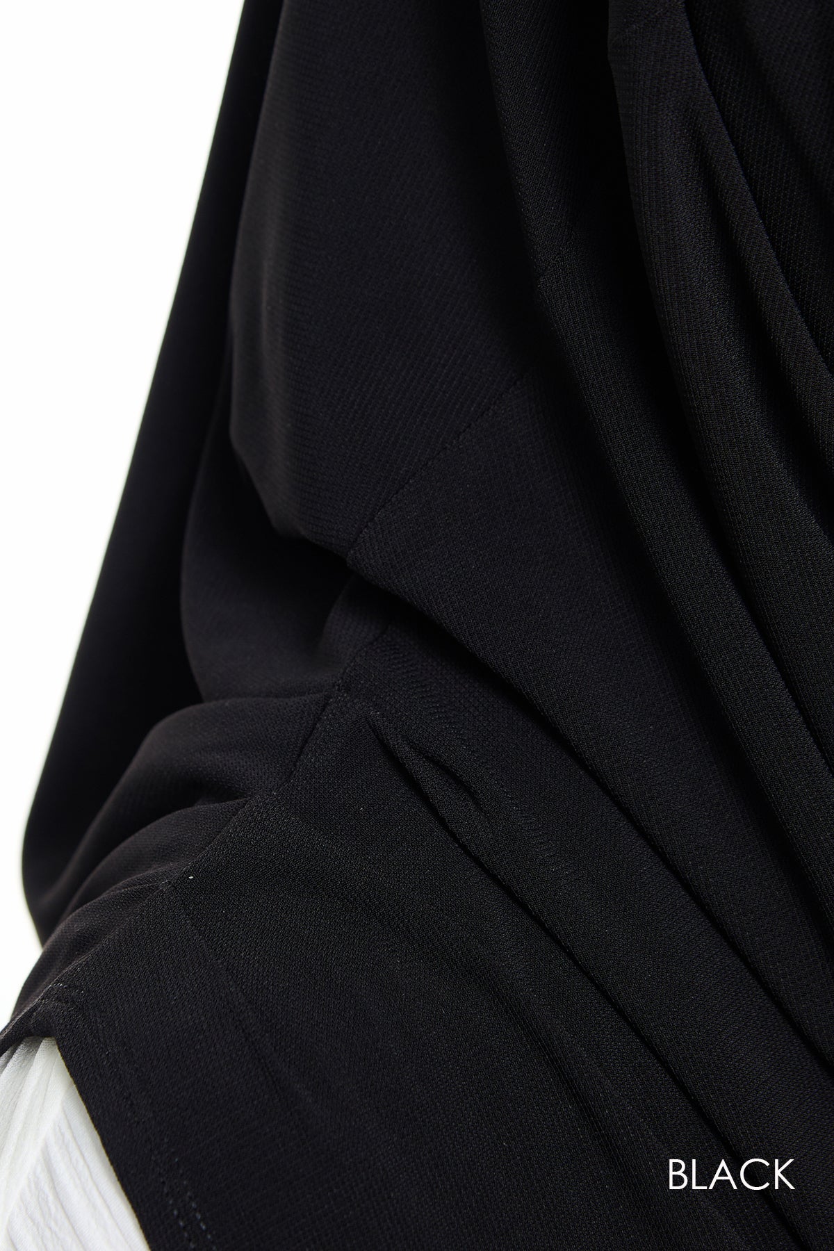 Made to resemble a complete shawl, it has a seamless front and a pleated design to guarantee a fabulous look but with minimal effort. Made from a twill-textured fabric of poly spandex and easy to shape awning (chiffon) in plain colors.