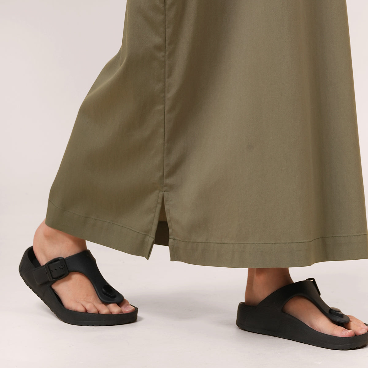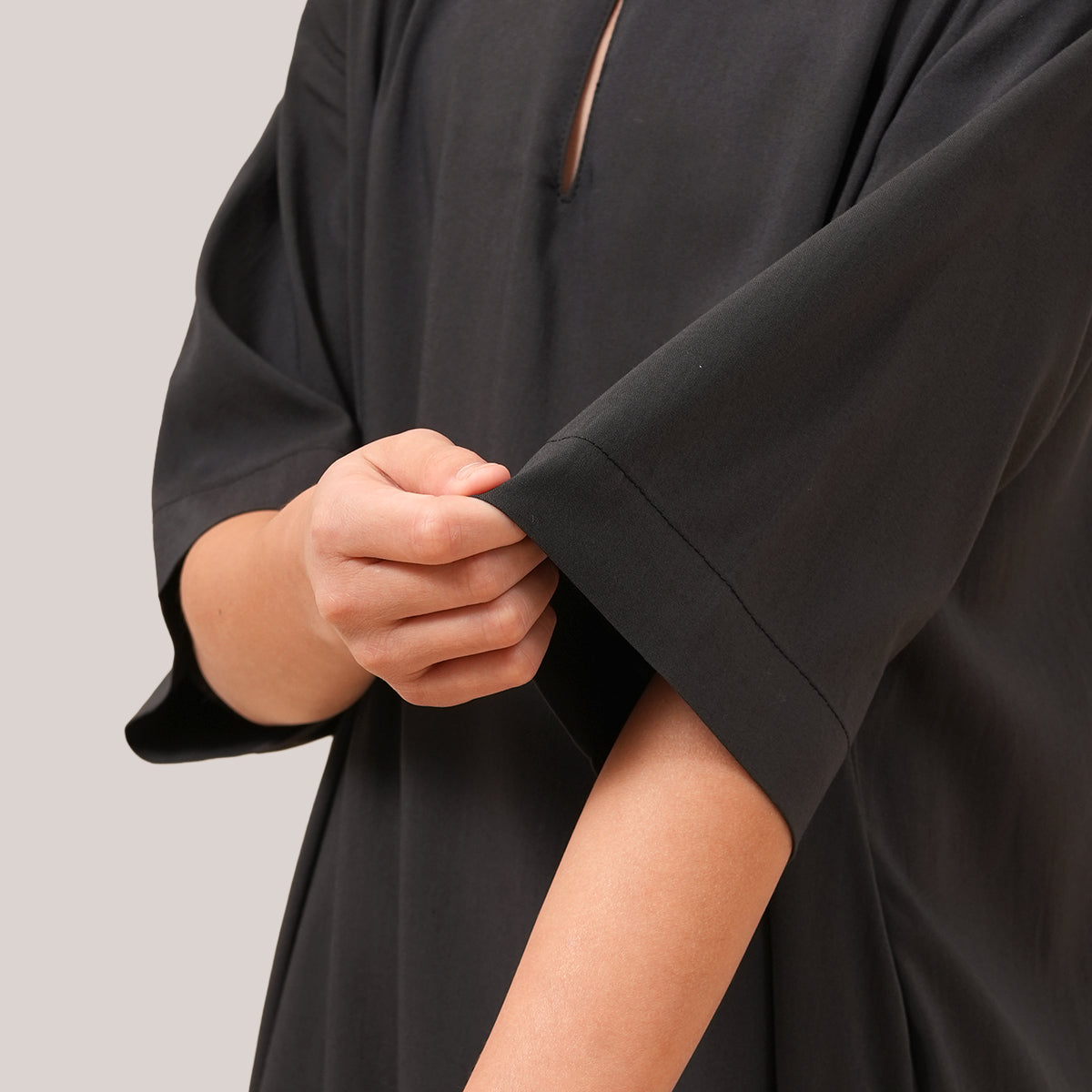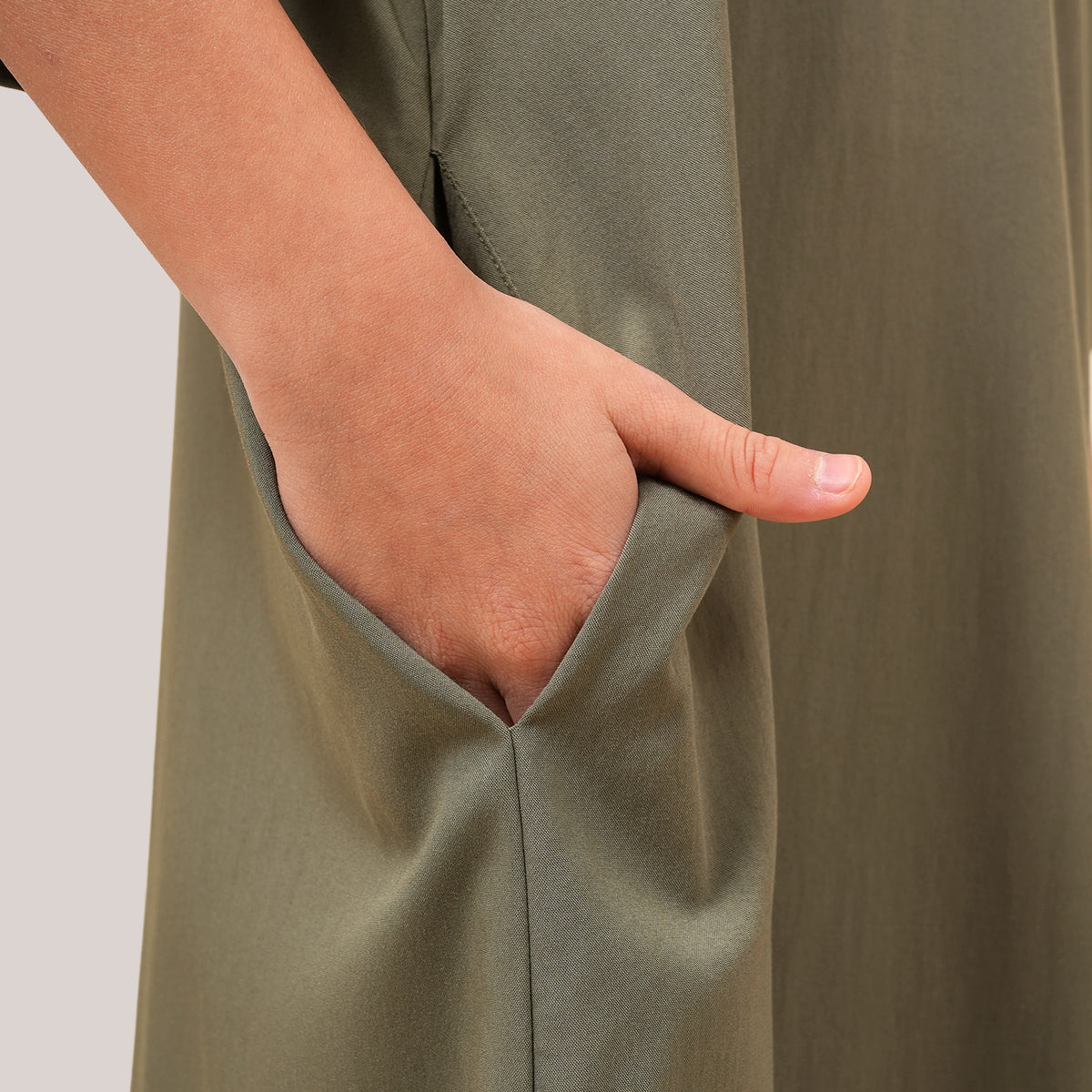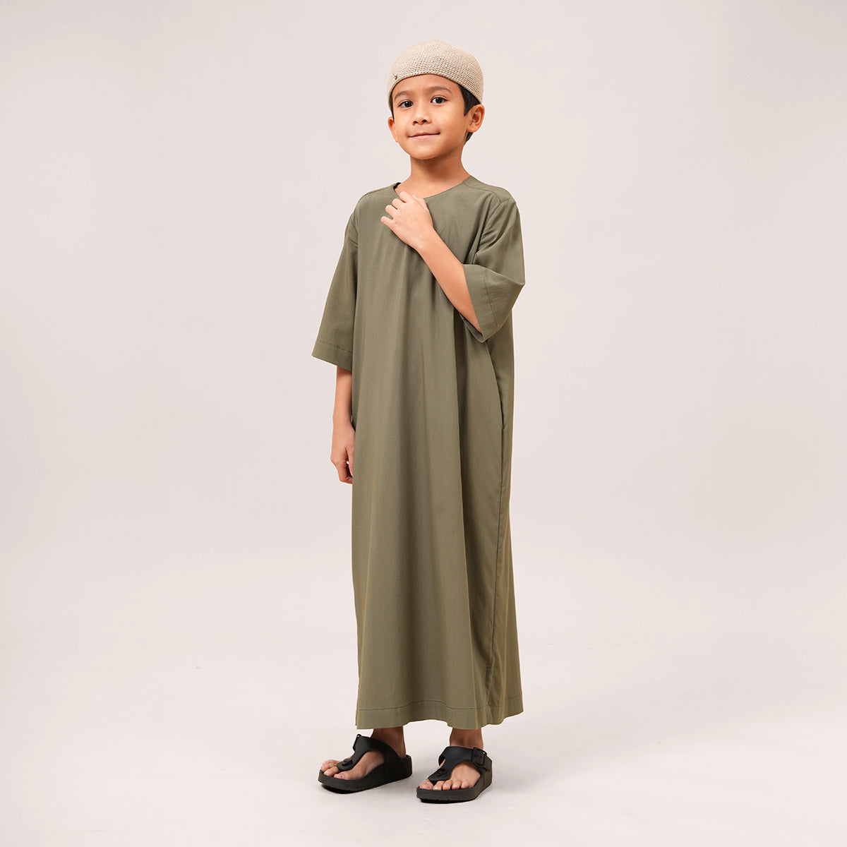 Mikhail Thobe Kids is soft, cool, and comfortable for active children. The stretch fabric allows easy movement while keeping its shape throughout the day. Designed with a front pocket and side slits for practicality, it can also be paired with the adult Saif Thobe Casual for a neat and matching Raya look.