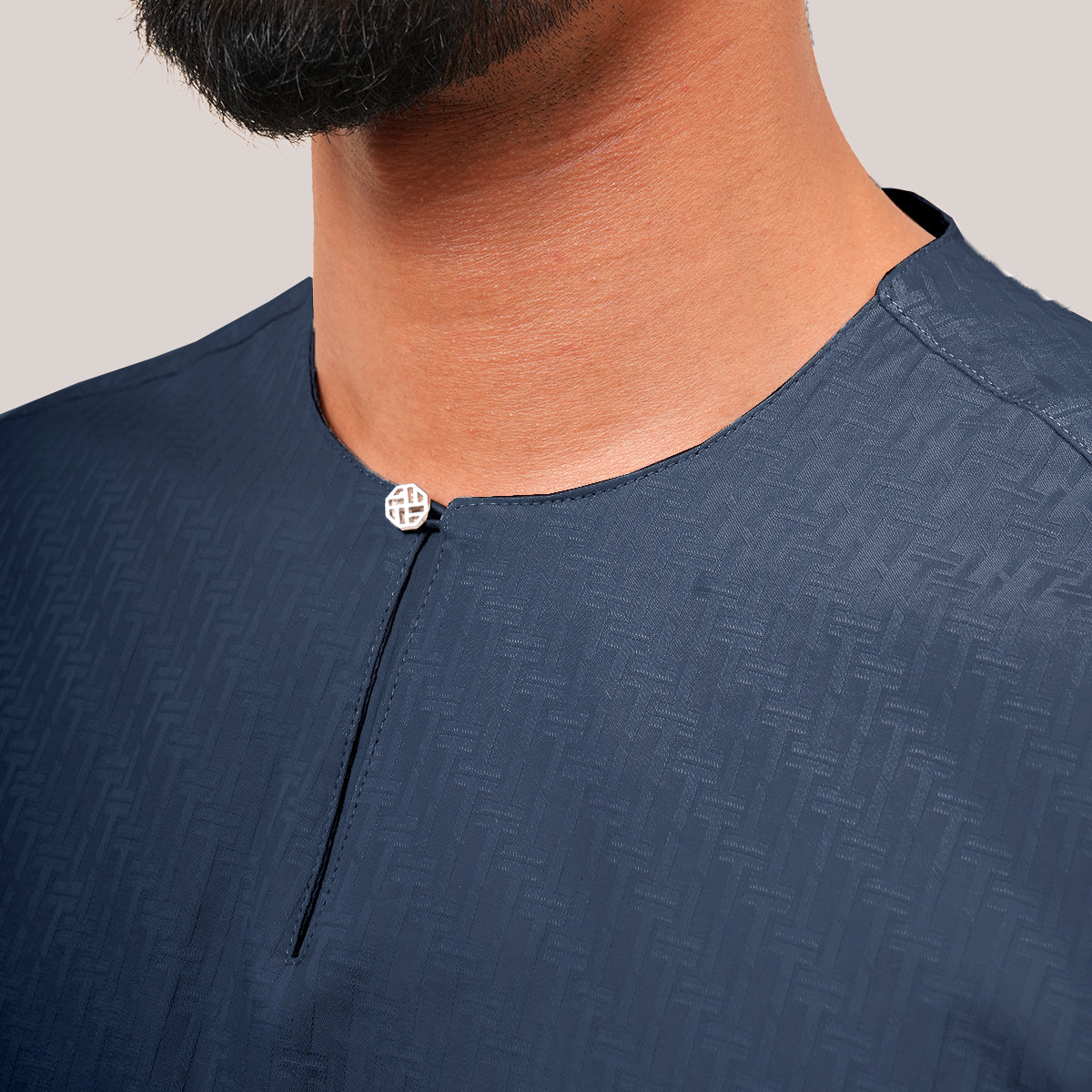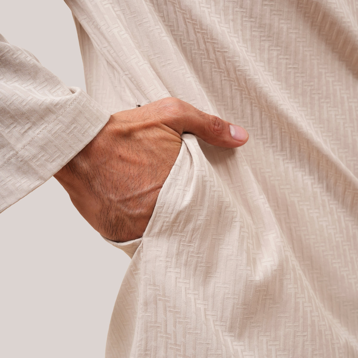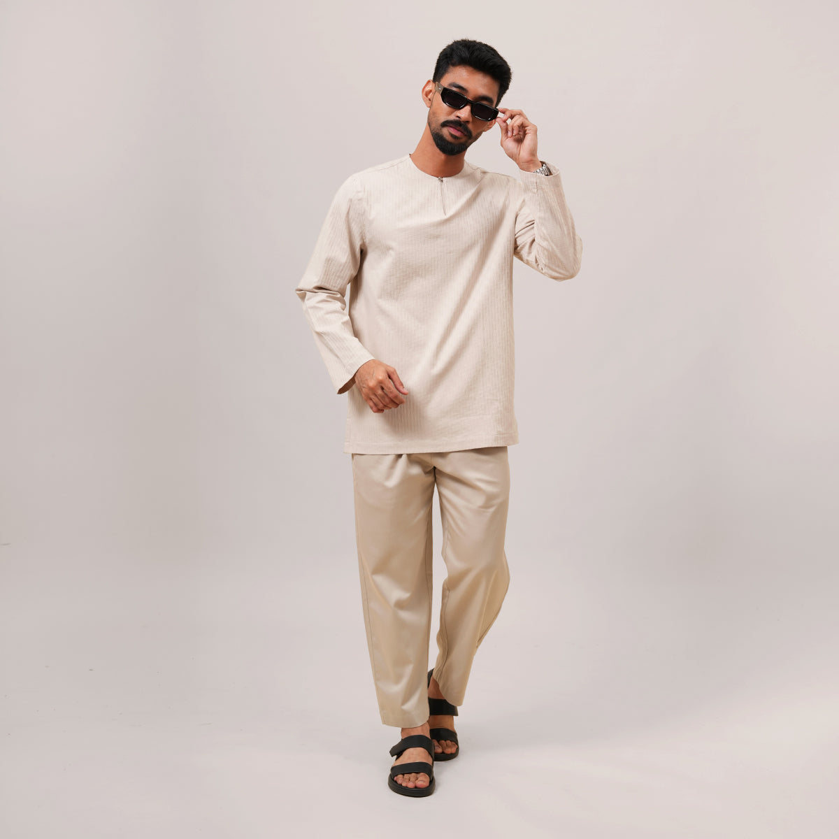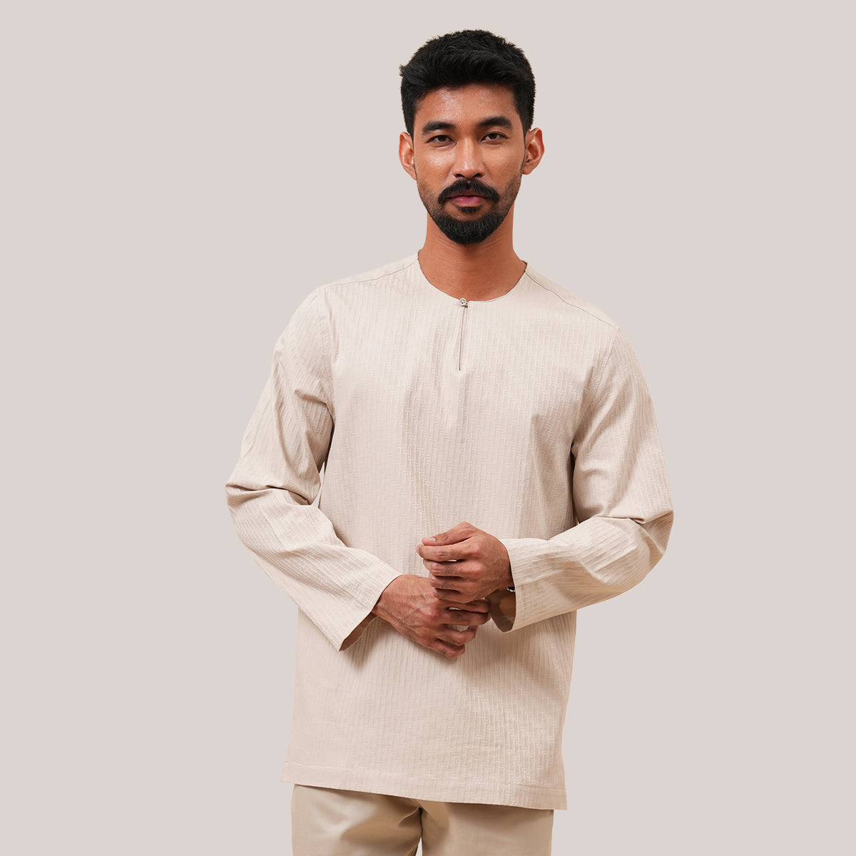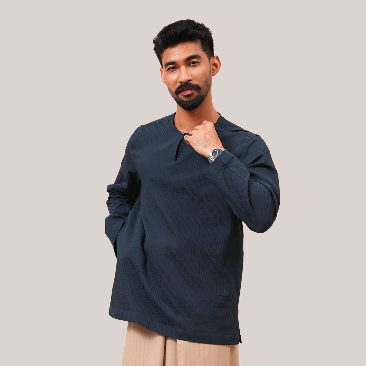The Hadrey Top is made from 100% cotton and features a full TEMAN monogram jacquard design for a clean and modern look. It is suitable for both casual and formal wear. Designed with a modest regular fit and long sleeves, it offers comfort and ease, making it suitable for ibadah and everyday use.