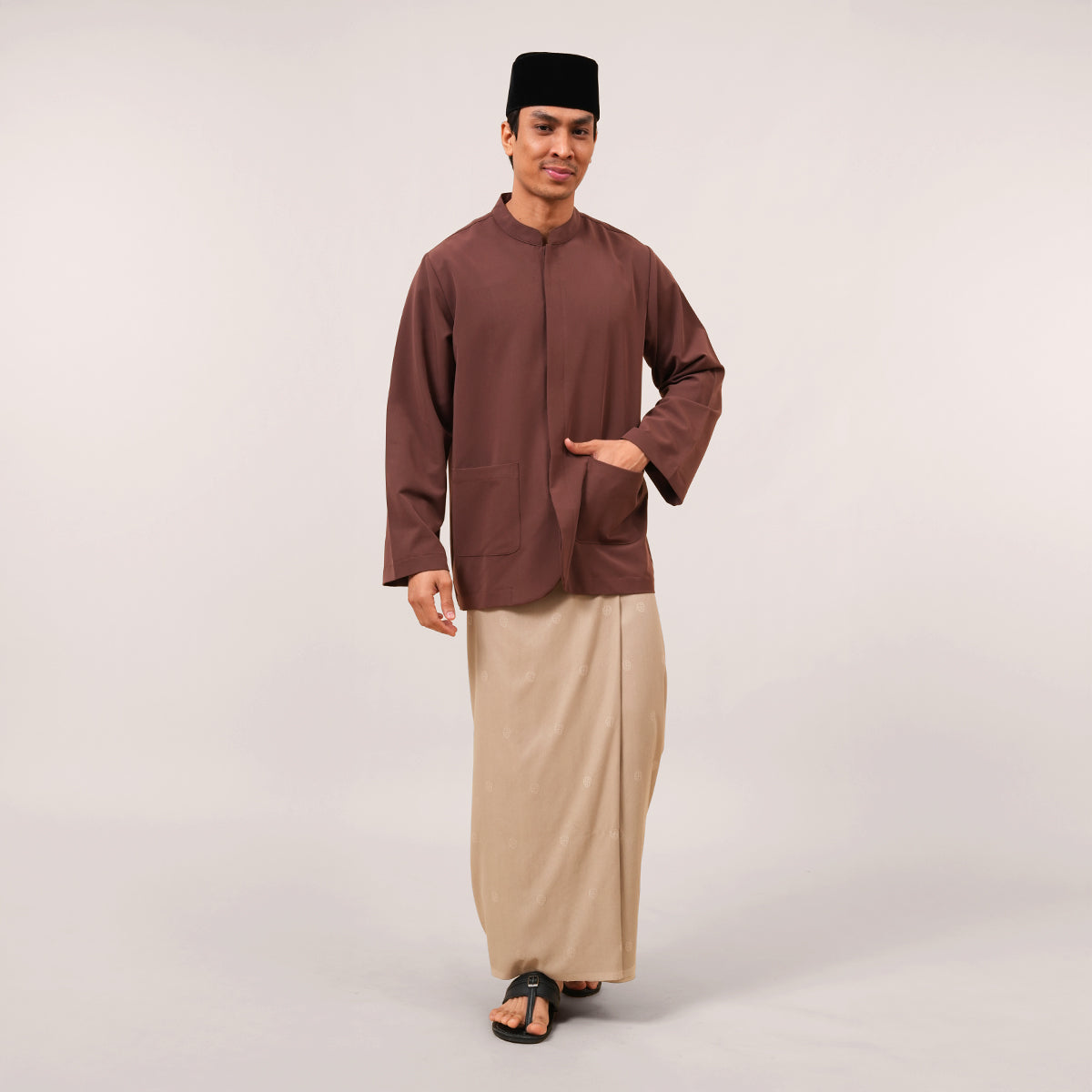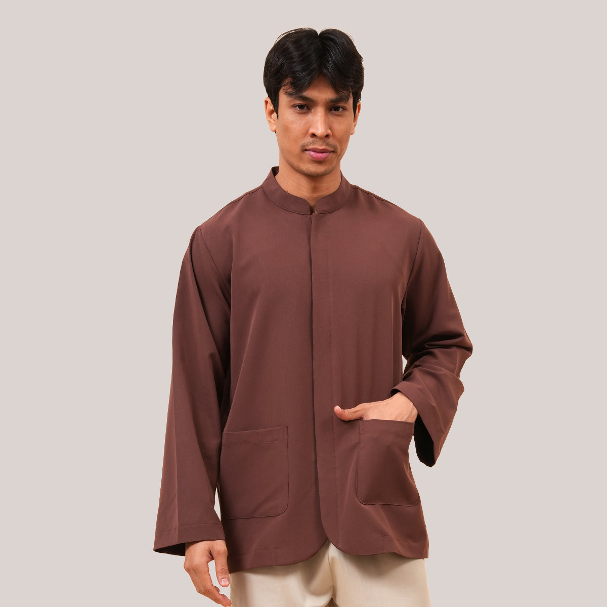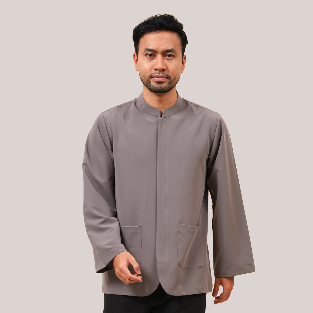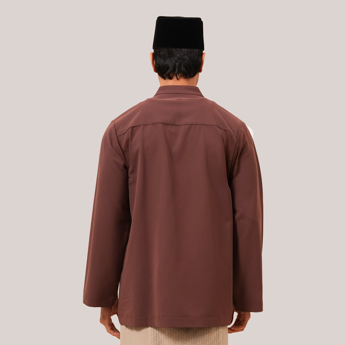 The Bilal Top is made from a comfortable blend of polyester, rayon, and spandex for a soft and flexible feel. Inspired by the traditional Penang Baju Taqwa, it features a regular long-sleeve fit with a clean mandarin collar. Designed with hidden front buttons for better coverage during movement, it is suitable for both ibadah and formal wear. It also includes a front pocket for added practicality, while the modest cut ensures a relaxed and comfortable fit.