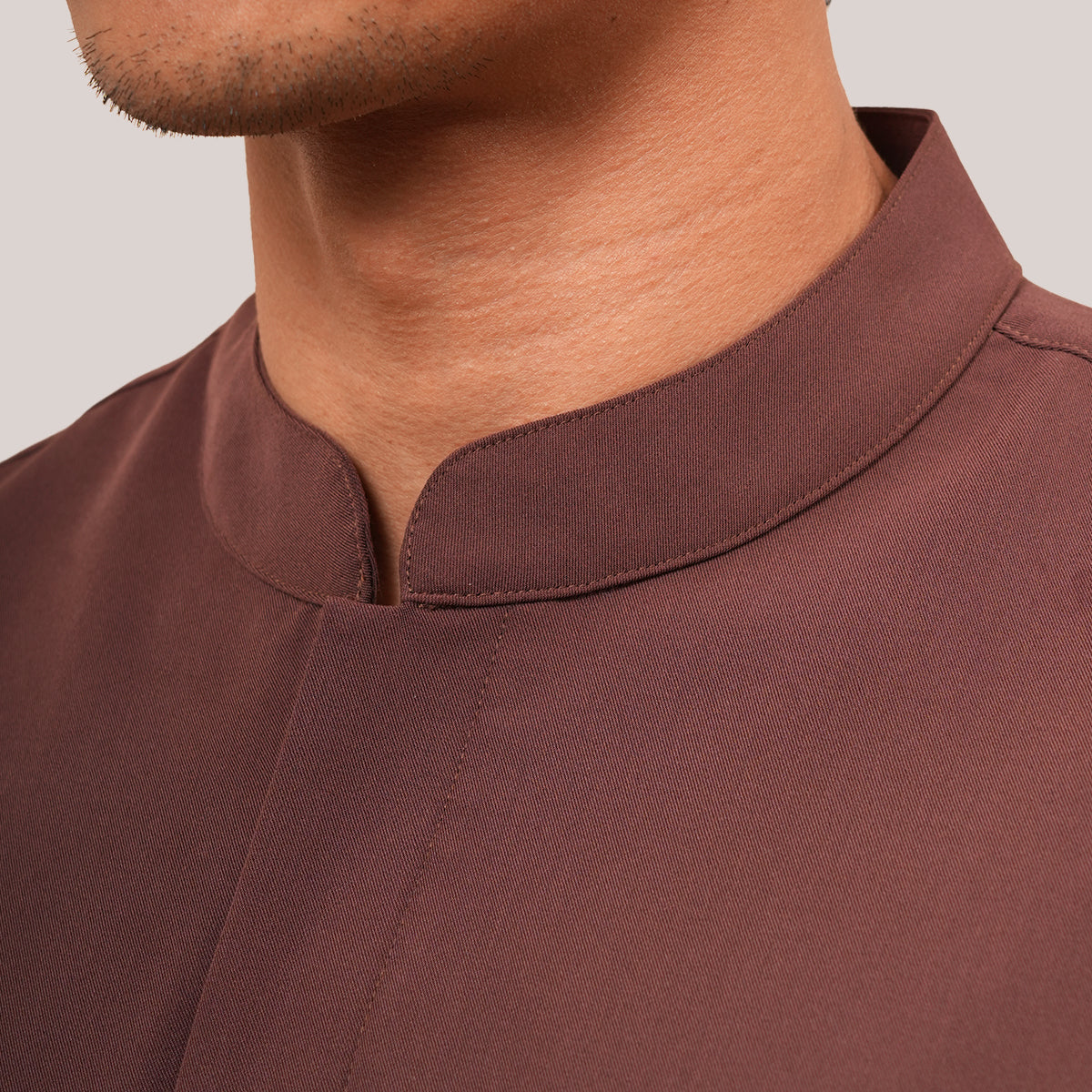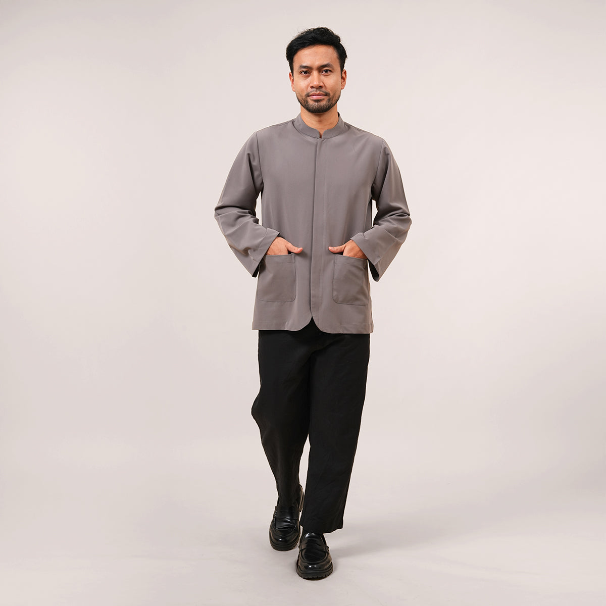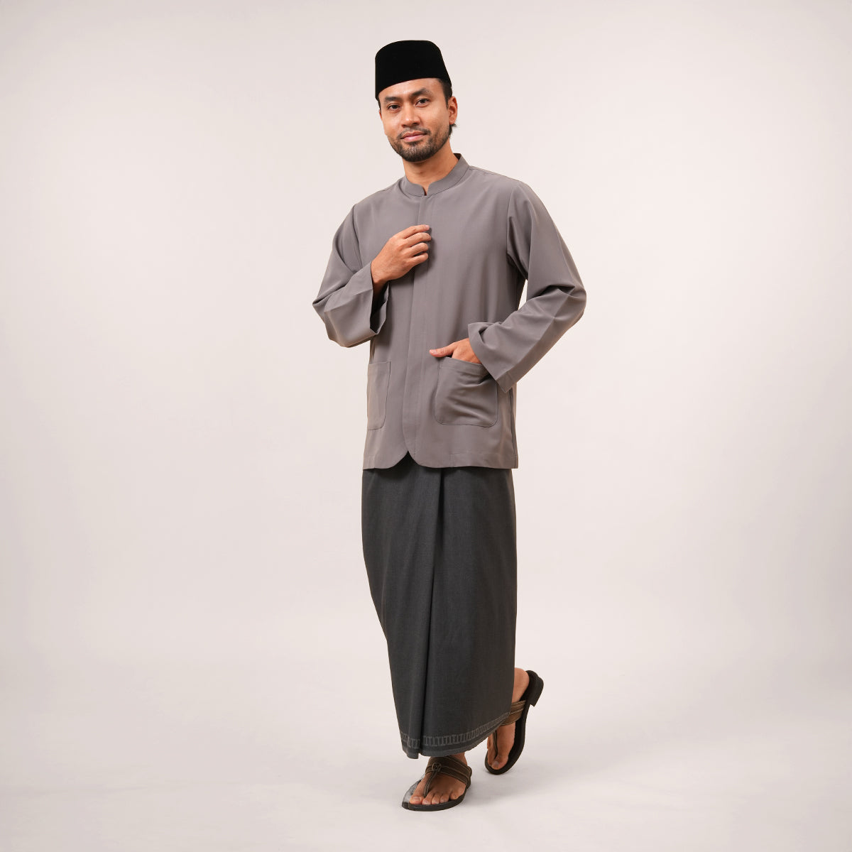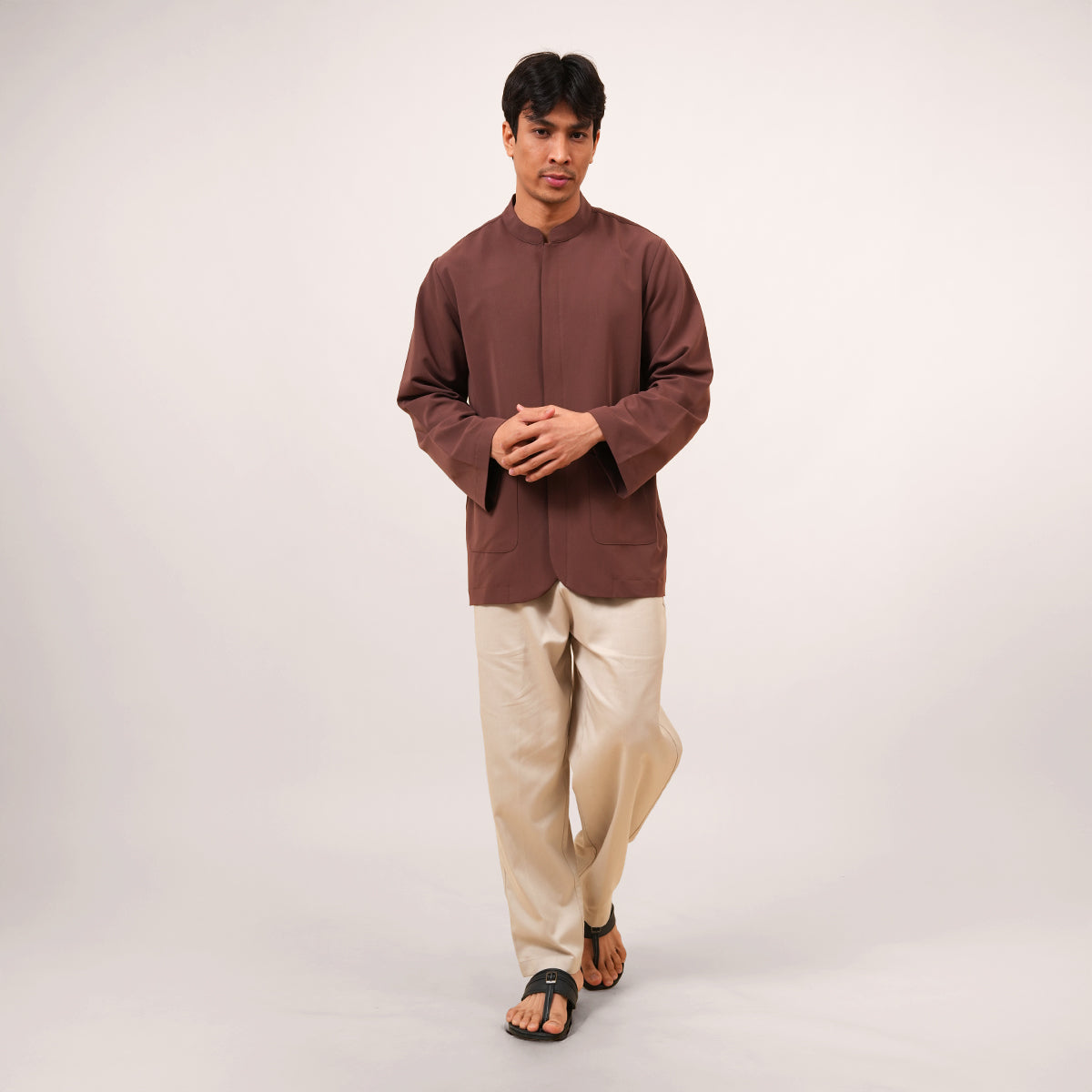 The Bilal Top is made from a comfortable blend of polyester, rayon, and spandex for a soft and flexible feel. Inspired by the traditional Penang Baju Taqwa, it features a regular long-sleeve fit with a clean mandarin collar. Designed with hidden front buttons for better coverage during movement, it is suitable for both ibadah and formal wear. It also includes a front pocket for added practicality, while the modest cut ensures a relaxed and comfortable fit.