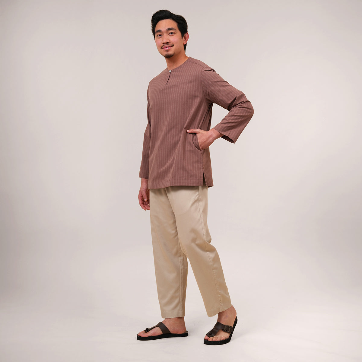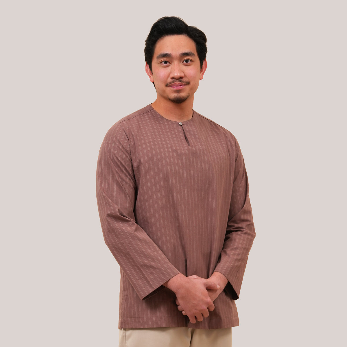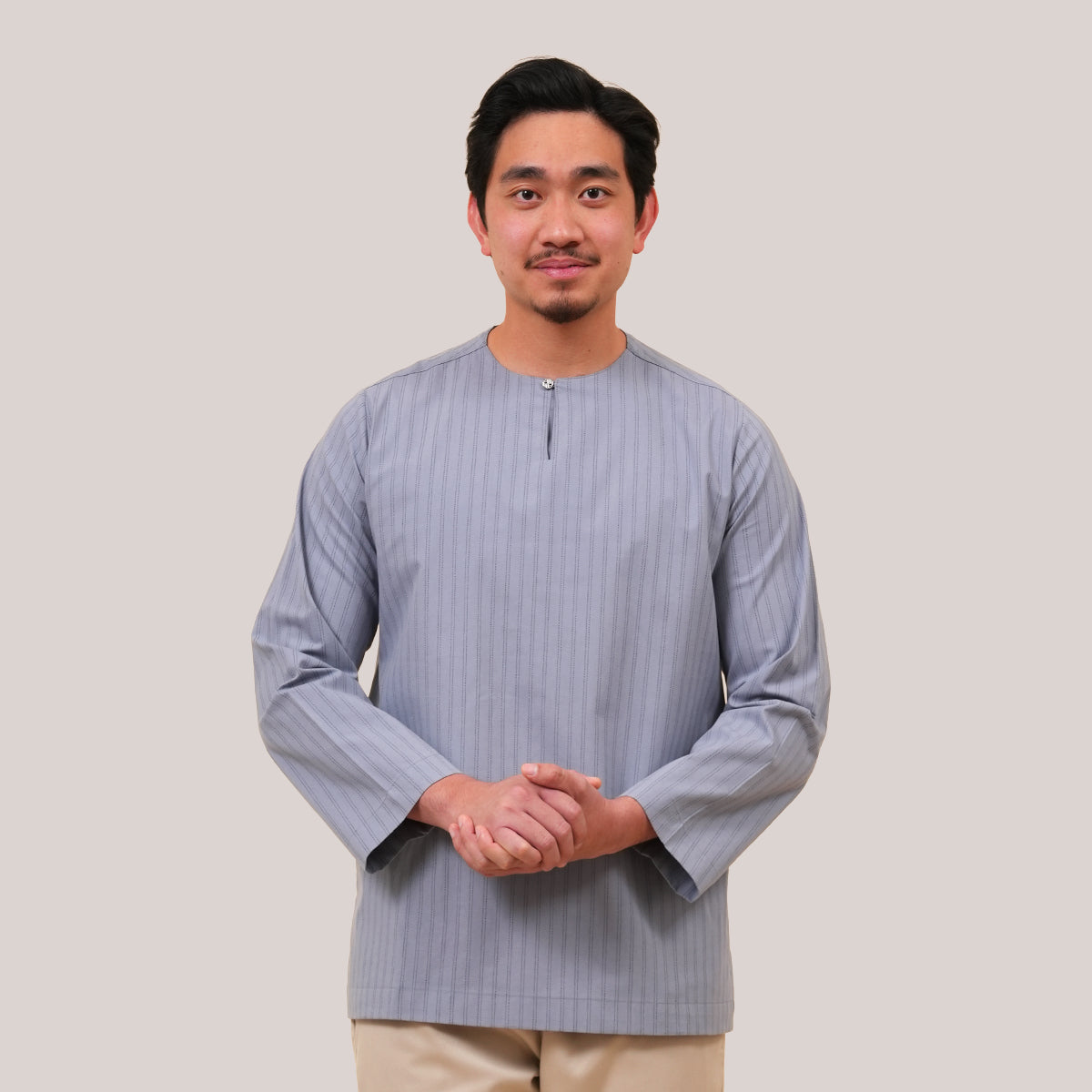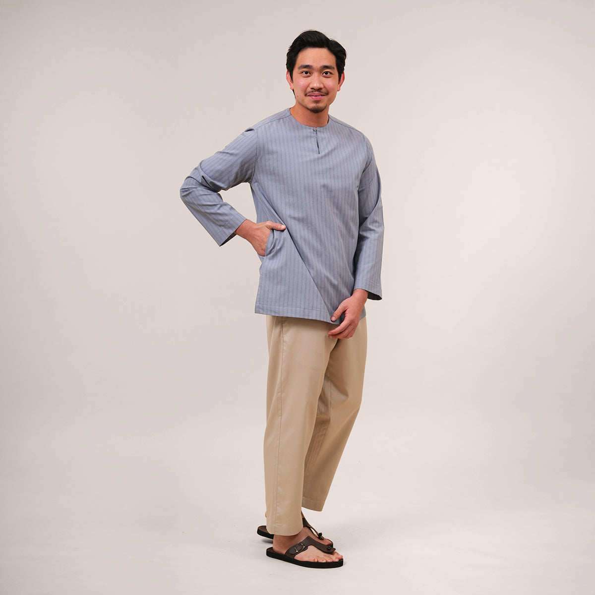 The Imran Top is made from a comfortable 60% cotton and 40% polyester blend, featuring a modern double-stripe design in trendy neutral and pastel colours. Inspired by the Aidan Top, it comes with a teluk belanga collared neckline for a subtle traditional touch. With side pockets, side slits, and a relaxed regular fit, this modest long-sleeve top offers comfort and ease of movement, making it suitable for ibadah, formal occasions, or everyday wear.
