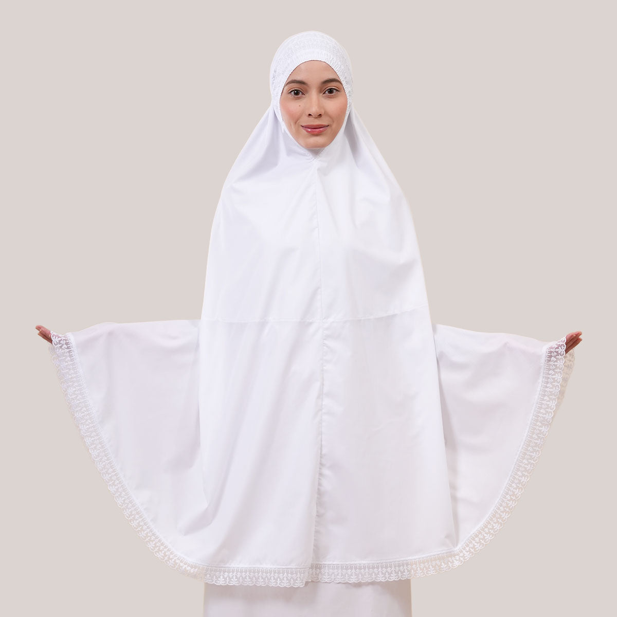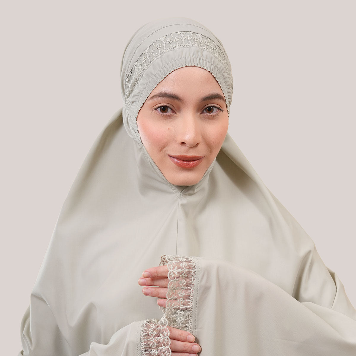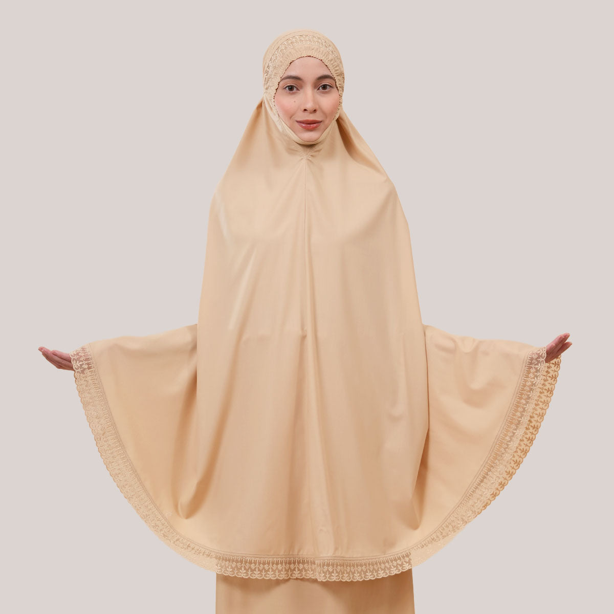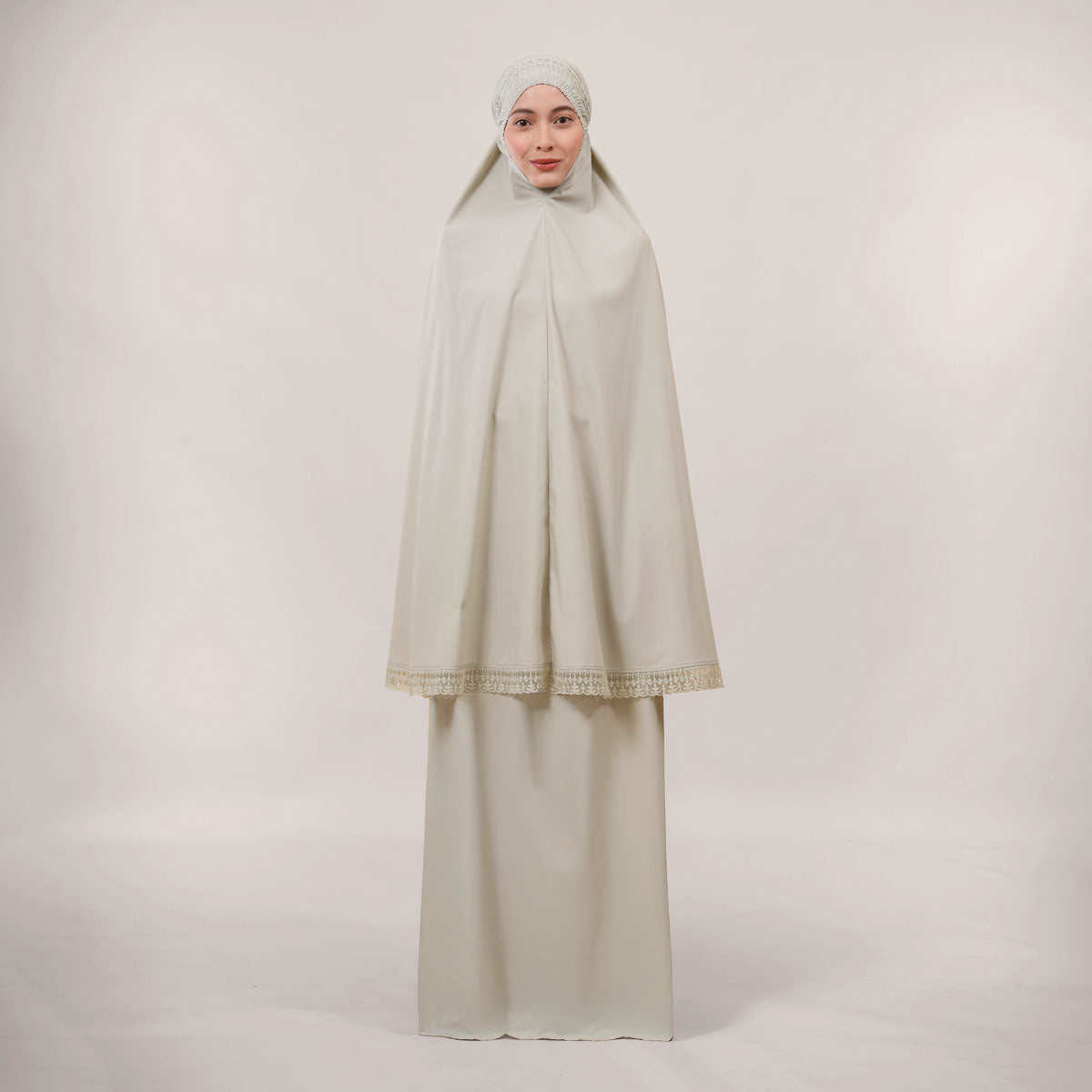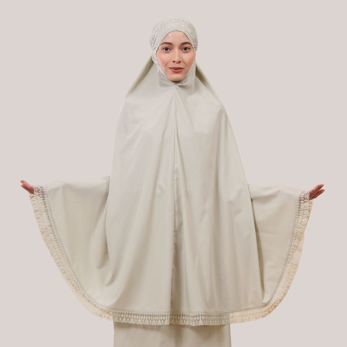Modish Dafiya is crafted from breathable and soft KBF fabric, designed for comfortable prayer without heat or irritation. Inspired by Mushaf motifs, it features a minimalist yet elegant net lace design that adds a subtle touch of luxury, making it suitable for daily wear or as a thoughtful gift. The name Dafiya, meaning comfort and pleasantness, reflects its warm and gentle character, while the finely stitched net lace finishing at the edges enhances its refined and graceful appearance.