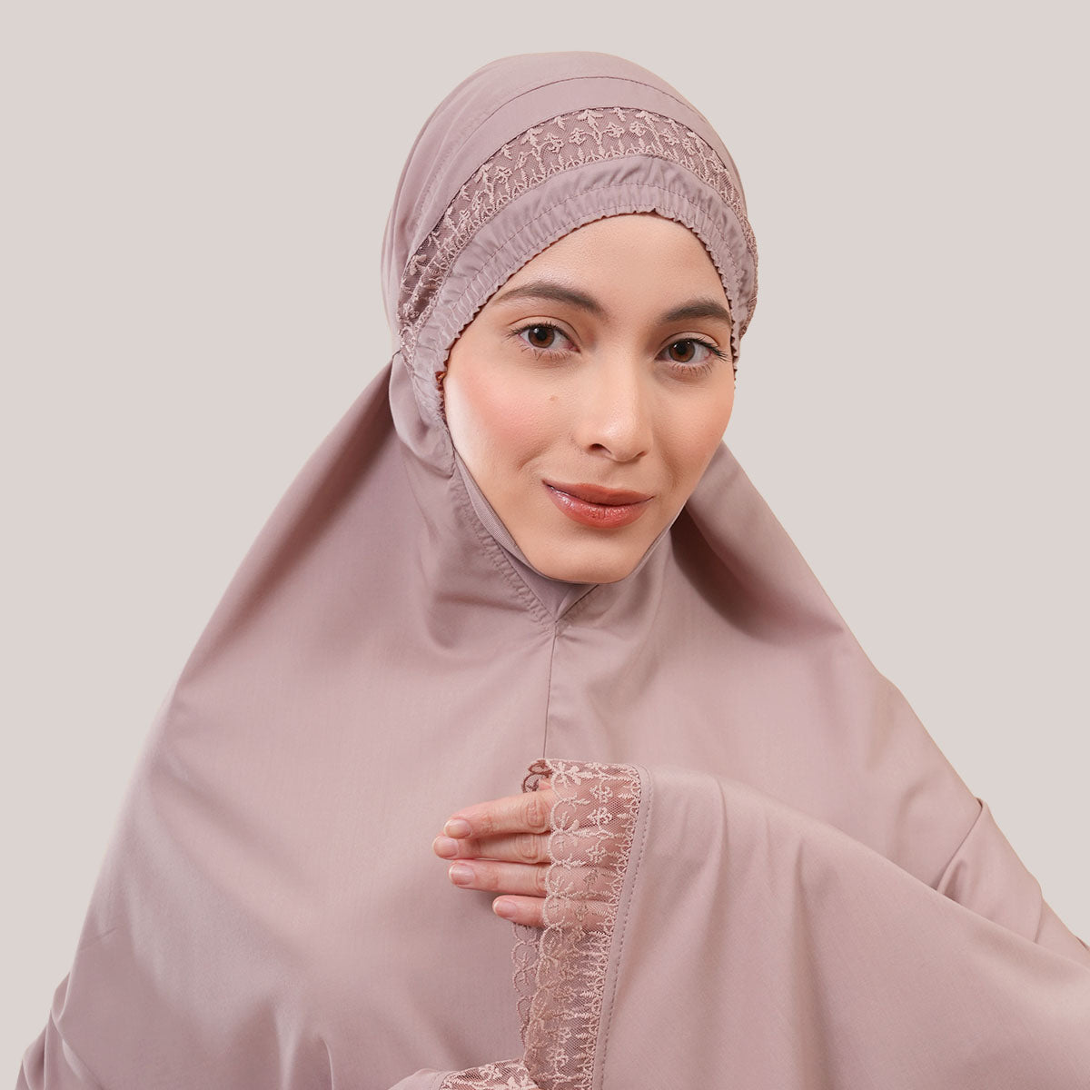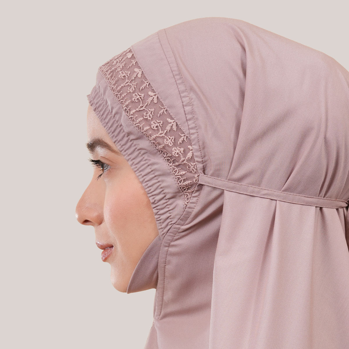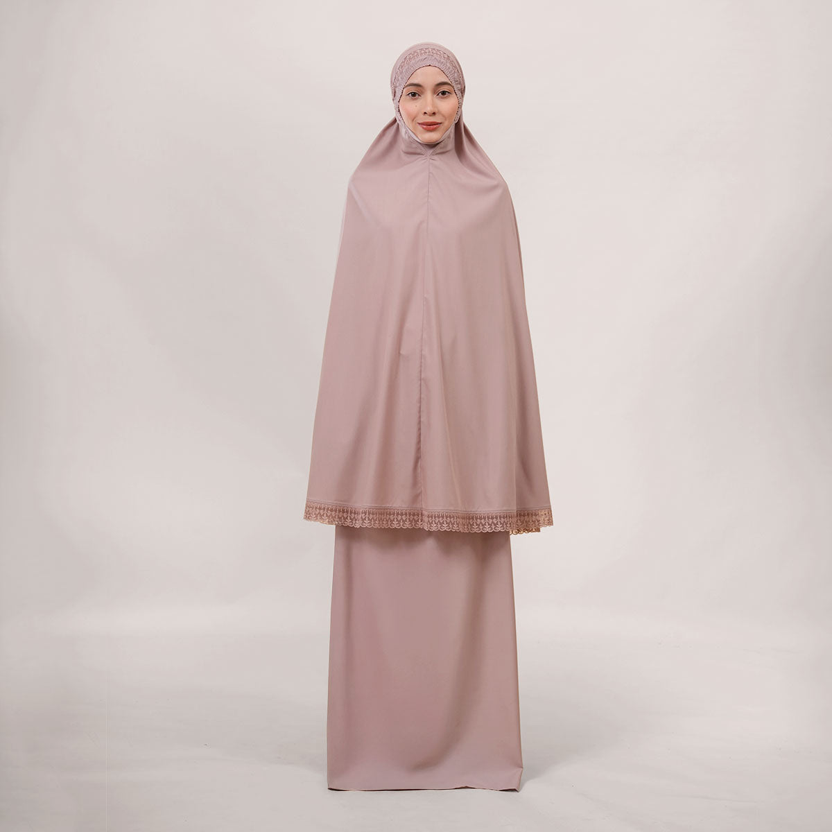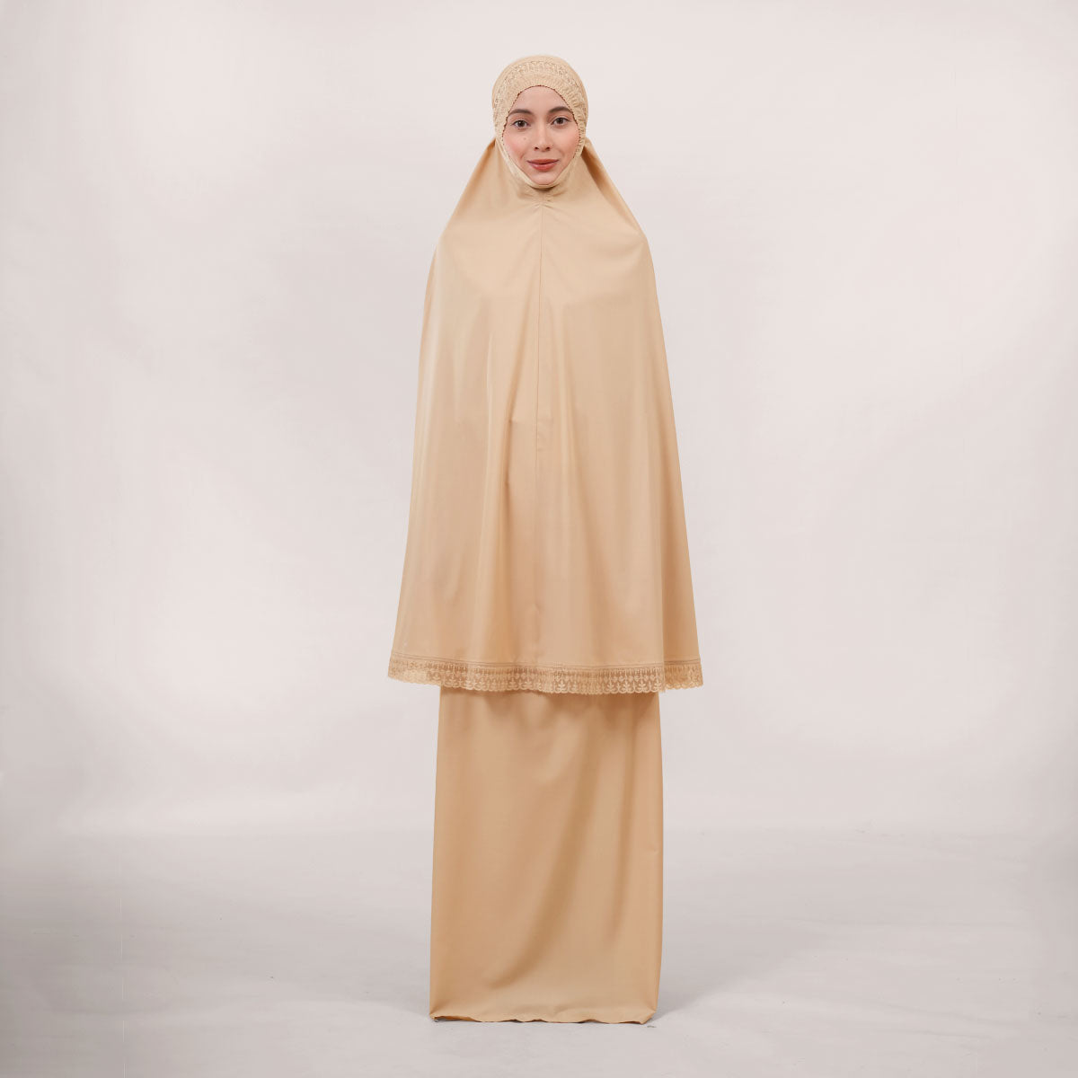 Modish Dafiya is crafted from breathable and soft KBF fabric, designed for comfortable prayer without heat or irritation. Inspired by Mushaf motifs, it features a minimalist yet elegant net lace design that adds a subtle touch of luxury, making it suitable for daily wear or as a thoughtful gift. The name Dafiya, meaning comfort and pleasantness, reflects its warm and gentle character, while the finely stitched net lace finishing at the edges enhances its refined and graceful appearance.