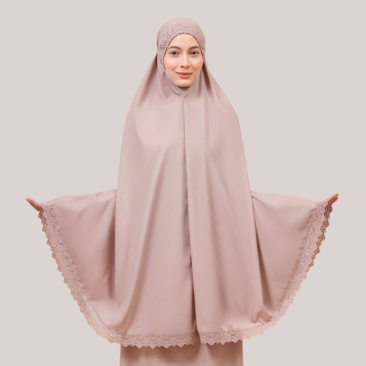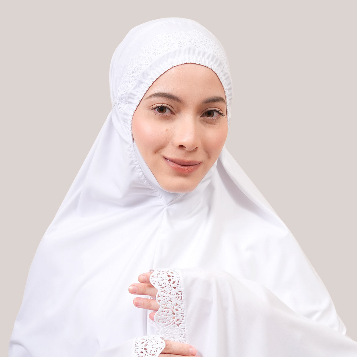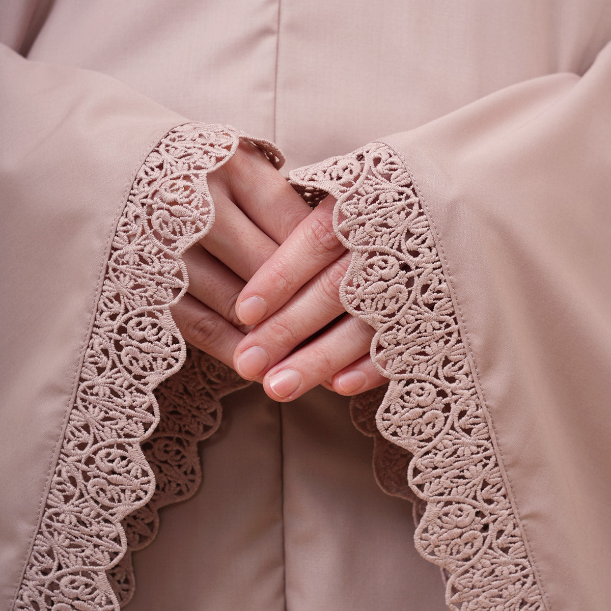 Inspired by the beauty of Mushaf motifs, the Modish Noore prayerwear features a minimalist design that blends modern elegance with classic charm. Delicately adorned with fine Khadura lace, its subtle detailing creates a refined and timeless look, perfect for those who appreciate understated sophistication. The small lace accents along the hem and classic headpiece enhance its graceful silhouette, making it suitable for daily worship or as a meaningful gift. The name “Noore,” meaning light and radiance, symbolizes tranquility, guidance, beauty, and hope, reflecting the serene and uplifting essence of the wearer.