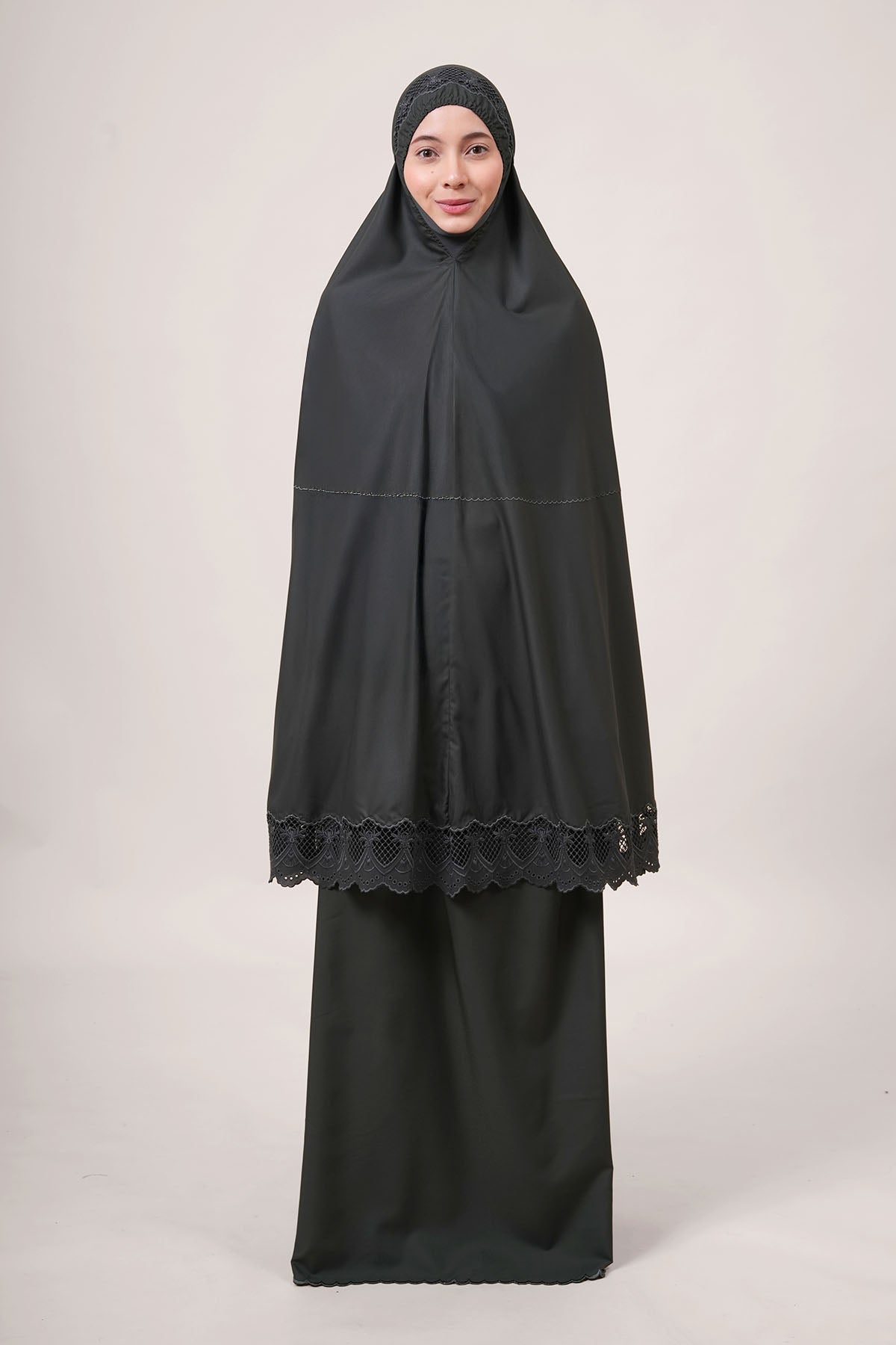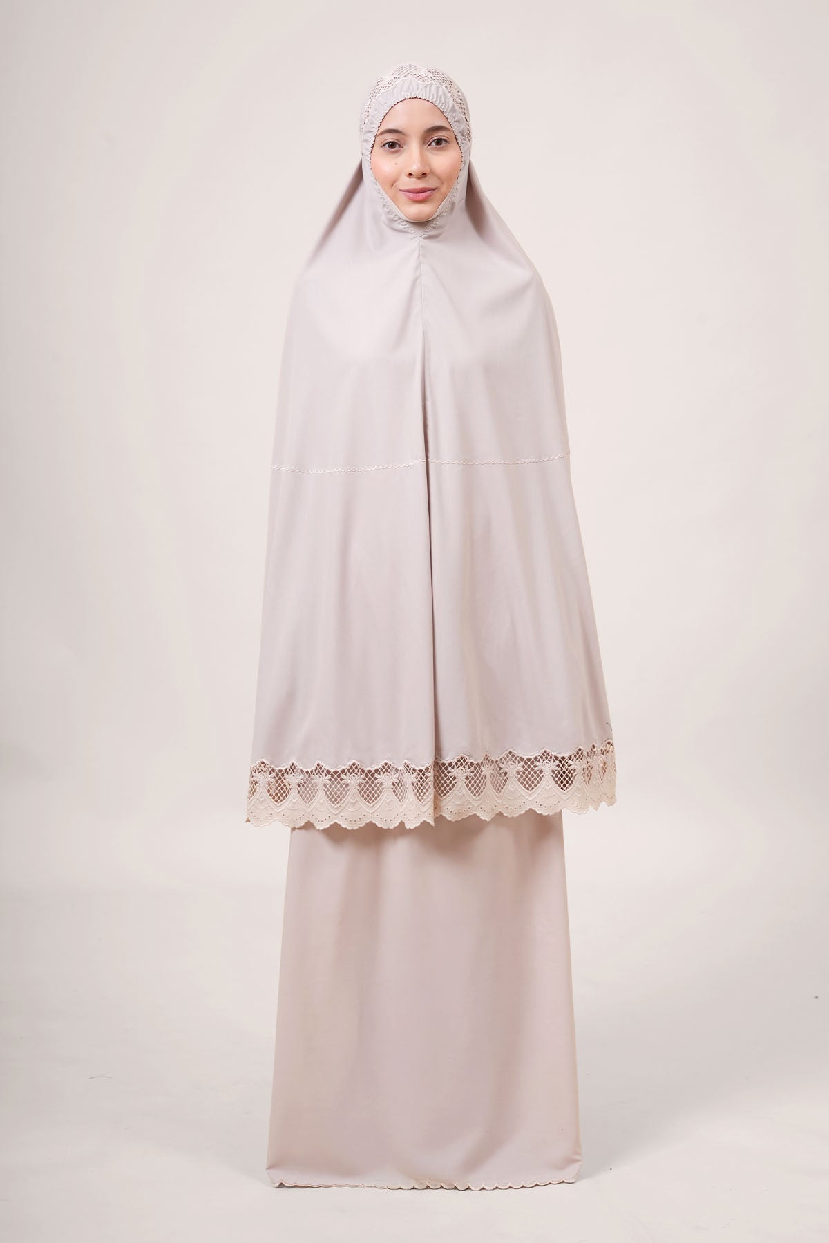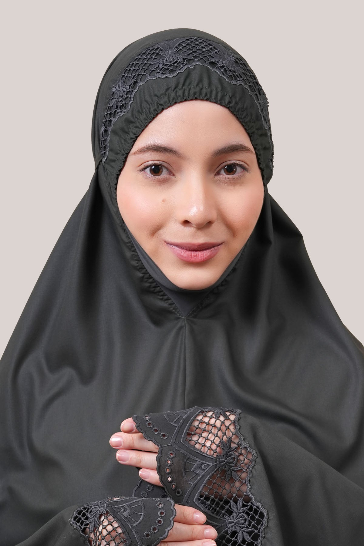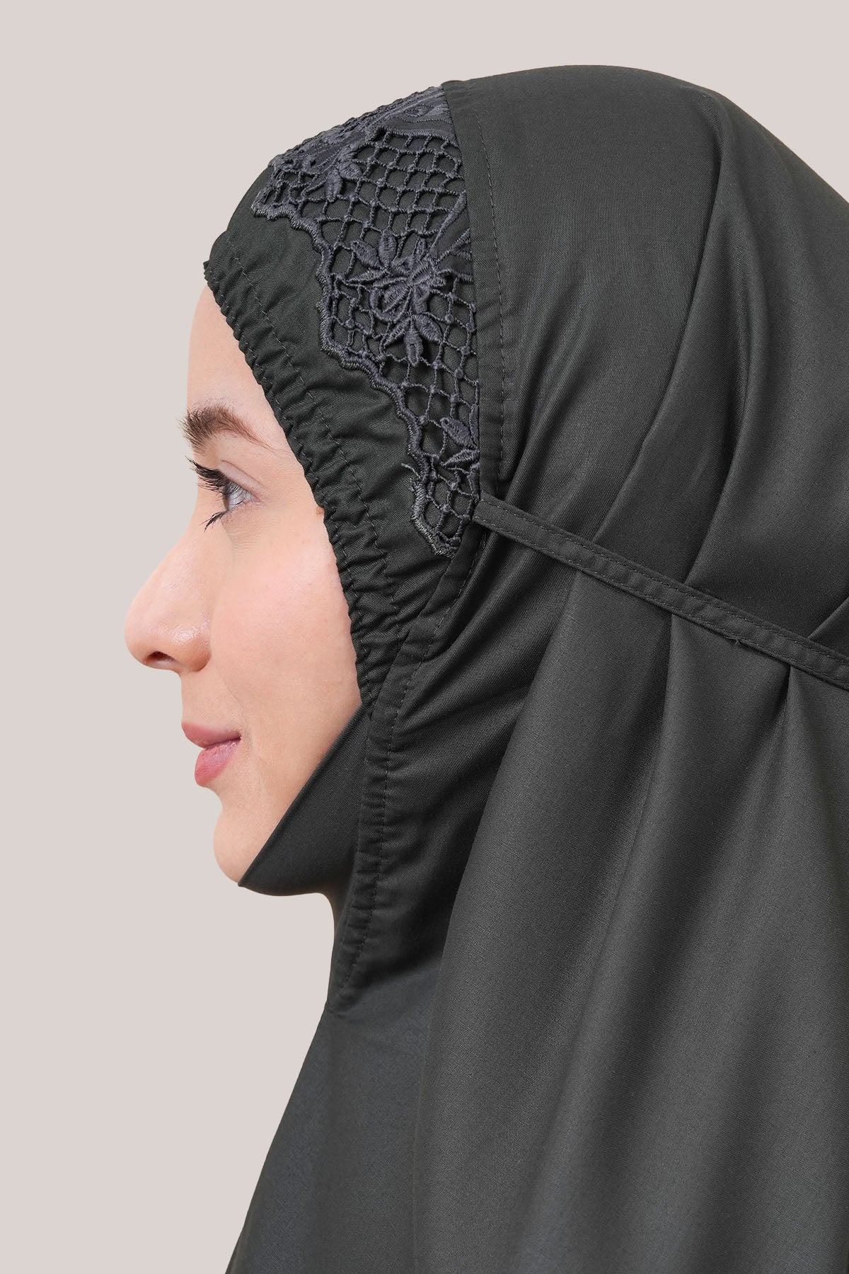 This Telekung is made for comfort, modesty, and ease of use. It has a soft, stretchable chin padding (KCF) that stays in place and keeps its shape after washing. The classic head design comes with padded elastic that’s gentle on the forehead. Made from Signature Poplin, the fabric is breathable, quick-drying, strong, and soft on the skin. It uses a funnel tie with a cord stopper for easy fitting and features a mix of cotton and guipure lace for a lasting elegant look. The Biku embroidery at the bottom adds a classic touch. Inspired by Persian floral patterns, the design is simple yet graceful. The fabric is durable, doesn’t wrinkle easily, and keeps its color well (except dark shades).