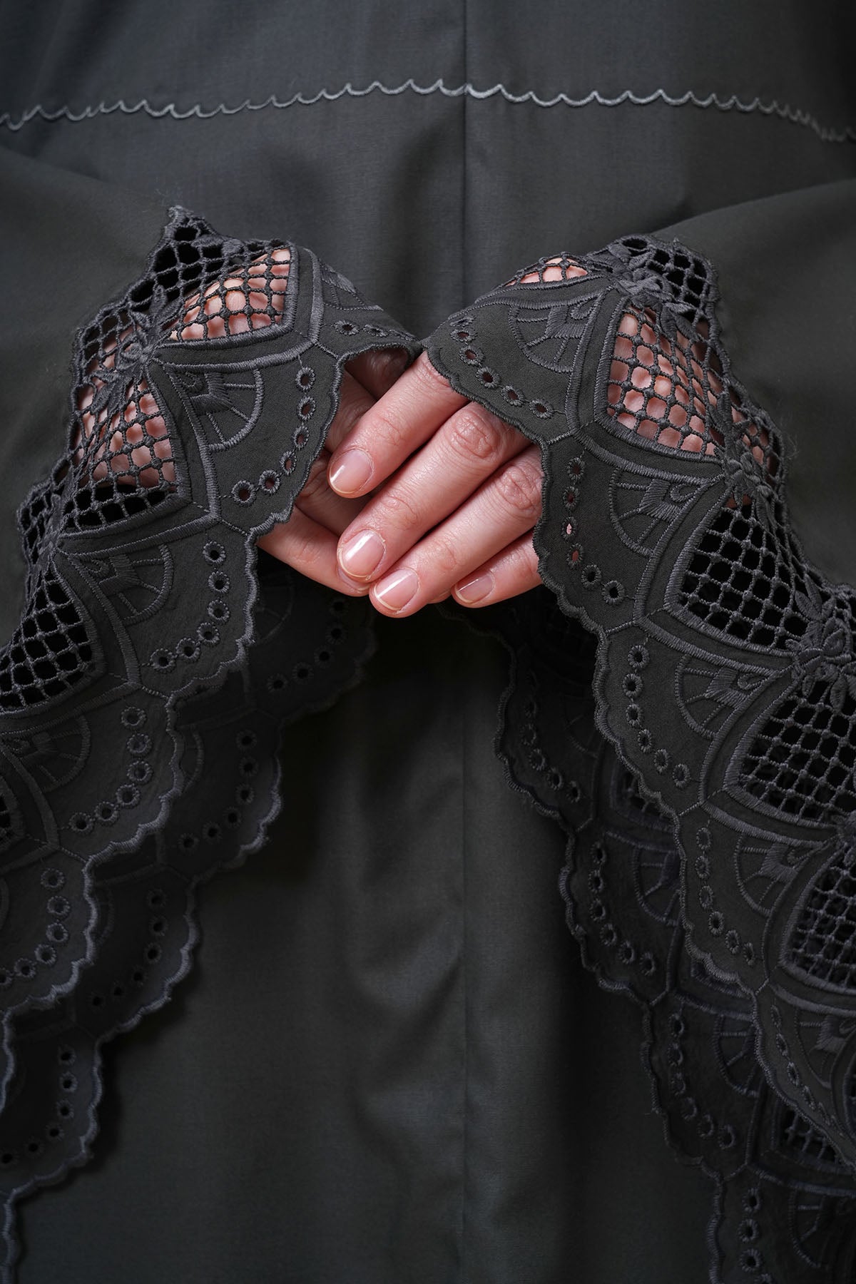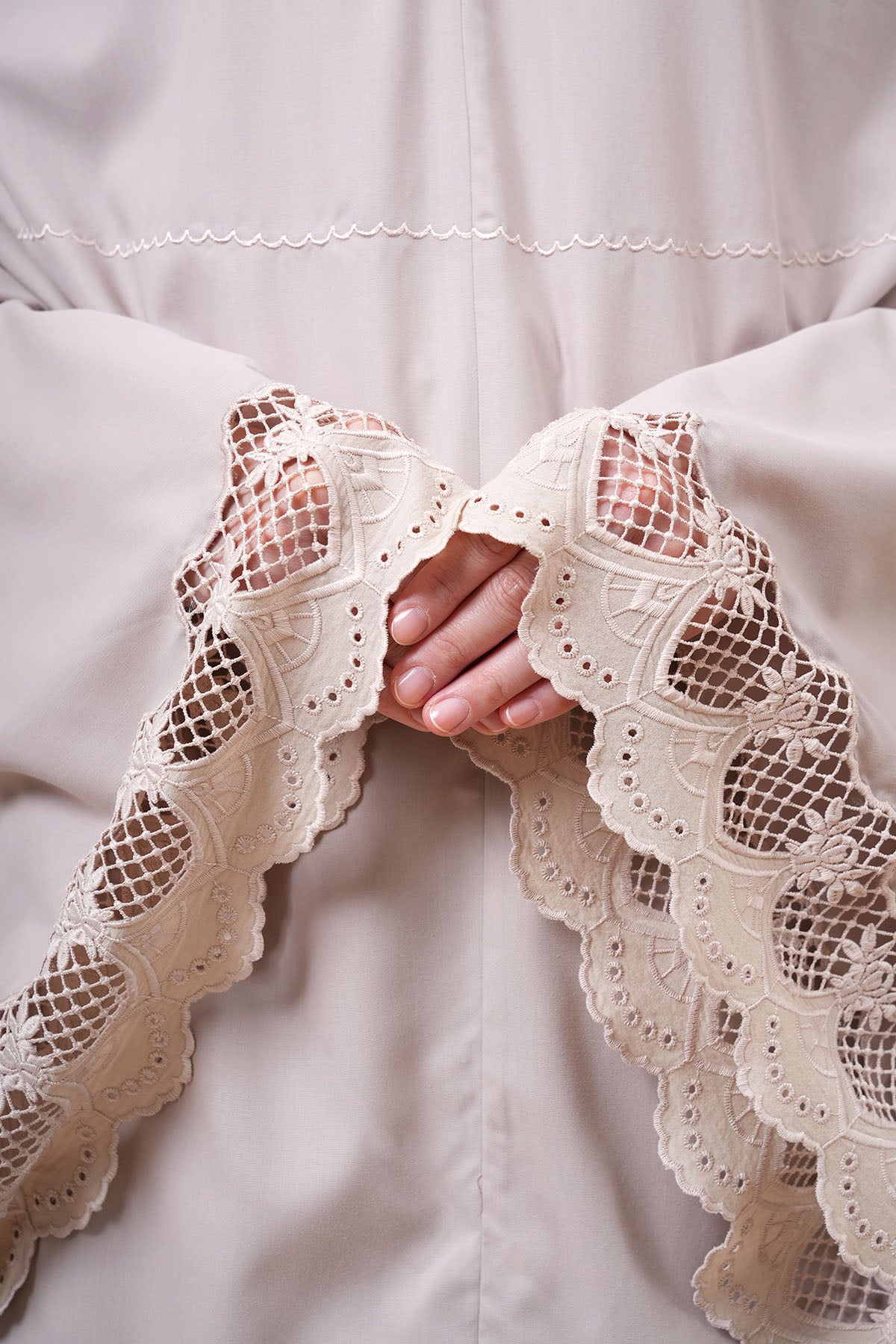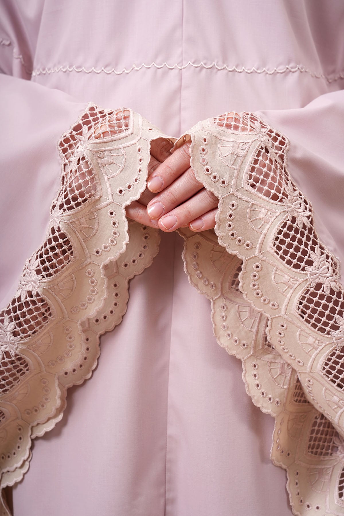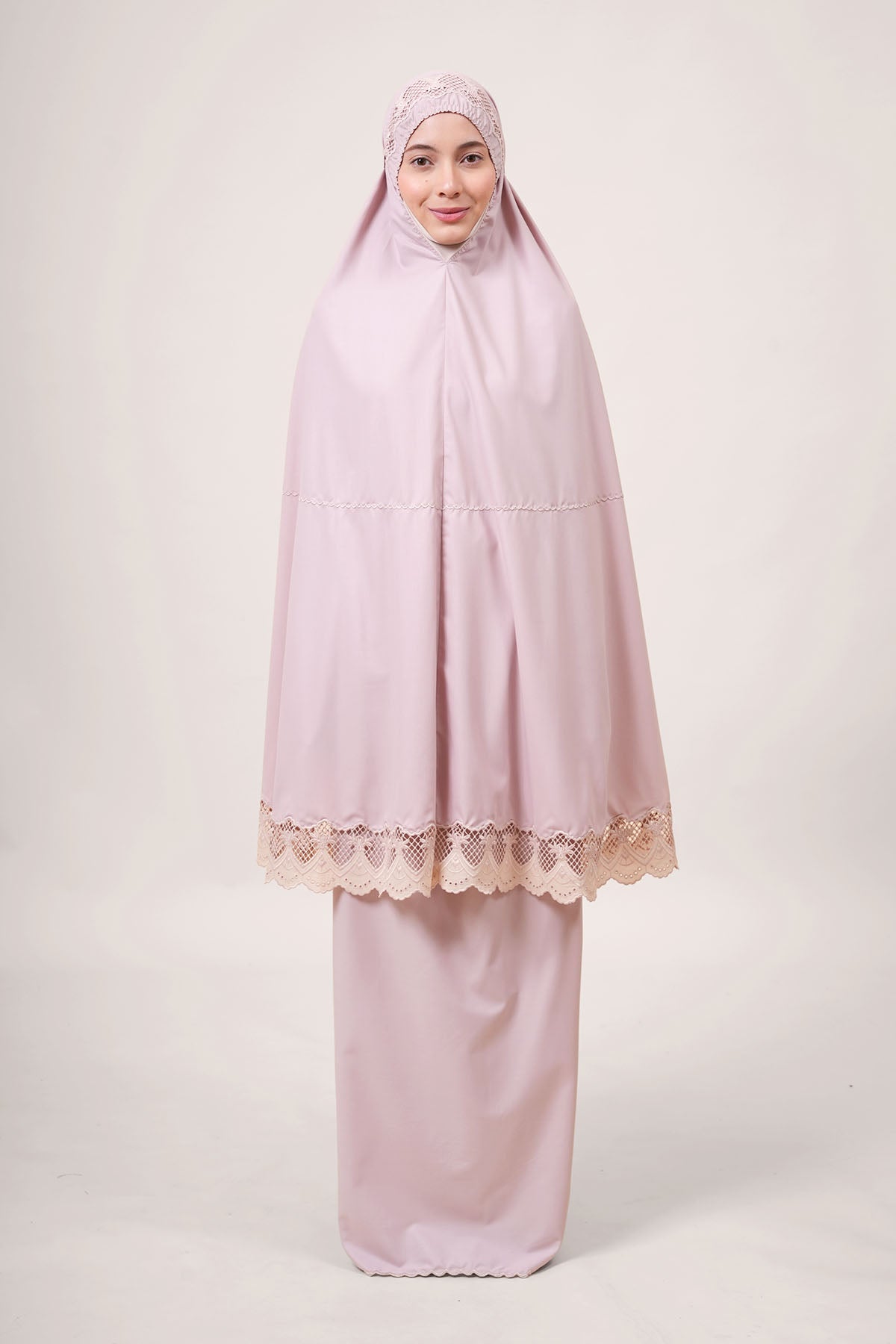 This Telekung is made for comfort, modesty, and ease of use. It has a soft, stretchable chin padding (KCF) that stays in place and keeps its shape after washing. The classic head design comes with padded elastic that’s gentle on the forehead. Made from Signature Poplin, the fabric is breathable, quick-drying, strong, and soft on the skin. It uses a funnel tie with a cord stopper for easy fitting and features a mix of cotton and guipure lace for a lasting elegant look. The Biku embroidery at the bottom adds a classic touch. Inspired by Persian floral patterns, the design is simple yet graceful. The fabric is durable, doesn’t wrinkle easily, and keeps its color well (except dark shades).