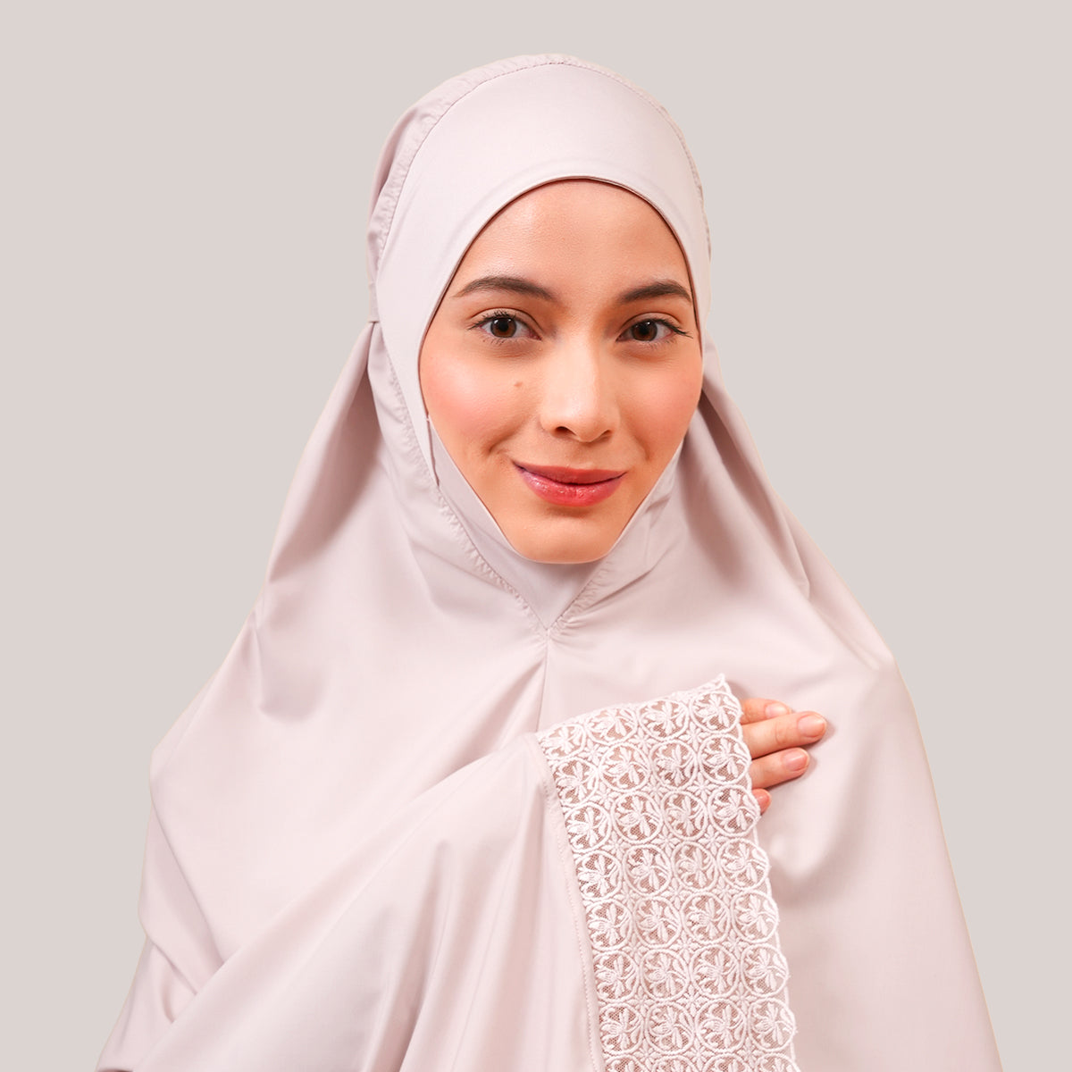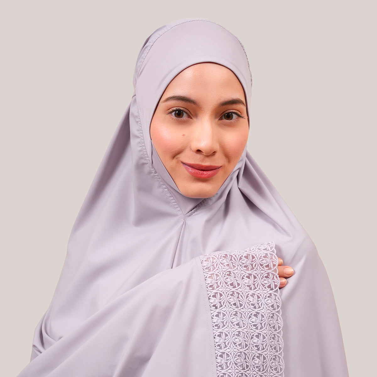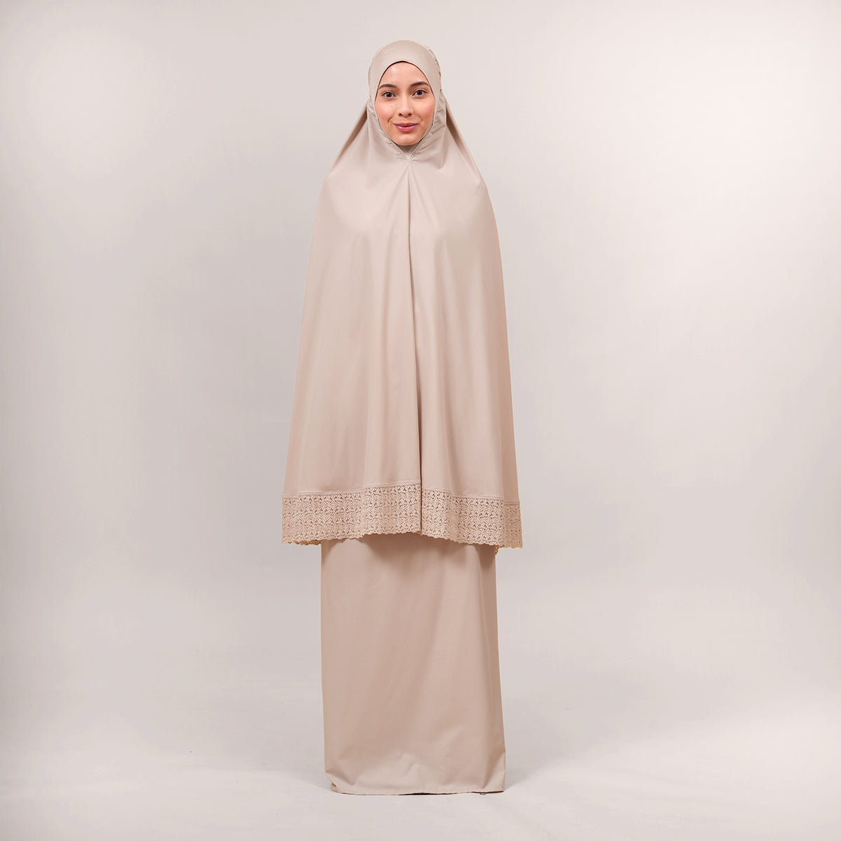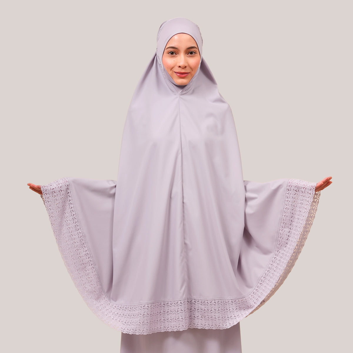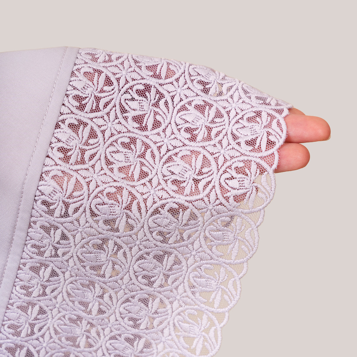 Harmony Modish Talitha is inspired by Mushaf motifs and features seamless lace designs that look elegant and luxurious while remaining minimal. Made with breathable and quick-drying KUF fabric, it feels soft on the skin and is comfortable to wear. The fine net lace finishing adds a graceful touch, reflecting the gentle, sweet, and captivating character behind the name Talitha.