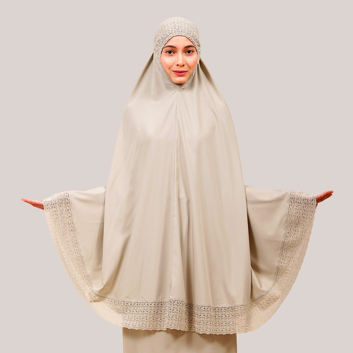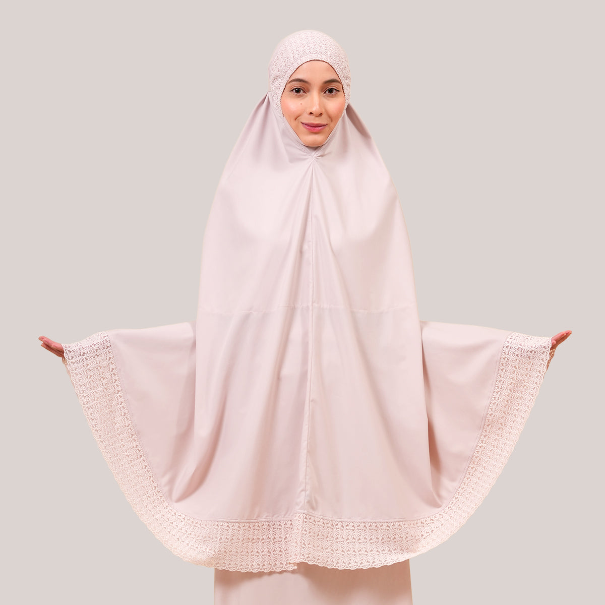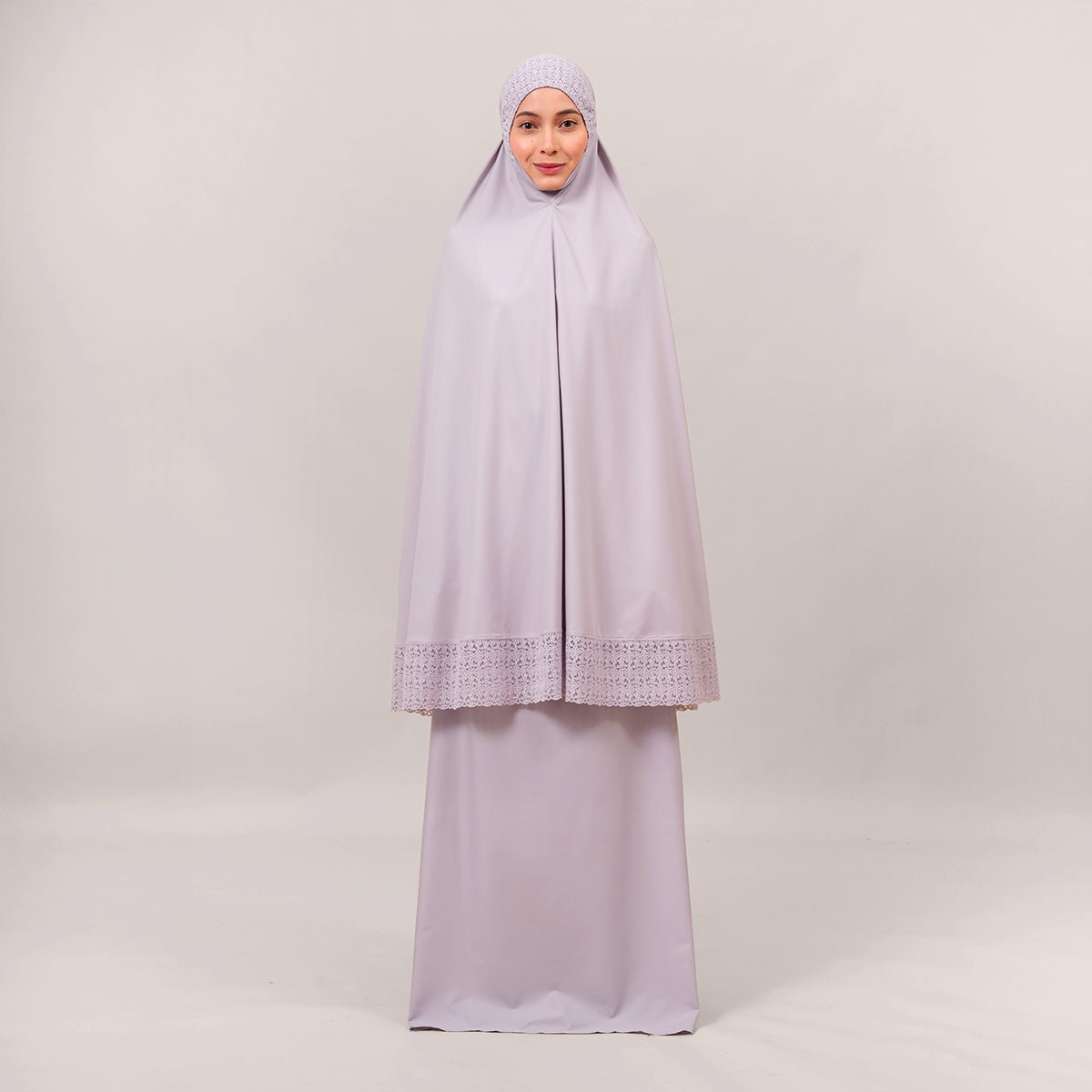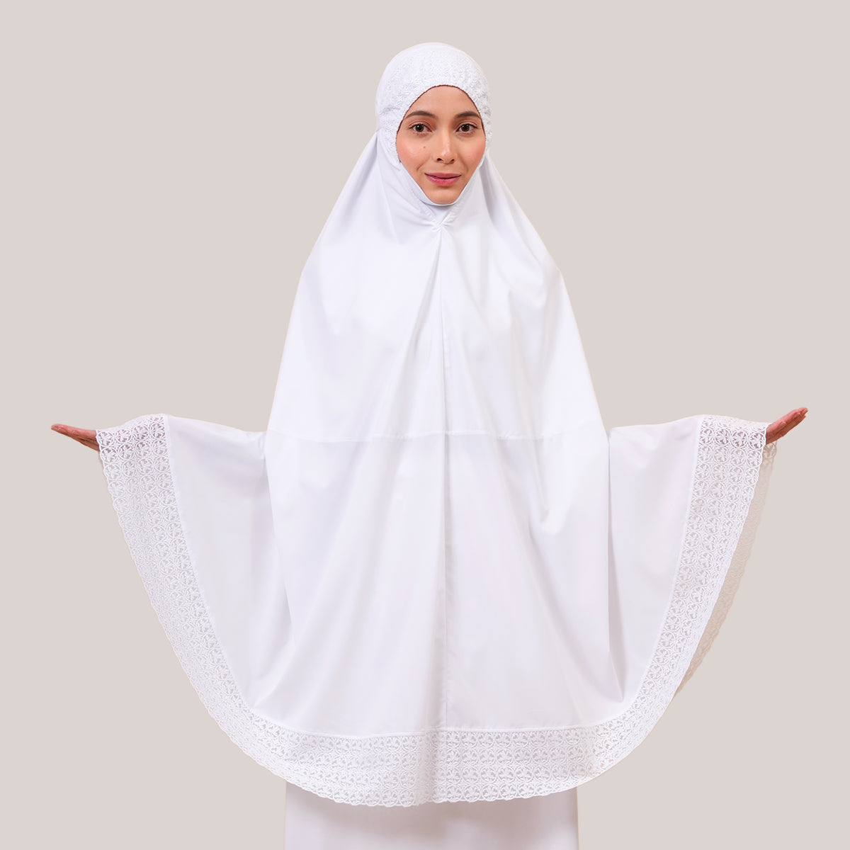 Modish Talitha is inspired by Mushaf motifs and features seamless lace designs that look elegant and luxurious while remaining minimal. Made with breathable and quick-drying KUF fabric, it feels soft on the skin and is comfortable to wear. The fine net lace finishing adds a graceful touch, reflecting the gentle, sweet, and captivating character behind the name Talitha.