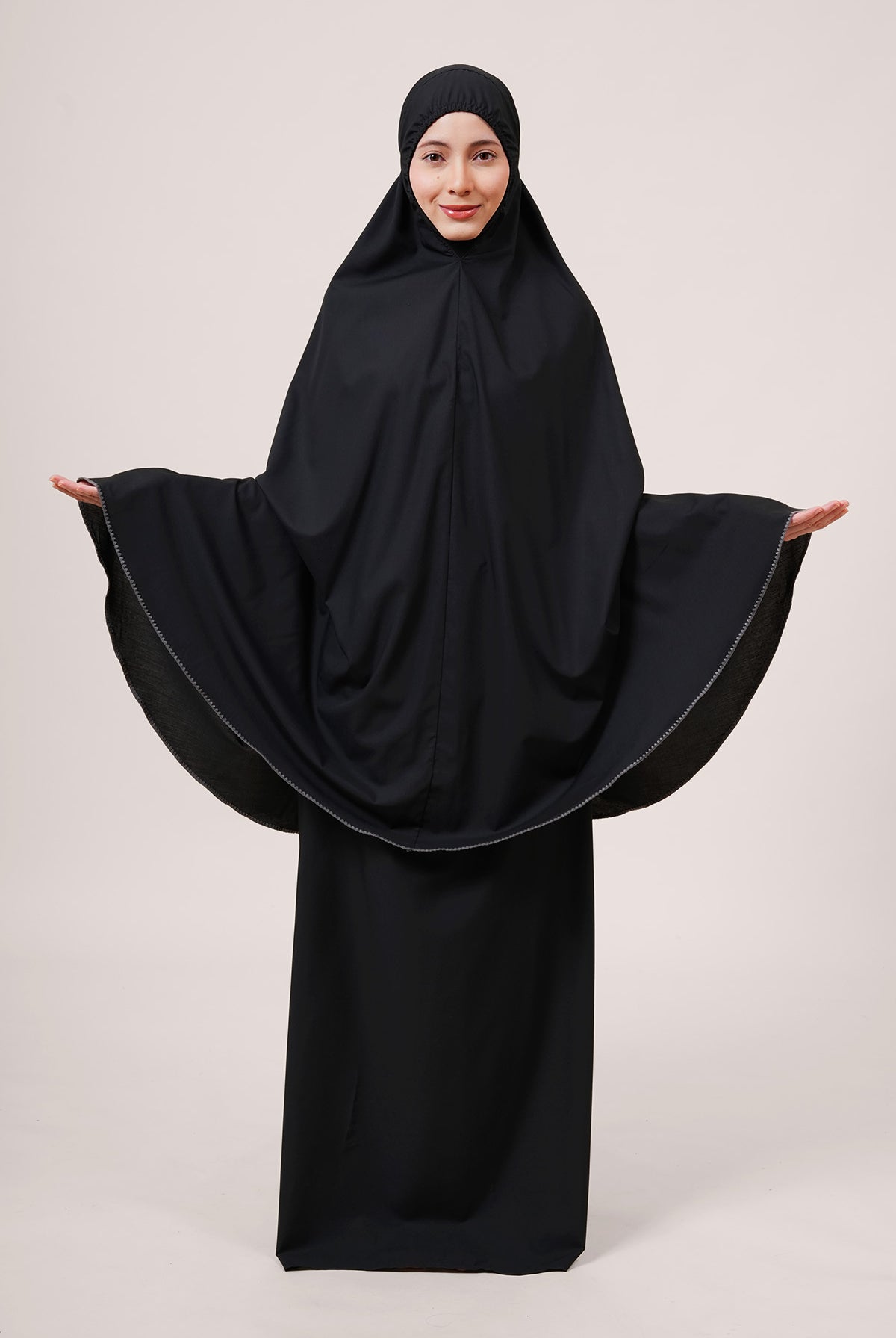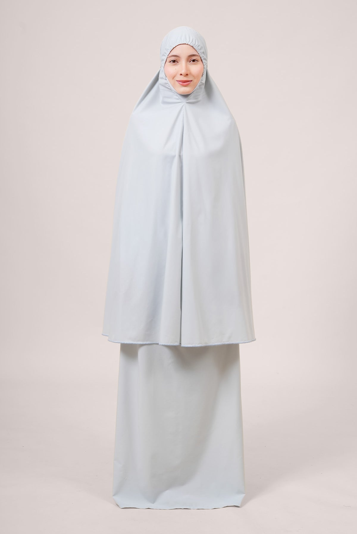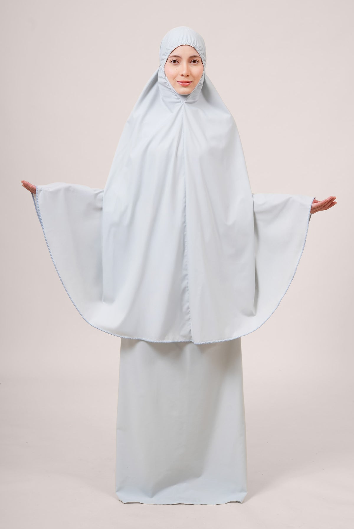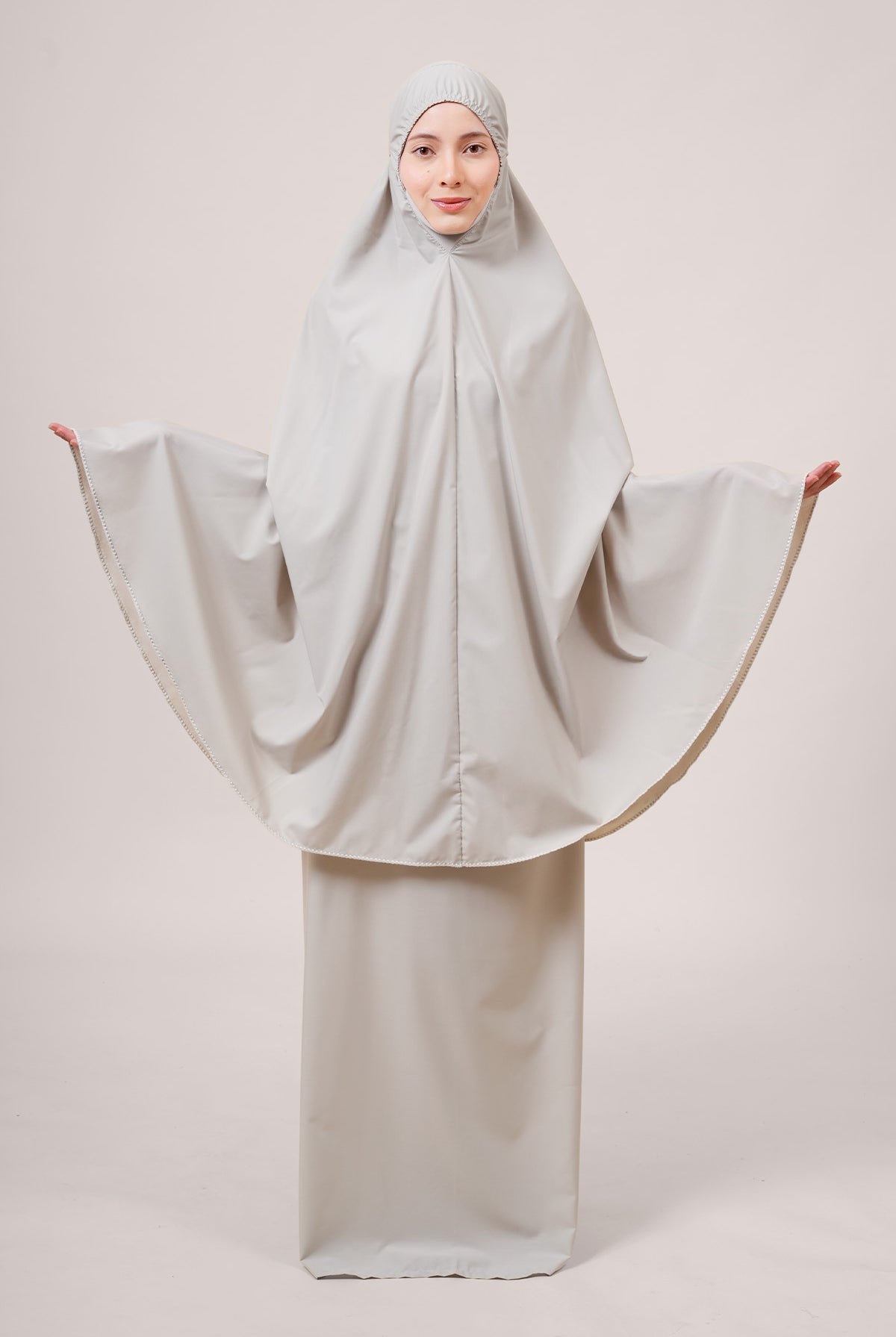 Crafted from Khadijah Airy V2, this is our lightest telekung at just 350g. It offers a soft, cooling drape that doesn’t cling, making it perfect for warm climates. Finished with a clean laser-cut design, it includes a weighted hem to stay secure even in windy conditions.