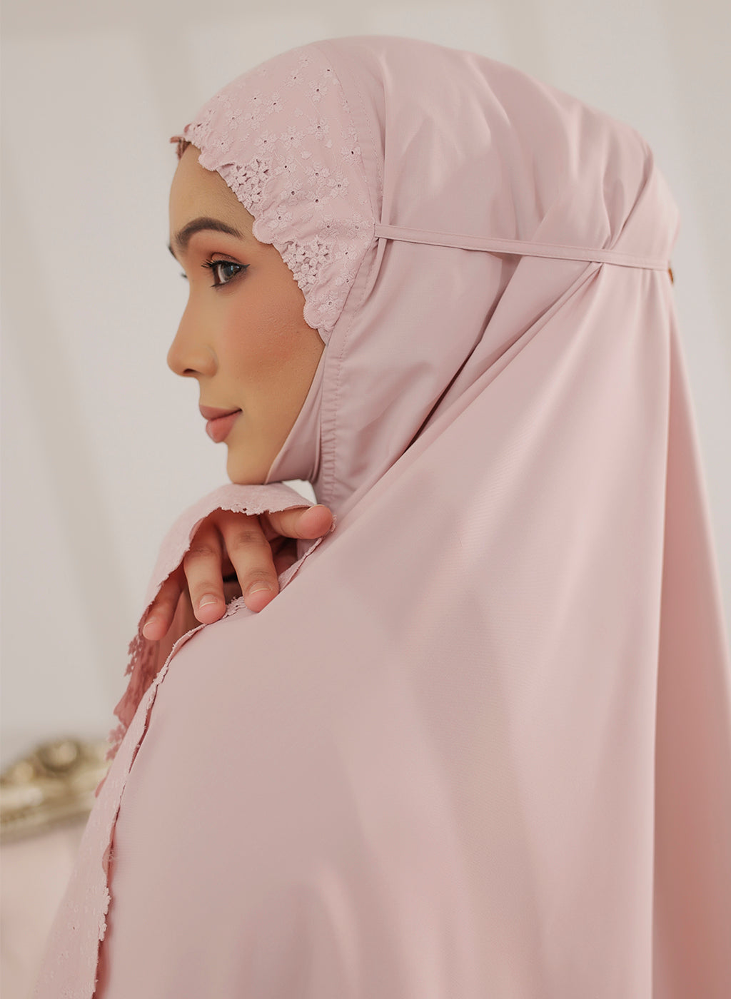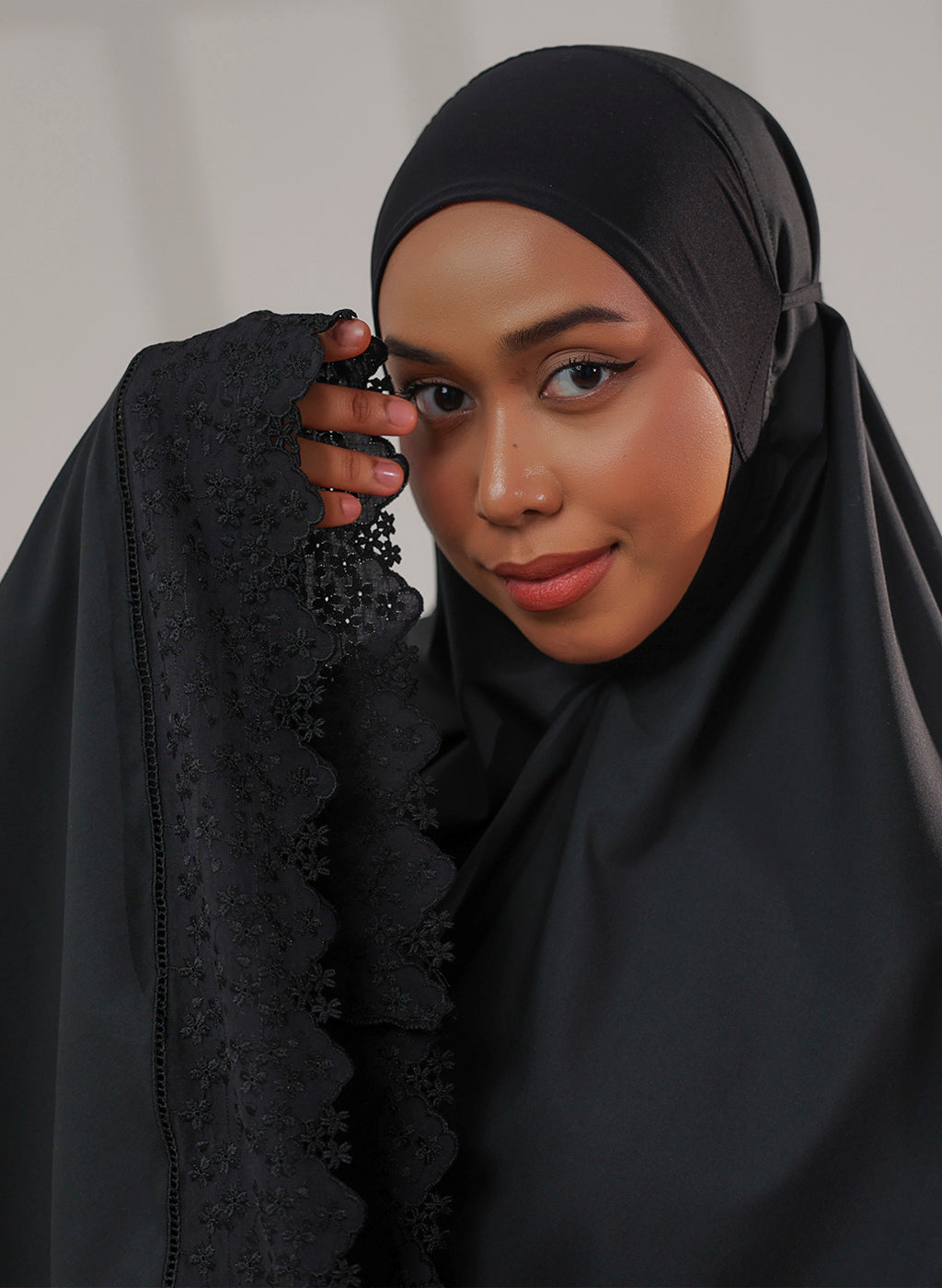 Crafted from cool, breathable KUF fabric, featuring cherry blossom embroidery on cotton and guipure lace inspired by blooming branches. Designed with two face-look options, it is durable, UV-protective, wrinkle-resistant, non-fading, and fully opaque for complete aurat coverage.