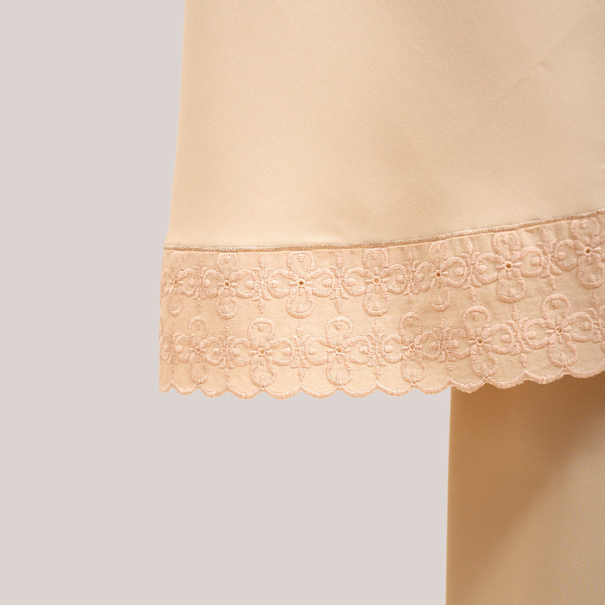 Inspired by Mushaf motifs, the Signature Khanisa prayerwear showcases a minimalist and elegant lace concept. The use of delicate cotton lace, subtle yet classically refined, creates a timeless design that is perfect for daily worship or as a thoughtful gift. The name “Khanisa,” meaning tranquility and gentleness, reflects a calming presence and symbolizes a wearer who brings peace and softness to those around her.