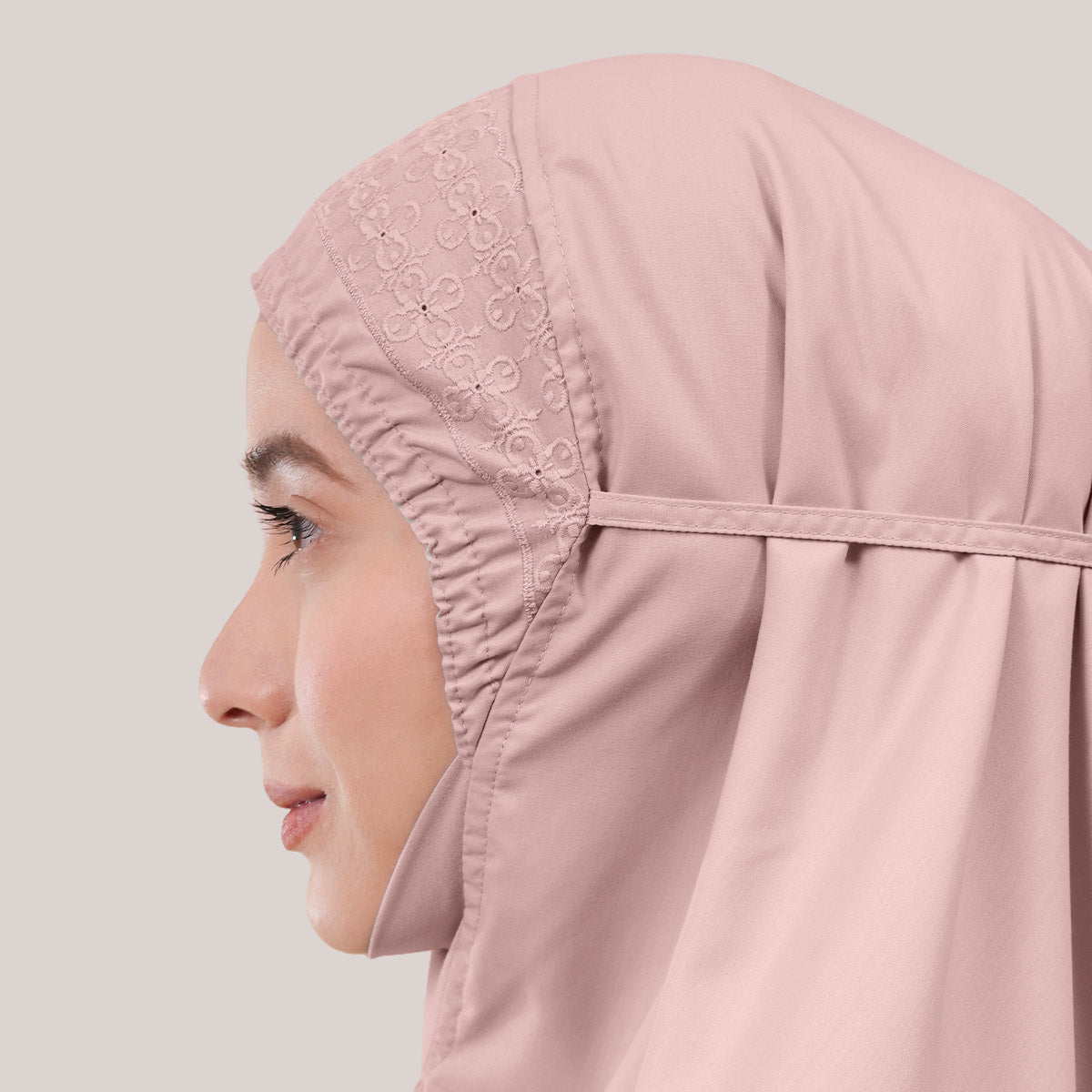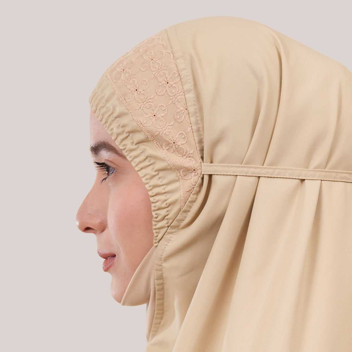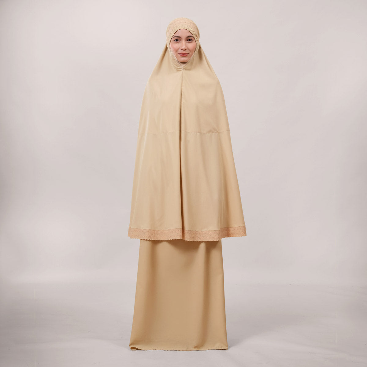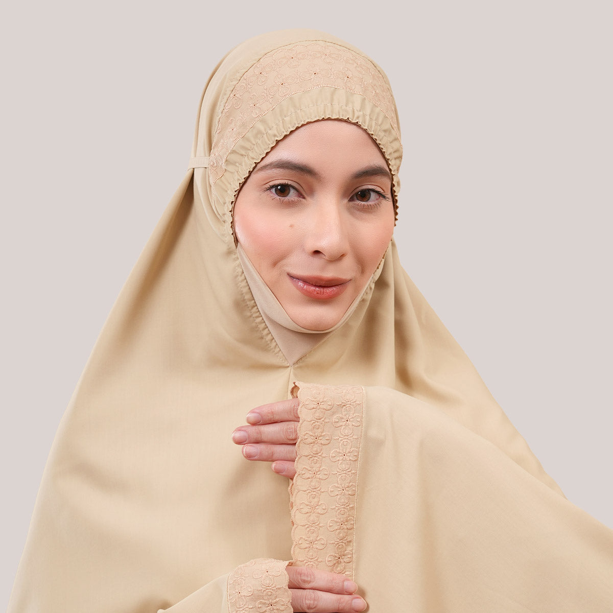 Inspired by Mushaf motifs, the Signature Khanisa prayerwear showcases a minimalist and elegant lace concept. The use of delicate cotton lace, subtle yet classically refined, creates a timeless design that is perfect for daily worship or as a thoughtful gift. The name “Khanisa,” meaning tranquility and gentleness, reflects a calming presence and symbolizes a wearer who brings peace and softness to those around her.