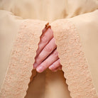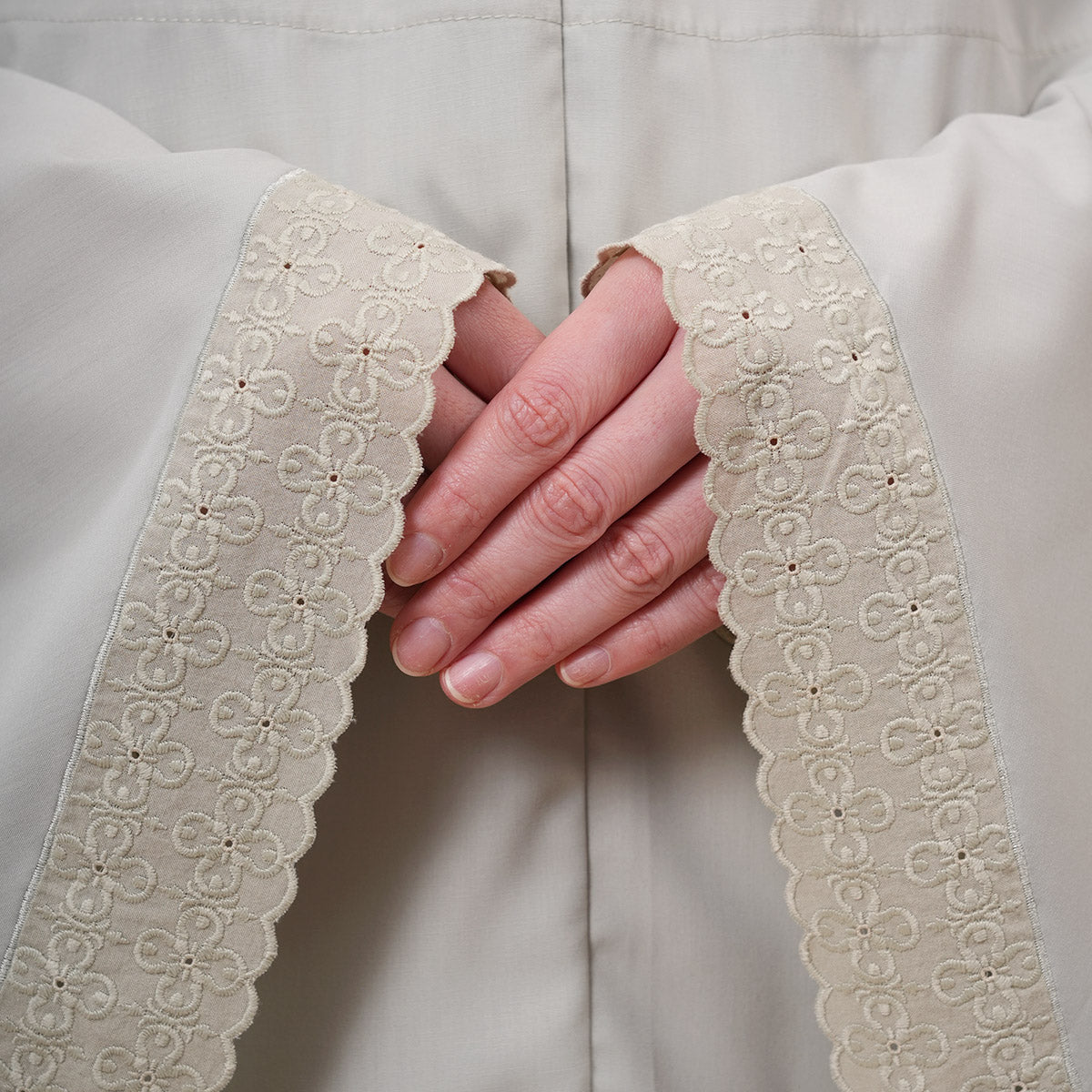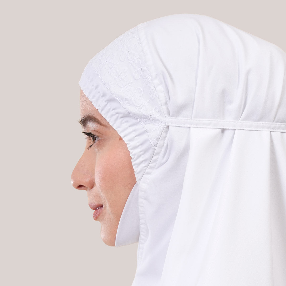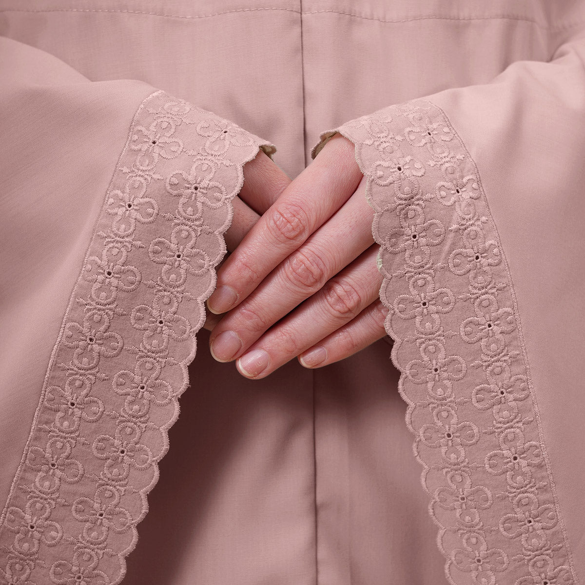 Inspired by Mushaf motifs, the Signature Khanisa prayerwear showcases a minimalist and elegant lace concept. The use of delicate cotton lace, subtle yet classically refined, creates a timeless design that is perfect for daily worship or as a thoughtful gift. The name “Khanisa,” meaning tranquility and gentleness, reflects a calming presence and symbolizes a wearer who brings peace and softness to those around her.