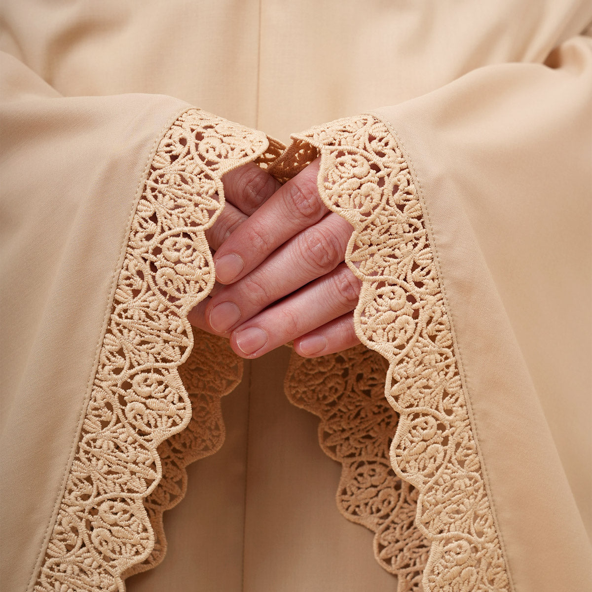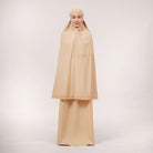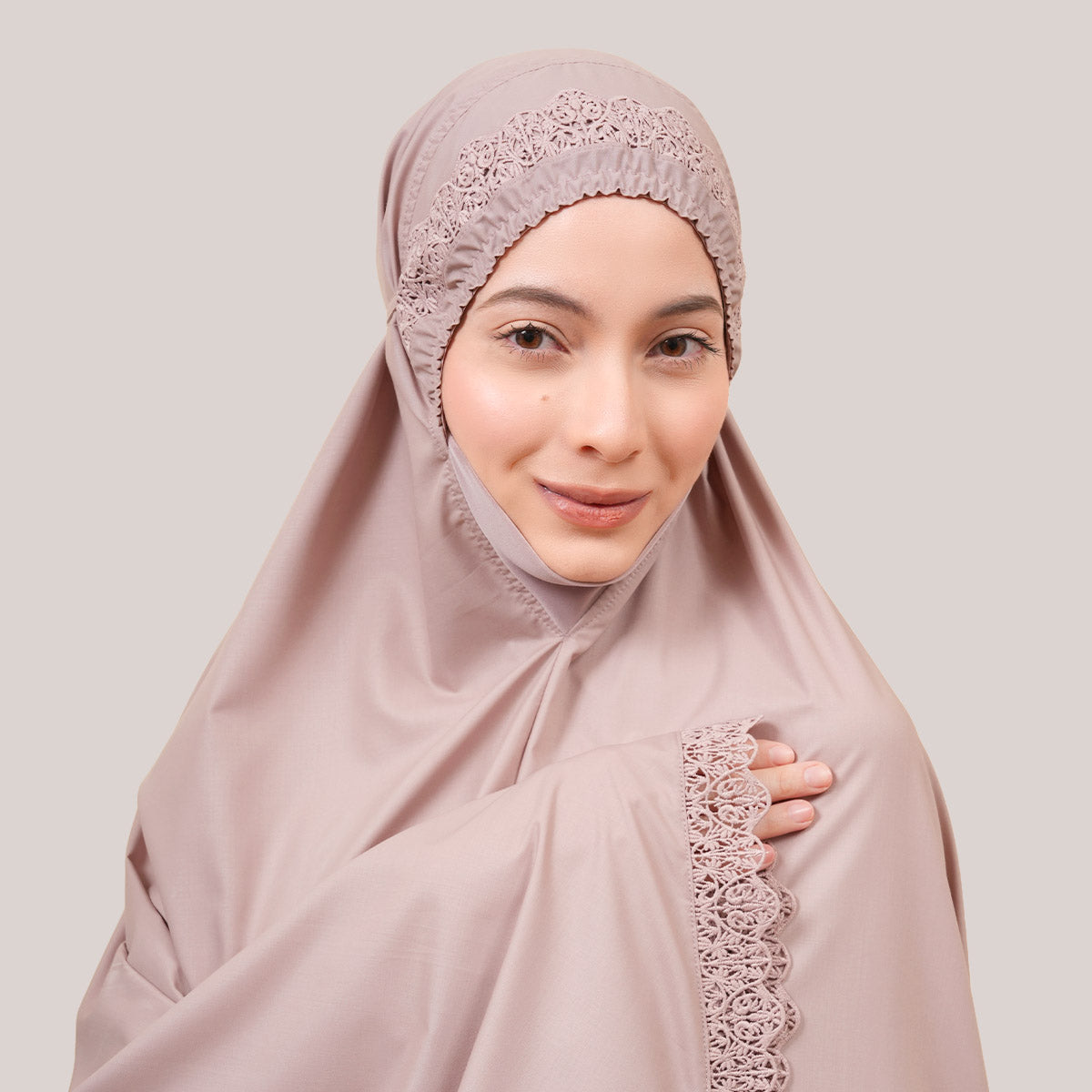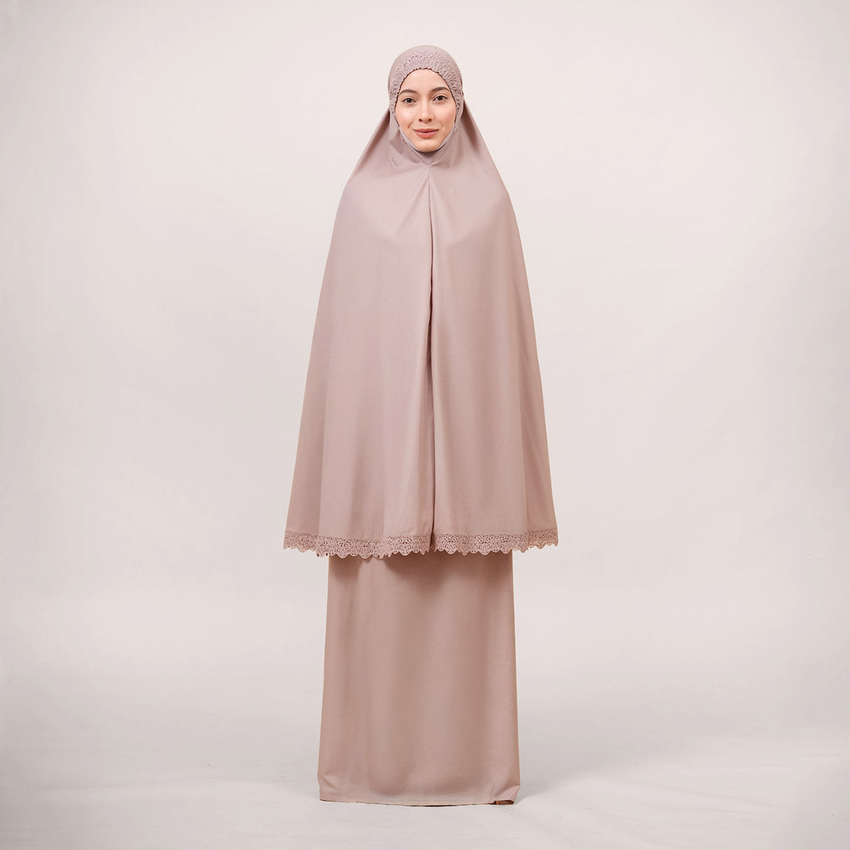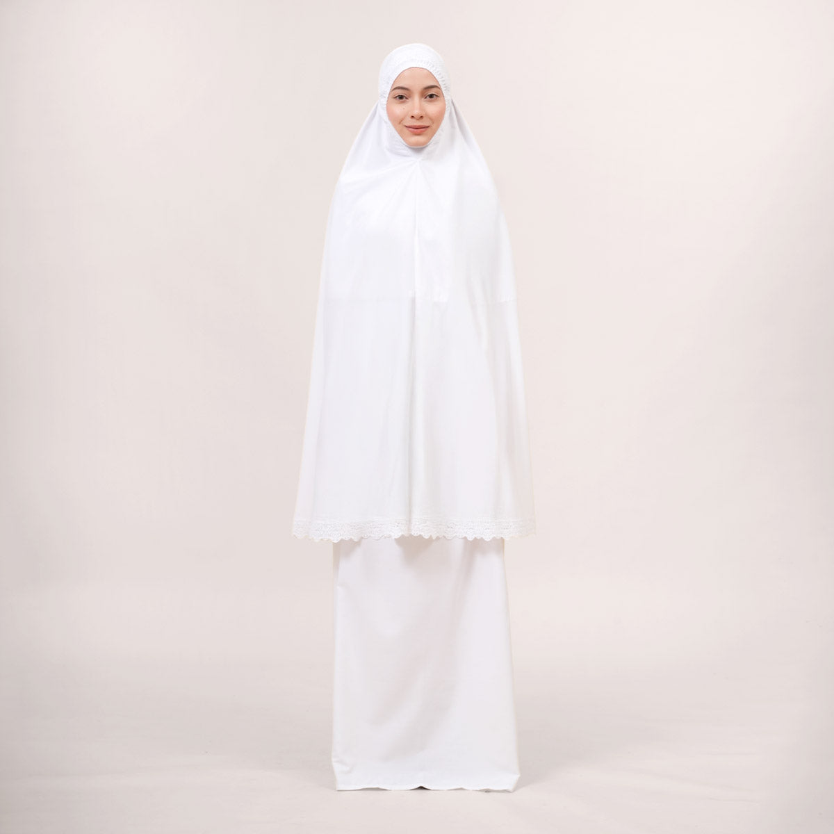 Inspired by the beauty of Mushaf motifs, the Modish Noore prayerwear features a minimalist design that blends modern elegance with classic charm. Delicately adorned with fine Khadura lace, its subtle detailing creates a refined and timeless look, perfect for those who appreciate understated sophistication. The small lace accents along the hem and classic headpiece enhance its graceful silhouette, making it suitable for daily worship or as a meaningful gift. The name “Noore,” meaning light and radiance, symbolizes tranquility, guidance, beauty, and hope, reflecting the serene and uplifting essence of the wearer.