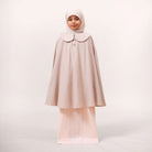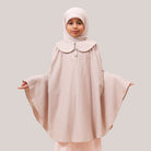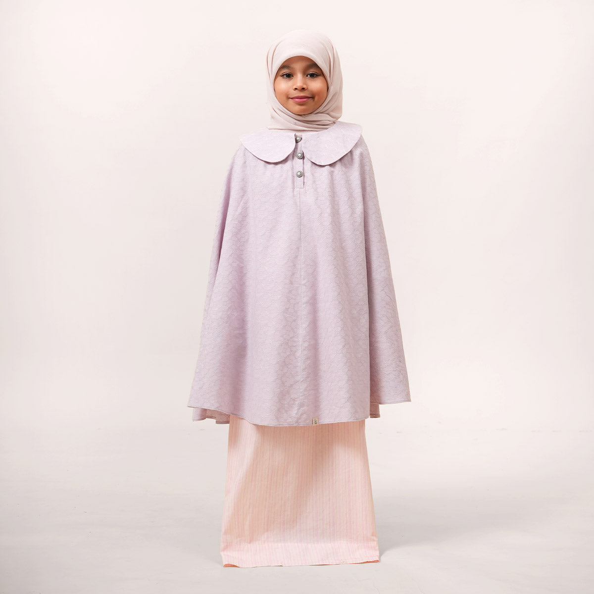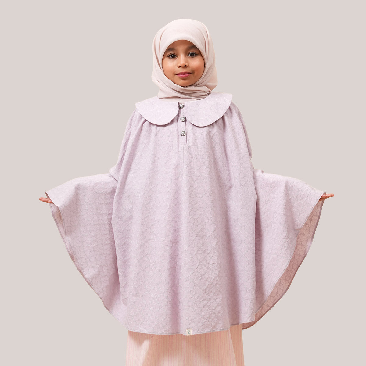 Flair Cape Medina Cilik is a comfortable cape-style telekung designed for children, made from soft Jacquard Dobby fabric with a lasting woven texture. The collar and button closure make it easy to wear while keeping a neat look. Practical and lightweight, it is ideal for daily prayers or travel, and comes with a cute mini pouch bag for added fun.