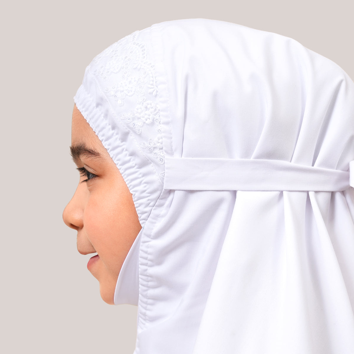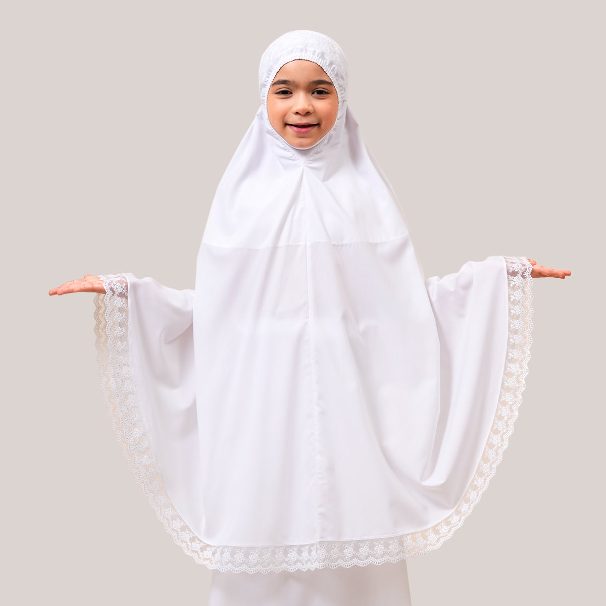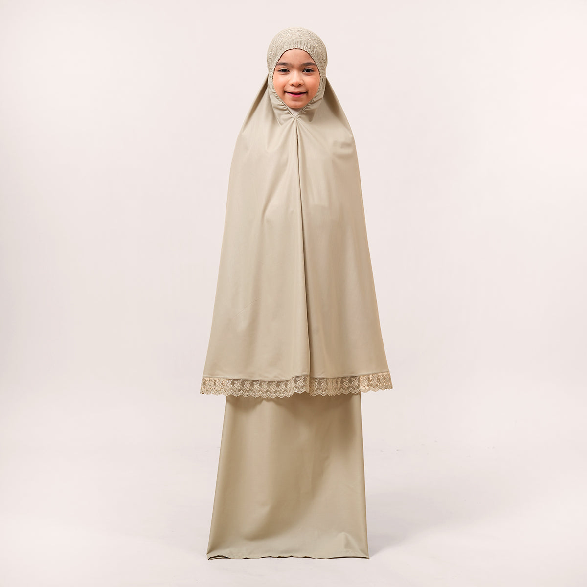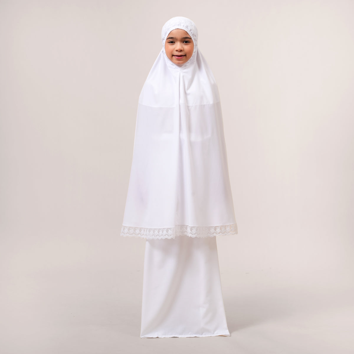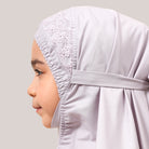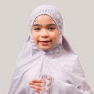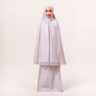 Modish Neelam Kids features elegant guipure lace and soft sequin details for a simple yet refined look. Made with breathable and gentle Khadijah Basic Fine fabric, it ensures comfort without heat or irritation during prayers. Inspired by Neelam, a precious gemstone, the design blends modern and traditional elements beautifully. It comes with a matching telekung for twinning with mom and a cute, practical mini pouch bag.