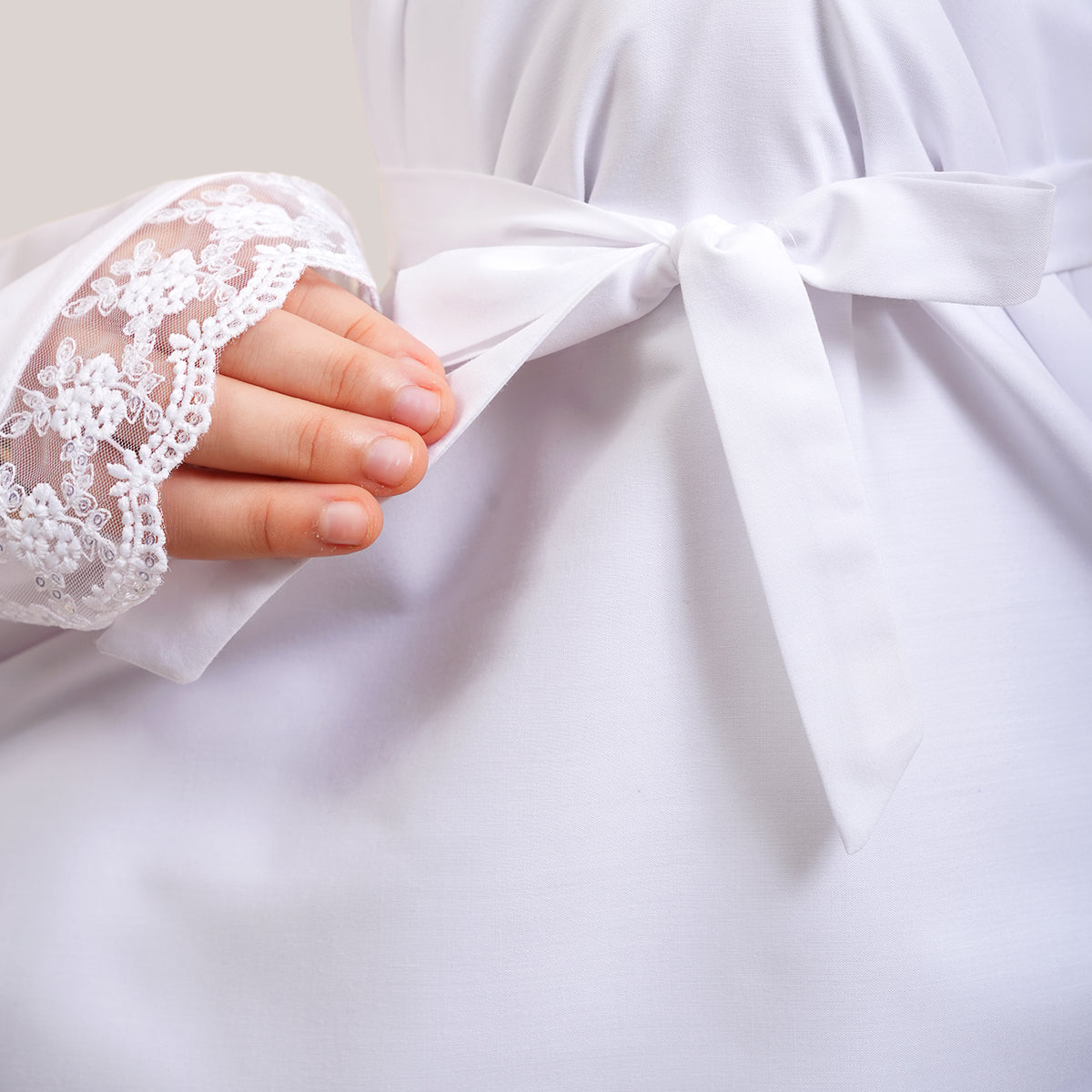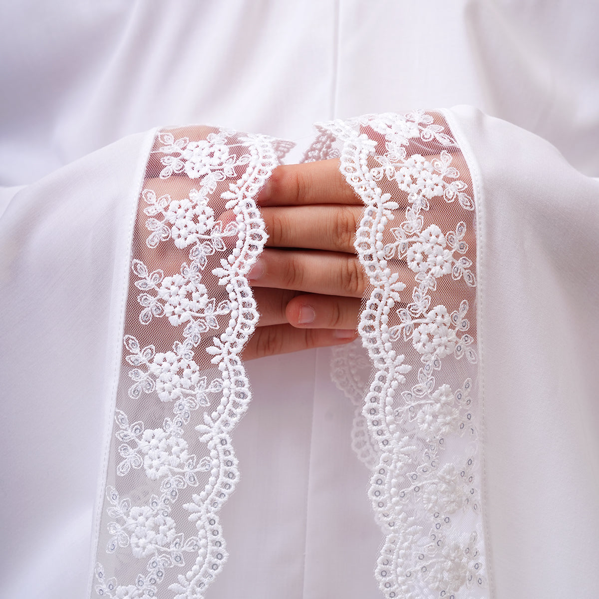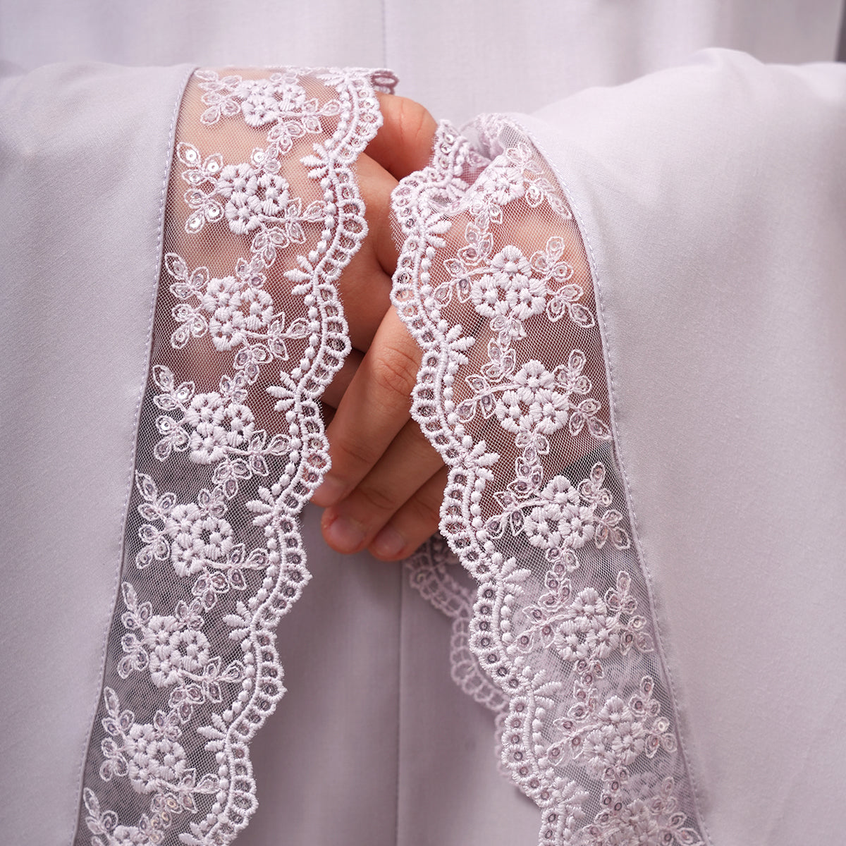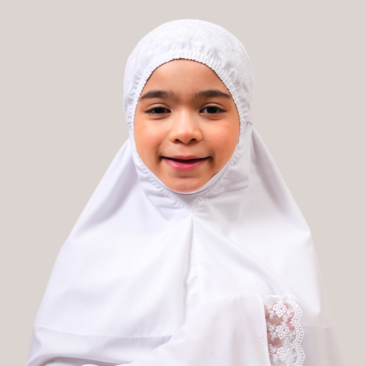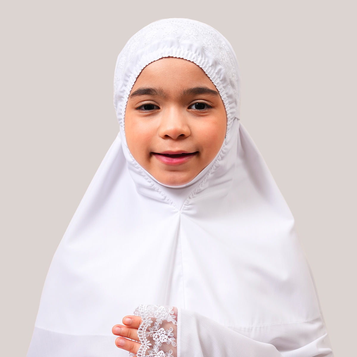 Modish Neelam Kids features elegant guipure lace and soft sequin details for a simple yet refined look. Made with breathable and gentle Khadijah Basic Fine fabric, it ensures comfort without heat or irritation during prayers. Inspired by Neelam, a precious gemstone, the design blends modern and traditional elements beautifully. It comes with a matching telekung for twinning with mom and a cute, practical mini pouch bag.