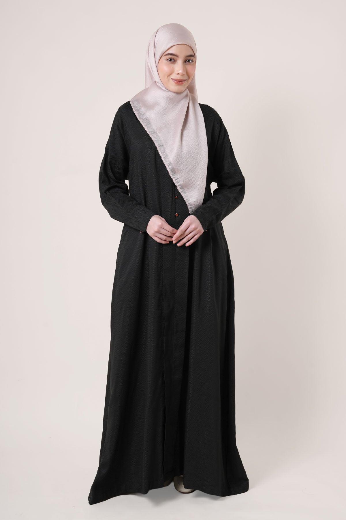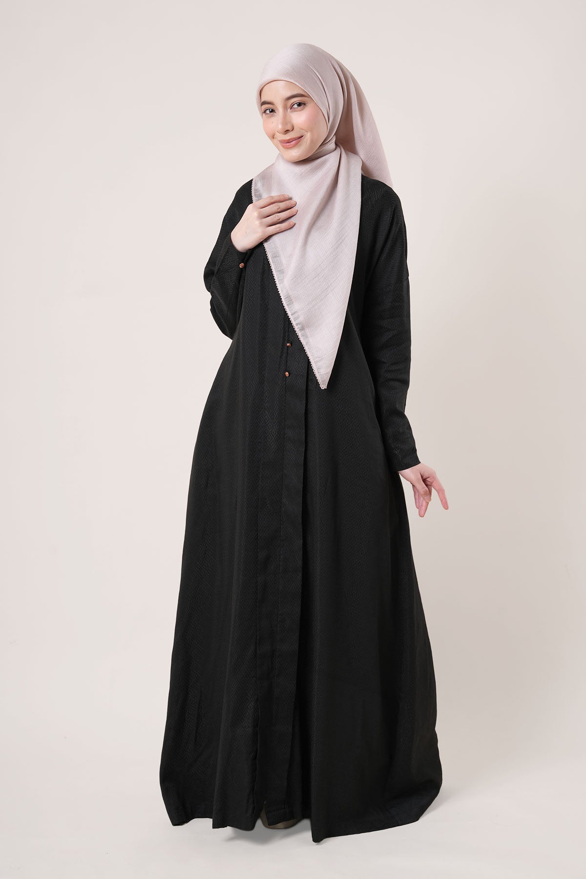 Made from wrinkle-resistant matte satin, the Adra Jubah features a relaxed silhouette with front pleats and a soft drape that flatters all body shapes. The cuffed sleeves, side pockets, and lightweight lining make it a versatile option for formal events or daily wear.