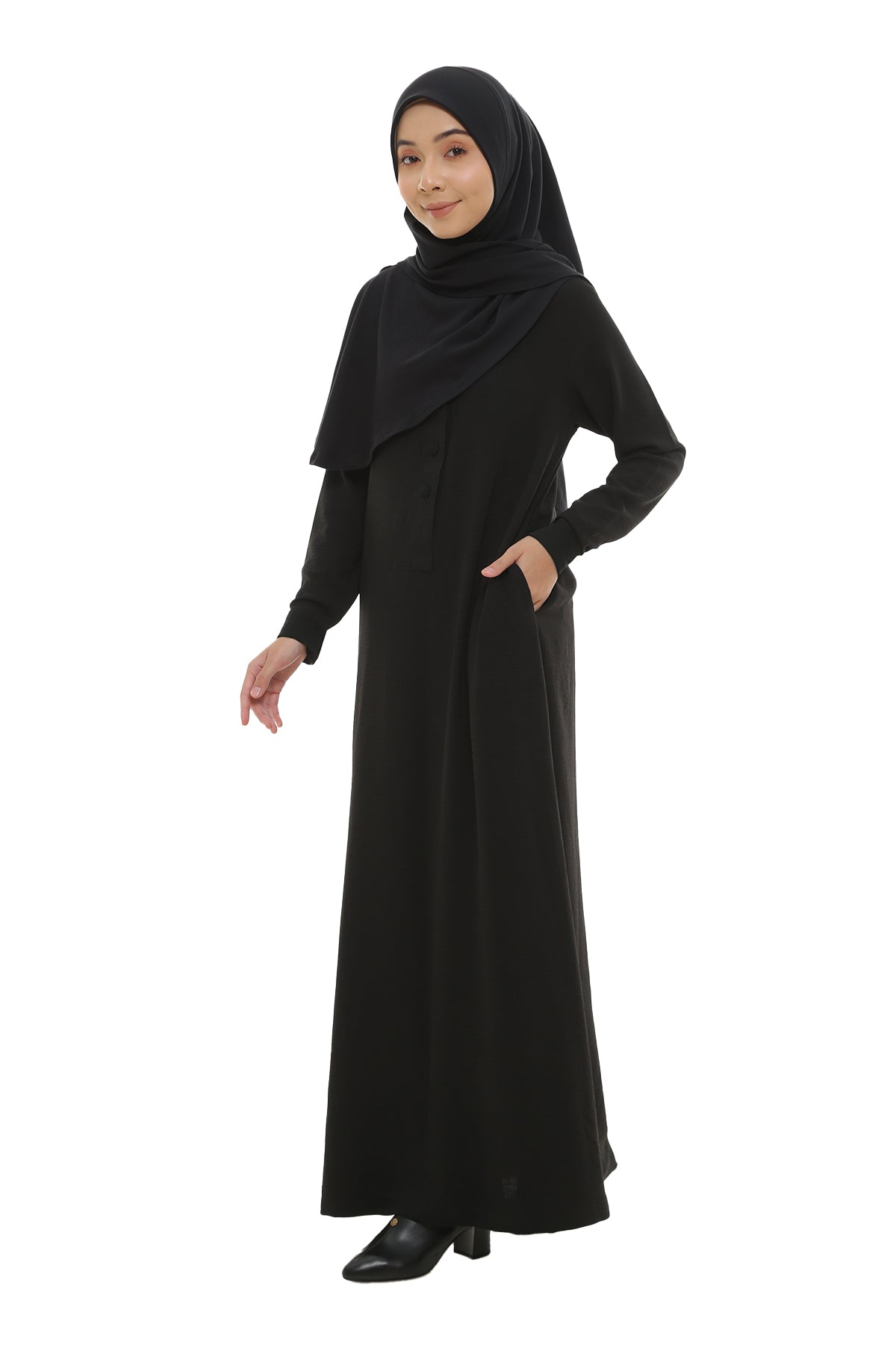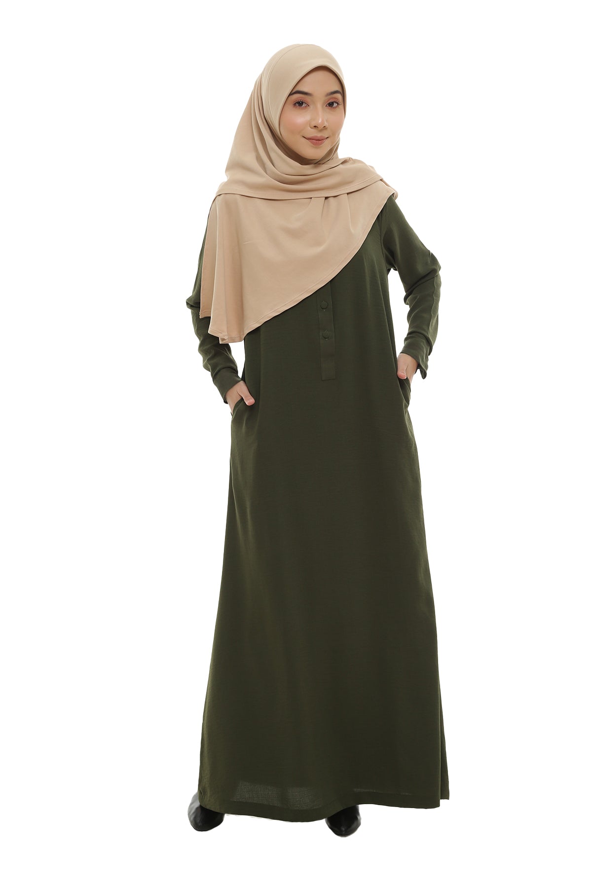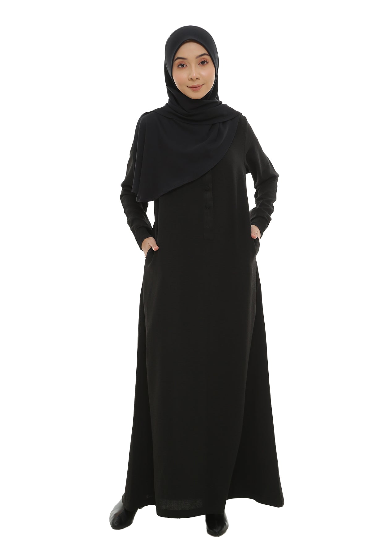 Crafted from premium fabric, this jubah features a loose A-line silhouette that offers a comfortable fit without clinging to the body. Thoughtfully designed with side pockets and cuffed sleeves for added practicality, its lightweight, non-sheer, and wrinkle-resistant fabric ensures effortless elegance for any occasion. A perfect choice for those who value versatility and timeless staple in their wardrobe.