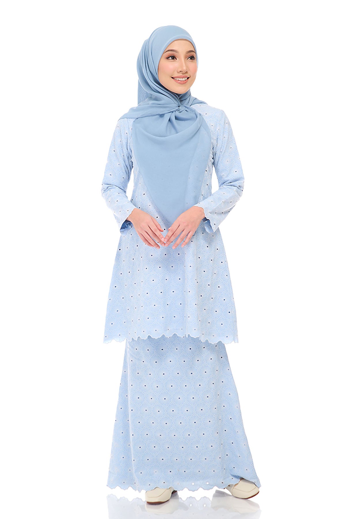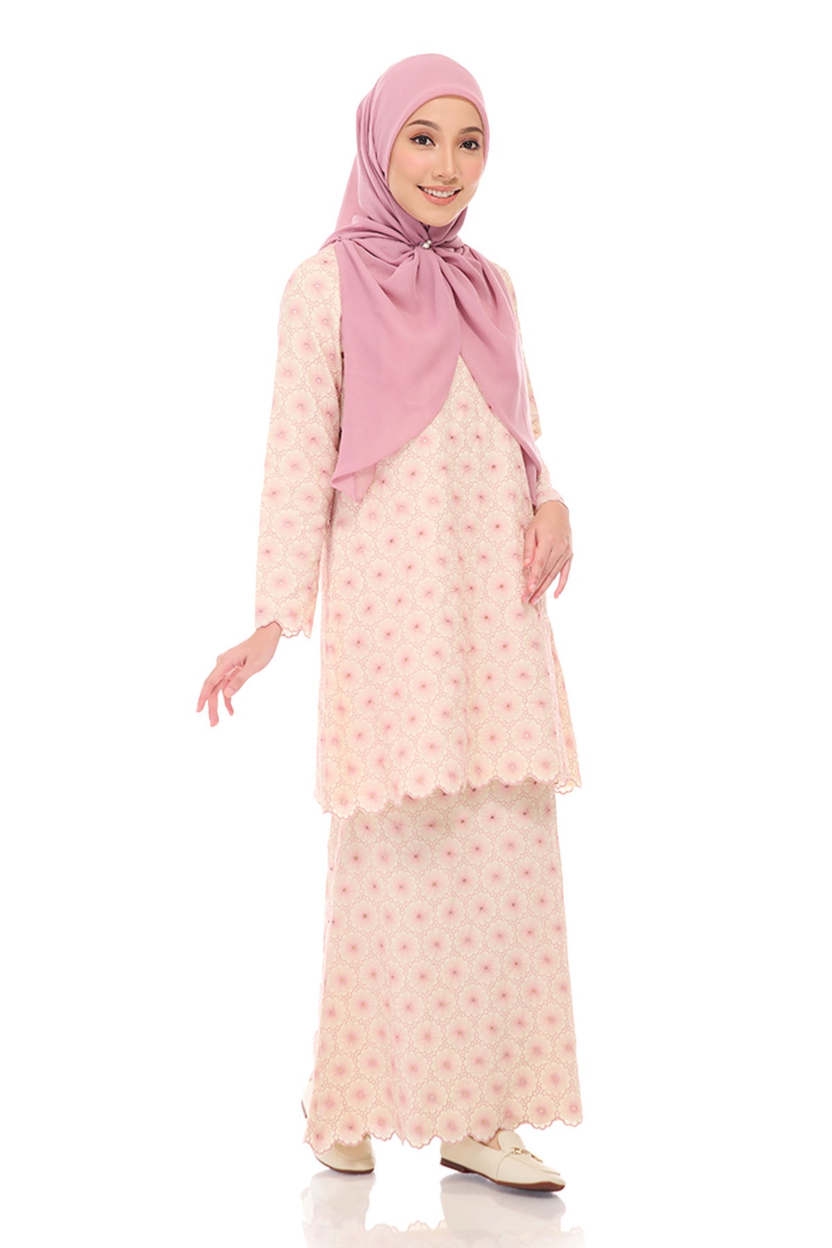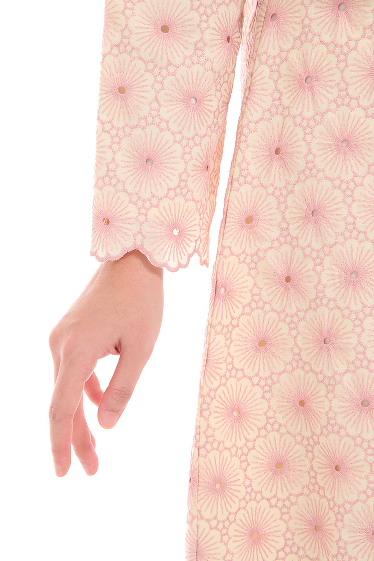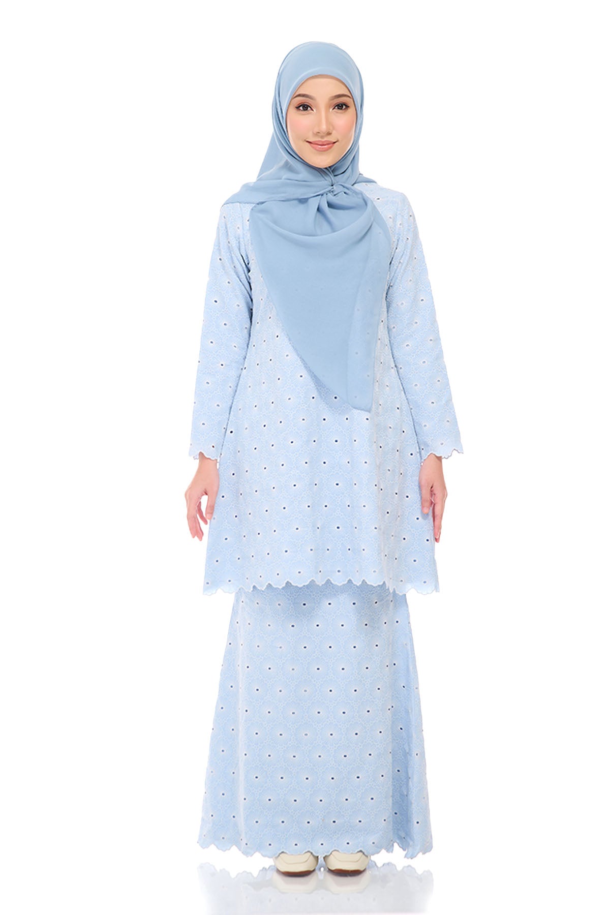 A modern kurung design featuring intricate daisy flower pattern embroidery throughout. Crafted from natural fabric, it offers excellent ventilation, softness, and hypoallergenic properties, perfect for all-day wear. With its loose cut and quick-drying features, it ensures comfort without trapping body heat, while the contrasting coloured thread highlights the floral pattern for a stylish touch.