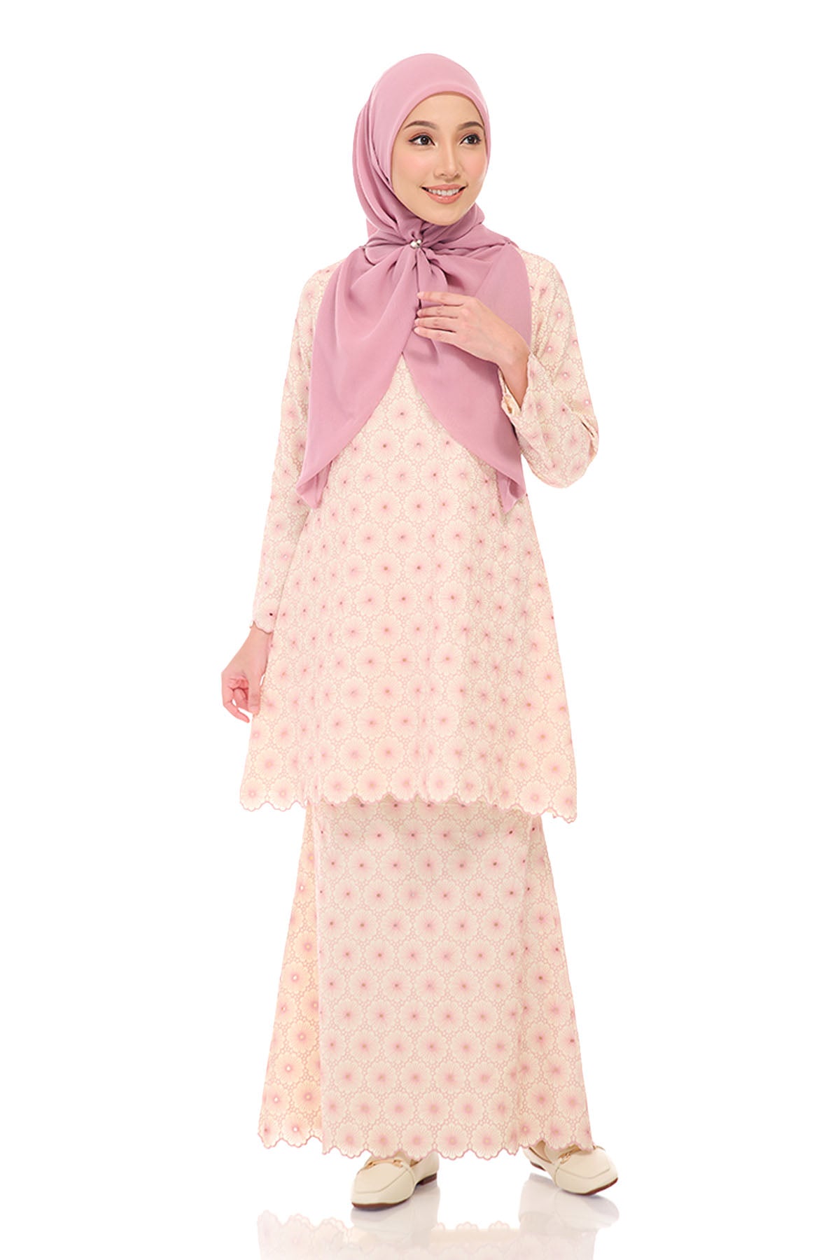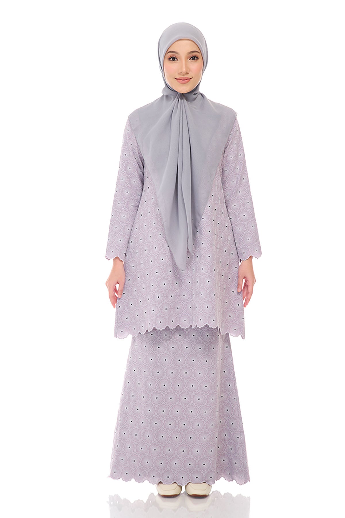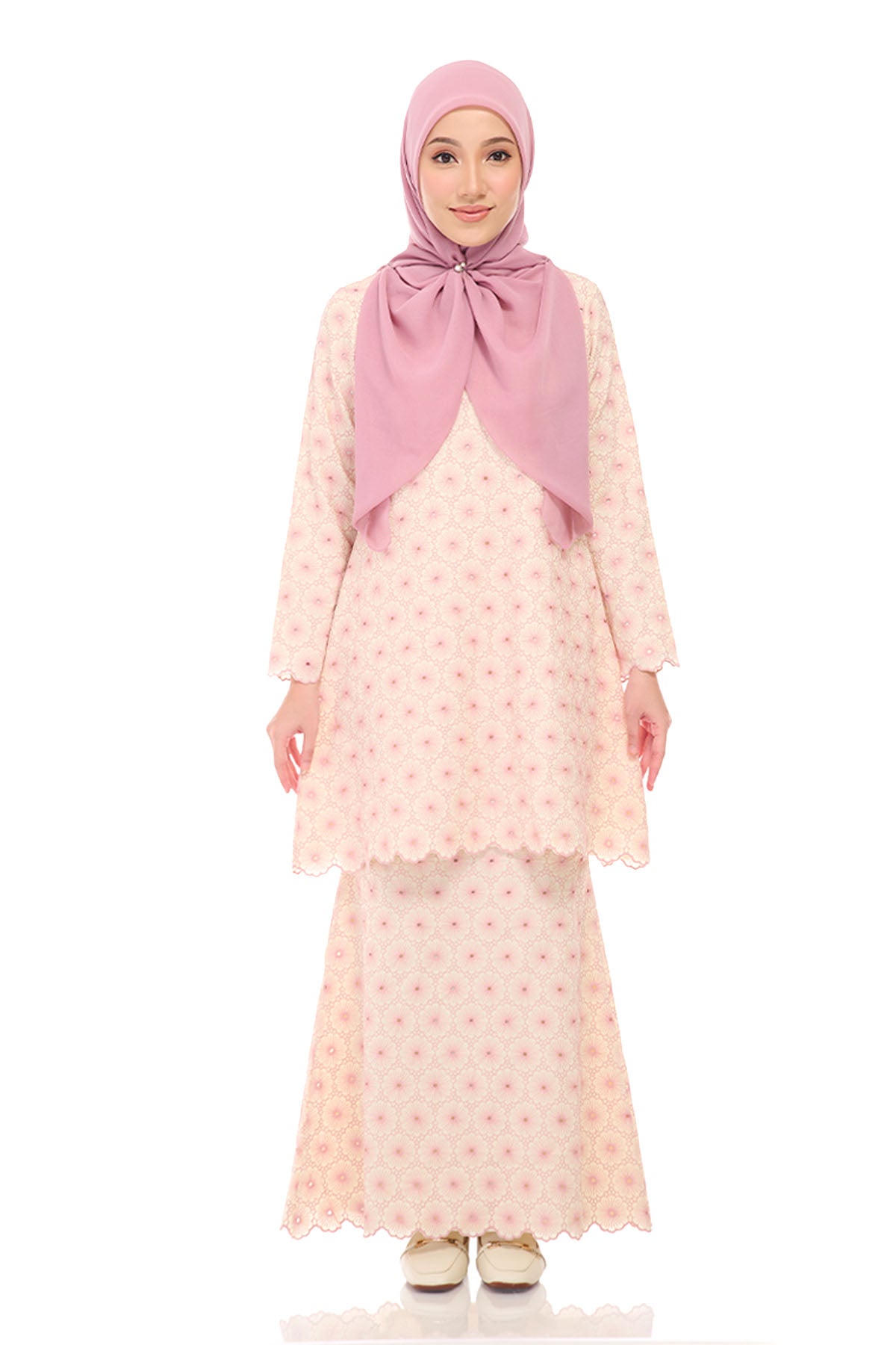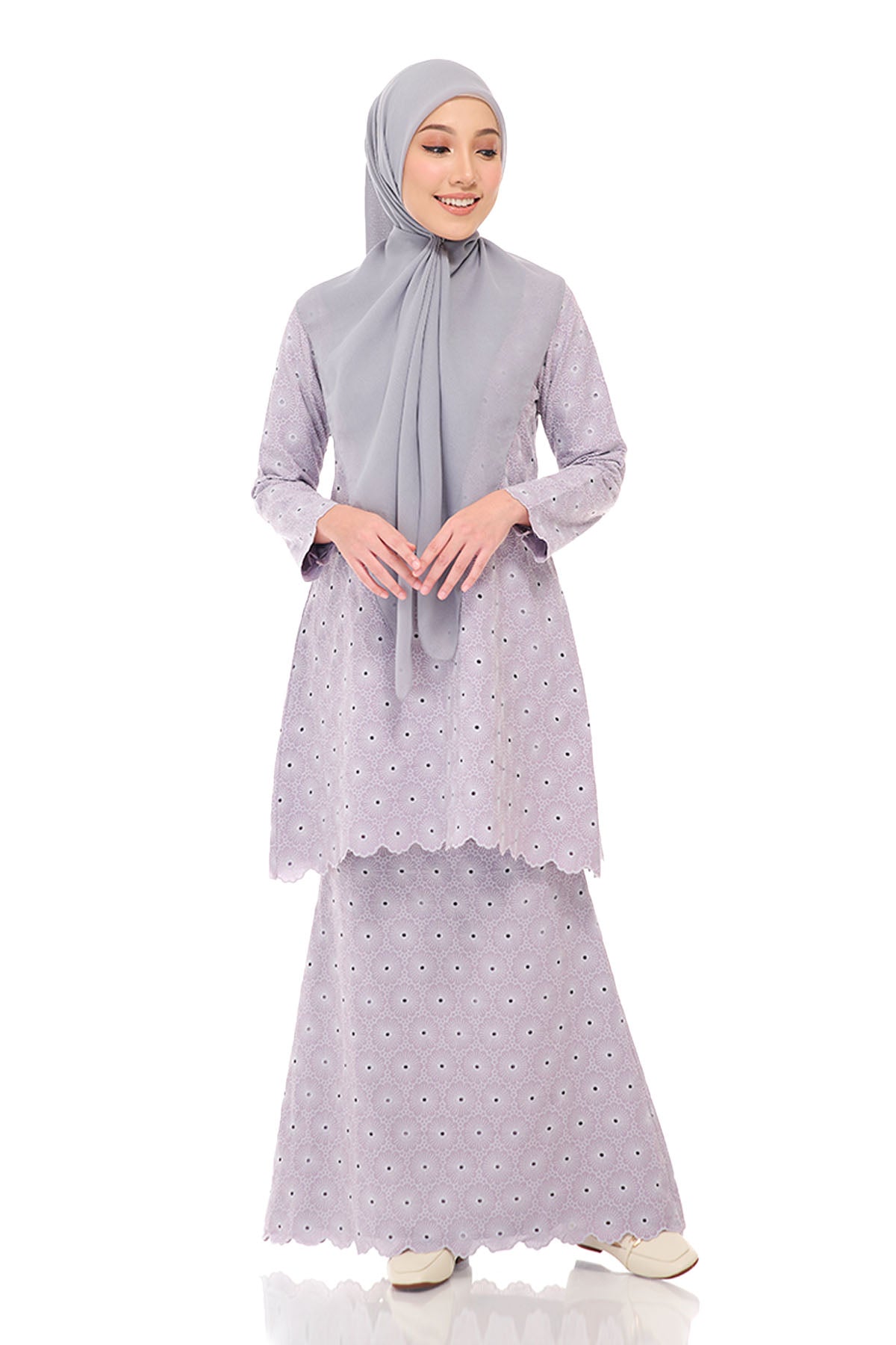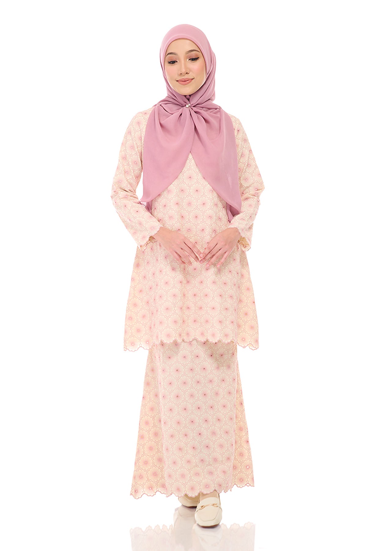 A modern kurung design featuring intricate daisy flower pattern embroidery throughout. Crafted from natural fabric, it offers excellent ventilation, softness, and hypoallergenic properties, perfect for all-day wear. With its loose cut and quick-drying features, it ensures comfort without trapping body heat, while the contrasting coloured thread highlights the floral pattern for a stylish touch.