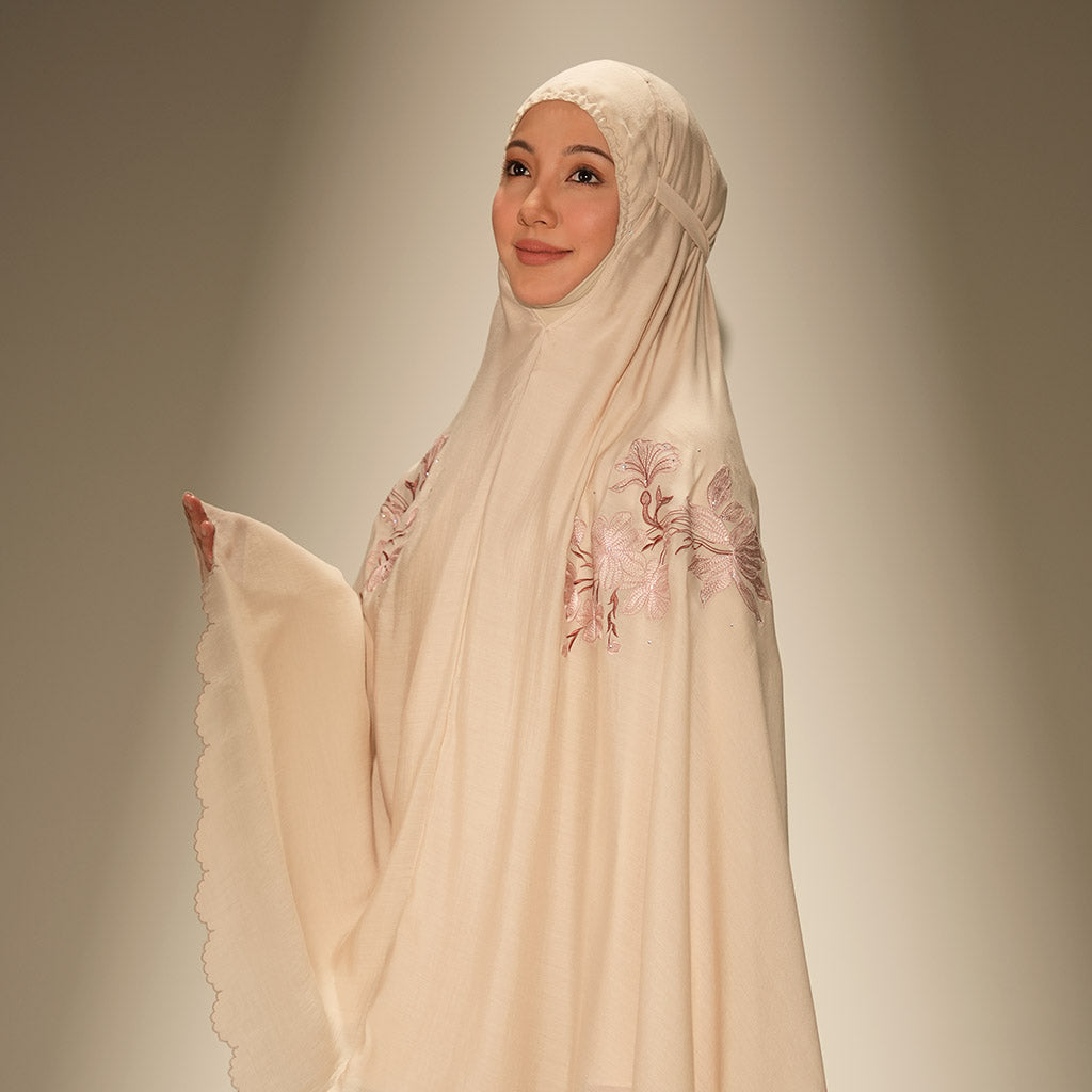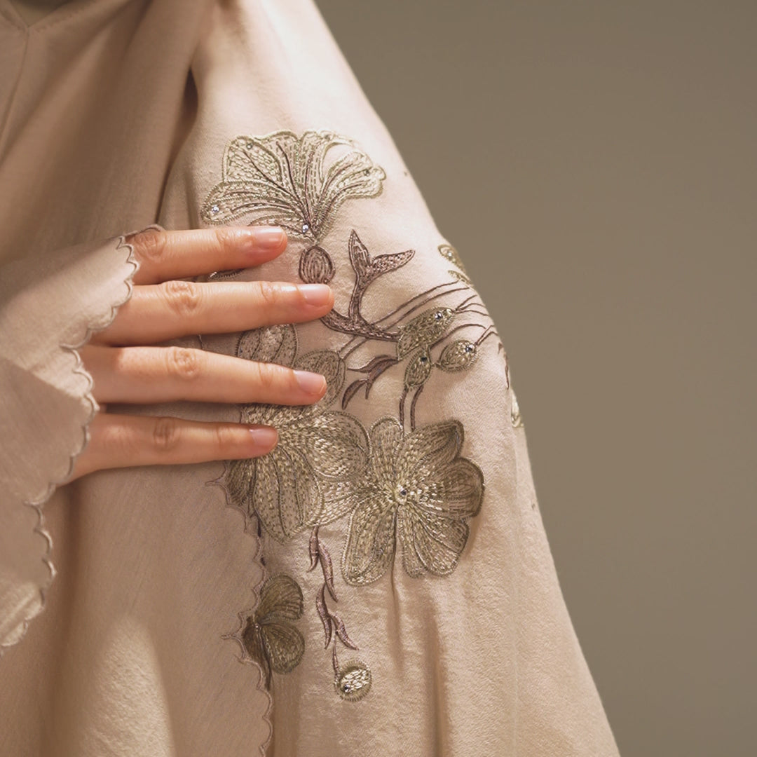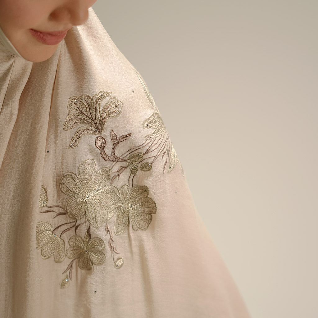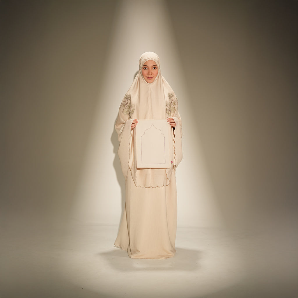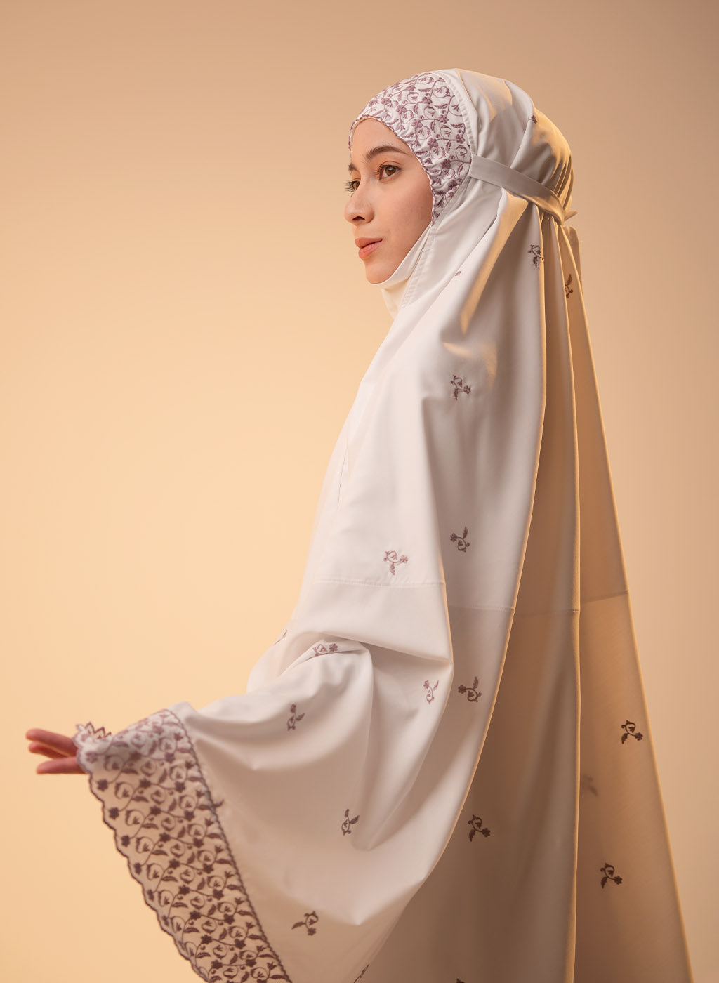 Beyond a telekung, Broderie Rania expresses modest elegance. The delicate embroidery, raised running-stitch petals, and crystal accents make it a prayerwear that radiates serenity, femininity, and sophistication.