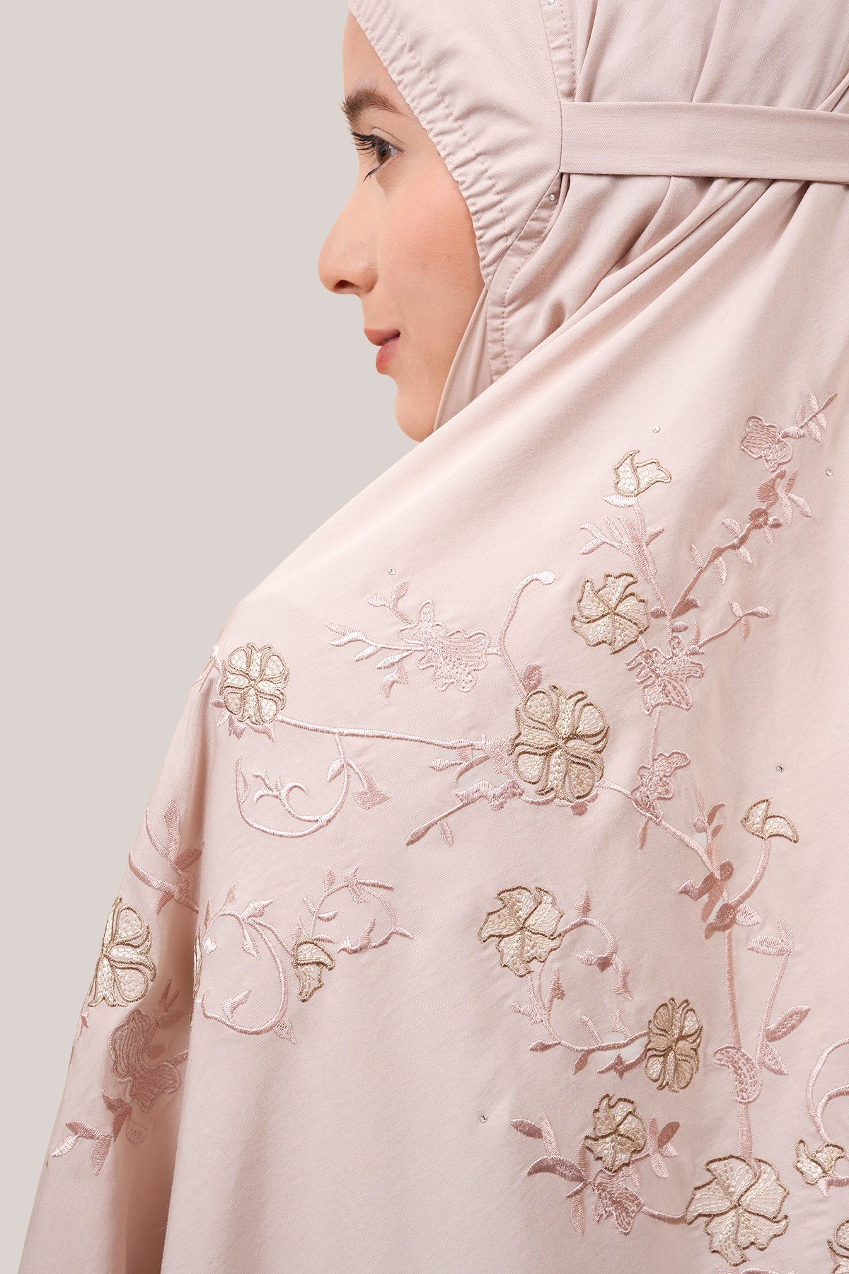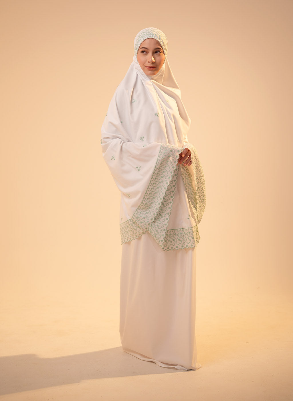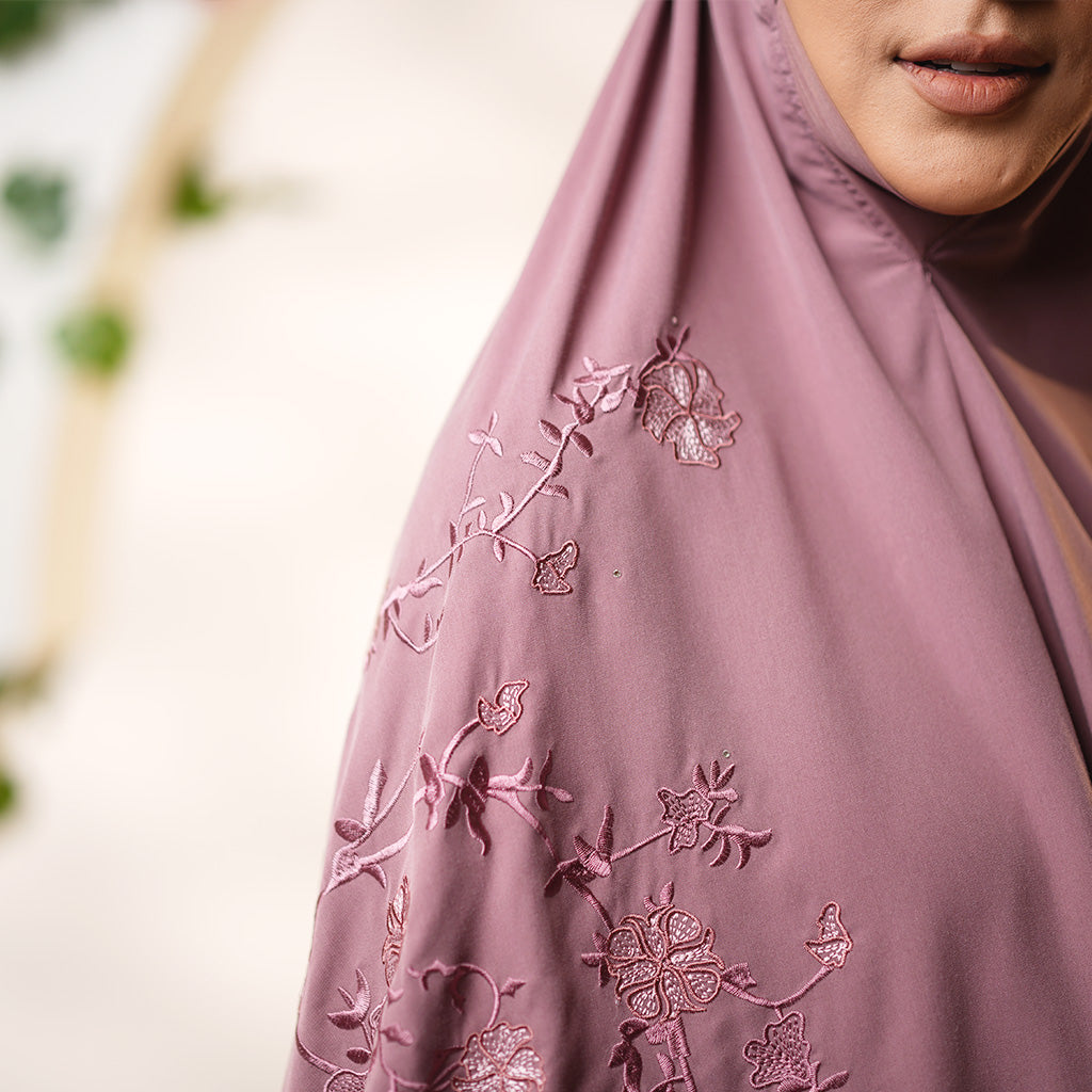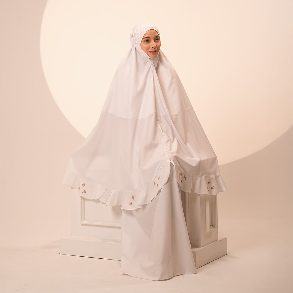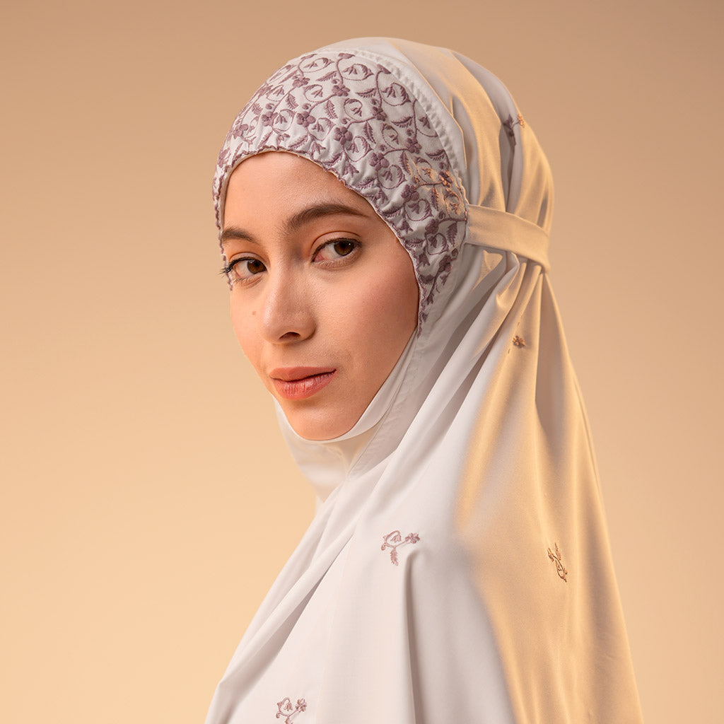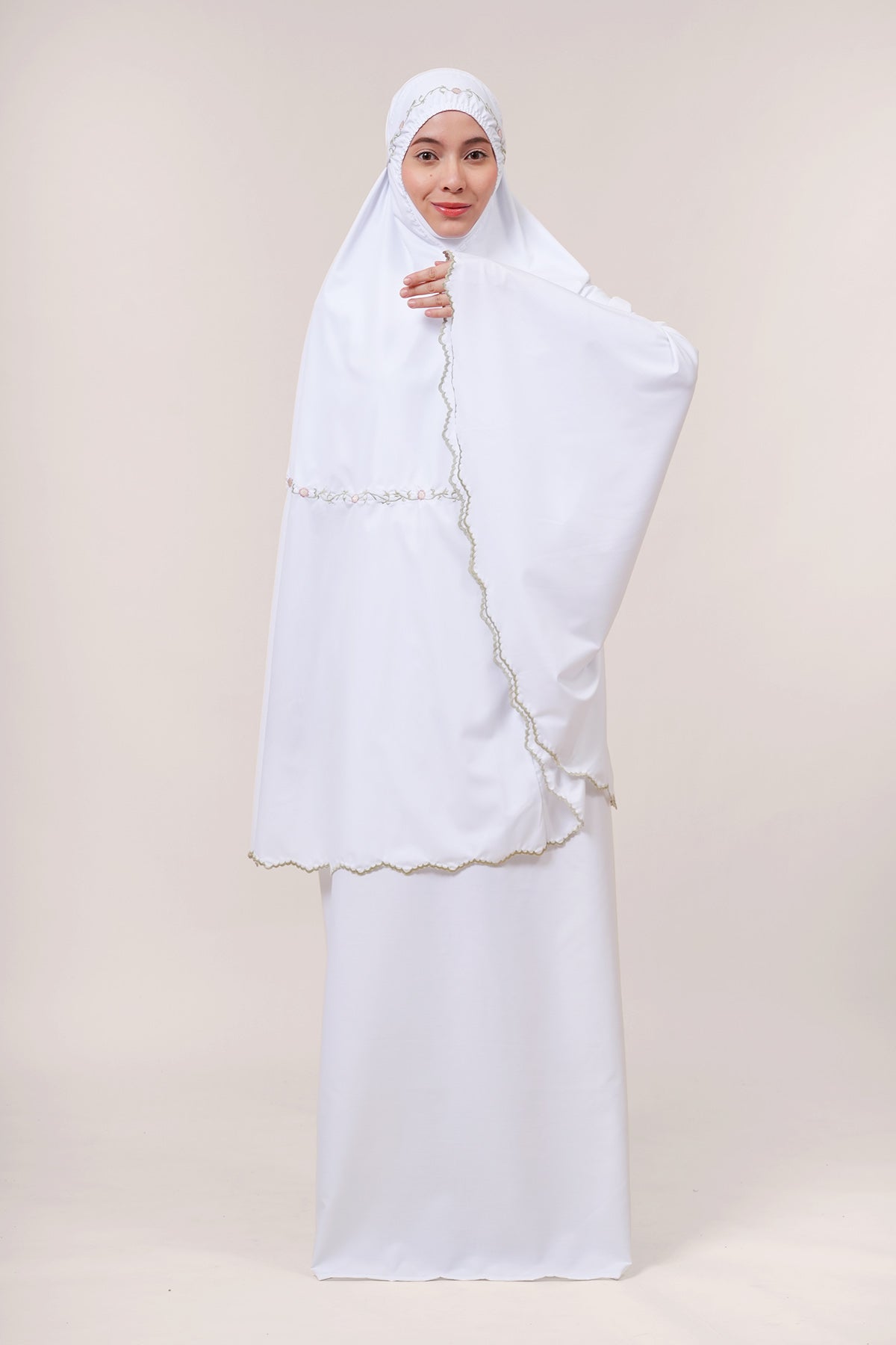 Beyond a telekung, Broderie Rania expresses modest elegance. The delicate embroidery, raised running-stitch petals, and crystal accents make it a prayerwear that radiates serenity, femininity, and sophistication.